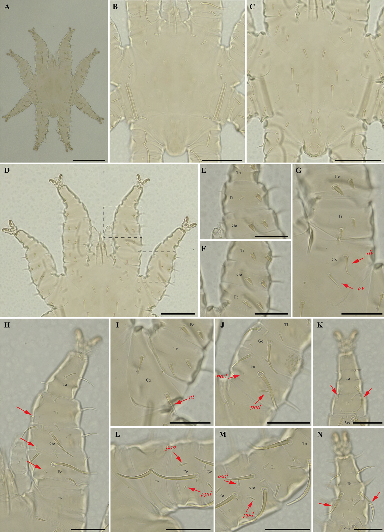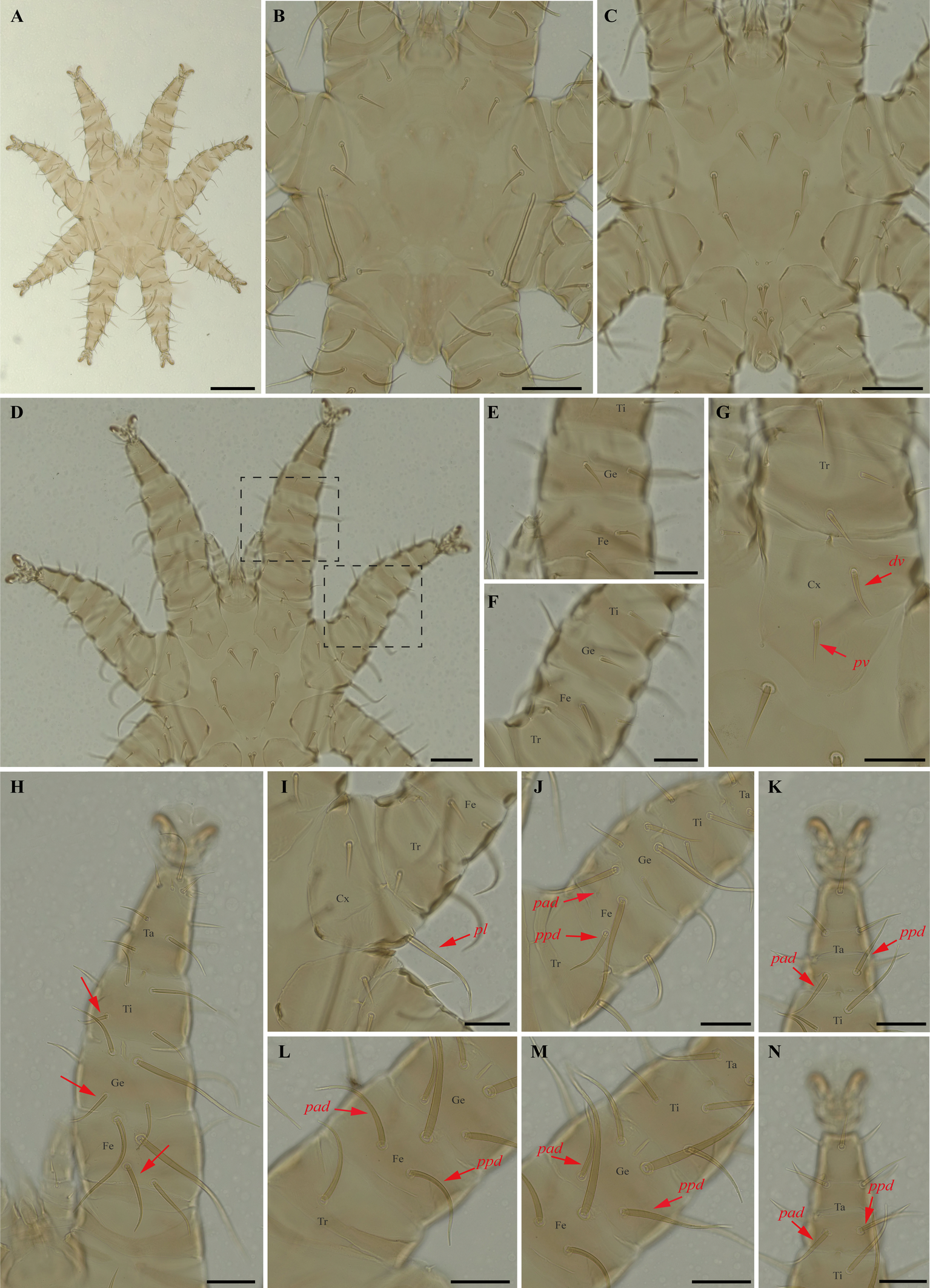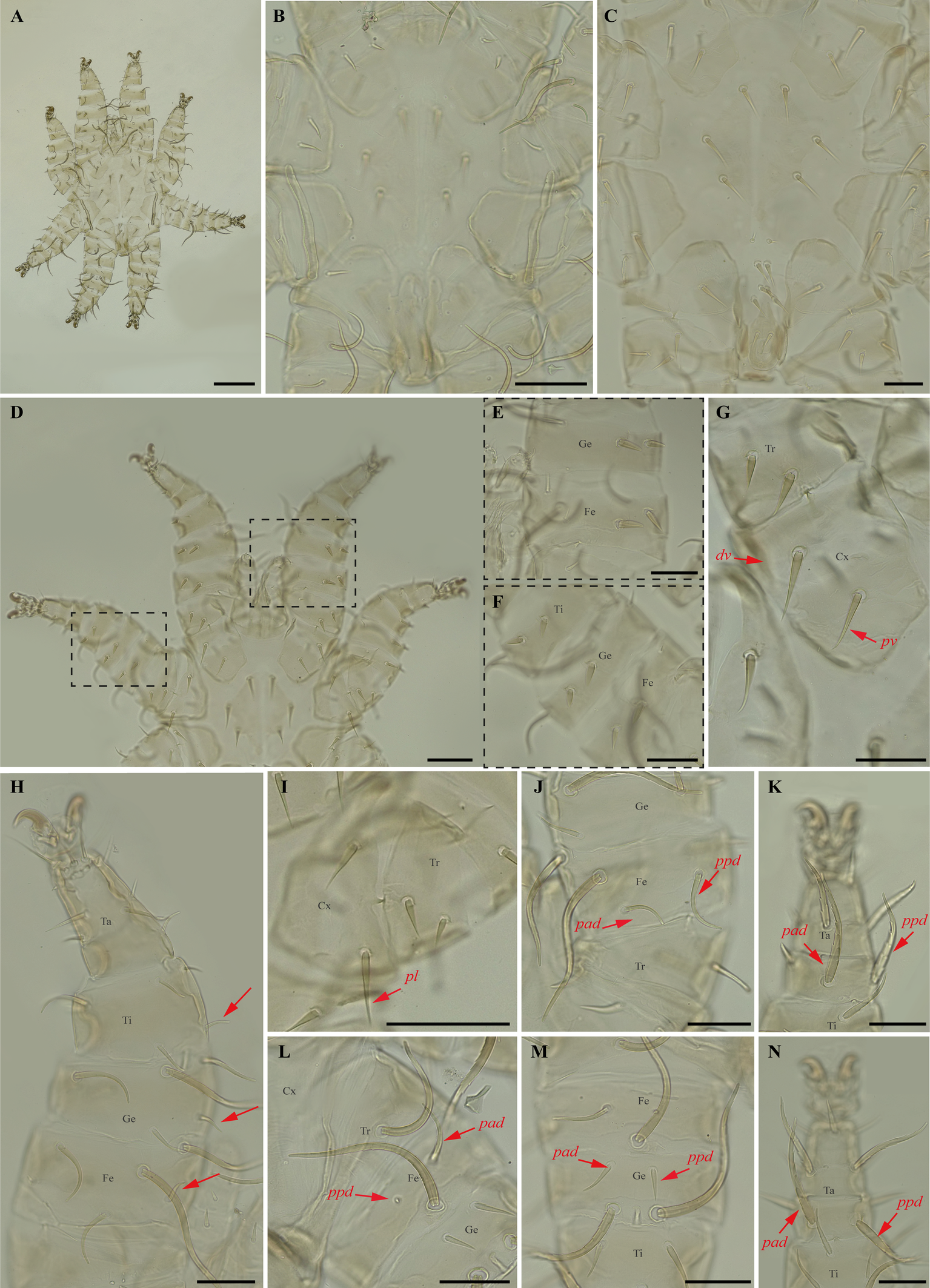 Nymphs (Figure 10A–N): similar to males with regard to above features, except by ontogenetic differences (Deunff et al. 2011). Deutonymph female has 13 pairs setae on intercoxal IV area, including adanal pair, and seven pairs of hysteronotal setae (one pair poststigmal setae and six pairs opisthosomal setae) and plus one unpaired seta on caudal dorsum. Deutonymph male has 10 pairs setae on intercoxal IV area, including adanal pair, and five pairs hysteronotal setae (one pair poststigmal setae and four pair opisthosomal setae) and plus one unpaired seta on caudal dorsum (similar to adult male). Protonymph has only two pairs hysteronotal setae (one pair poststigmal setae and one pair opisthosomal setae) and plus one unpaired seta on caudal dorsum.