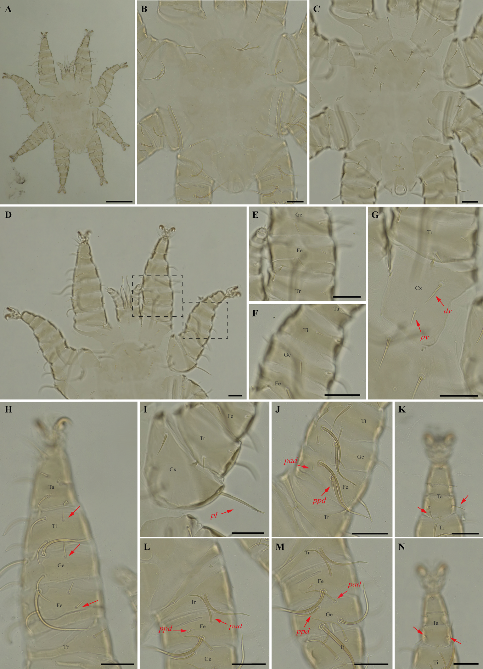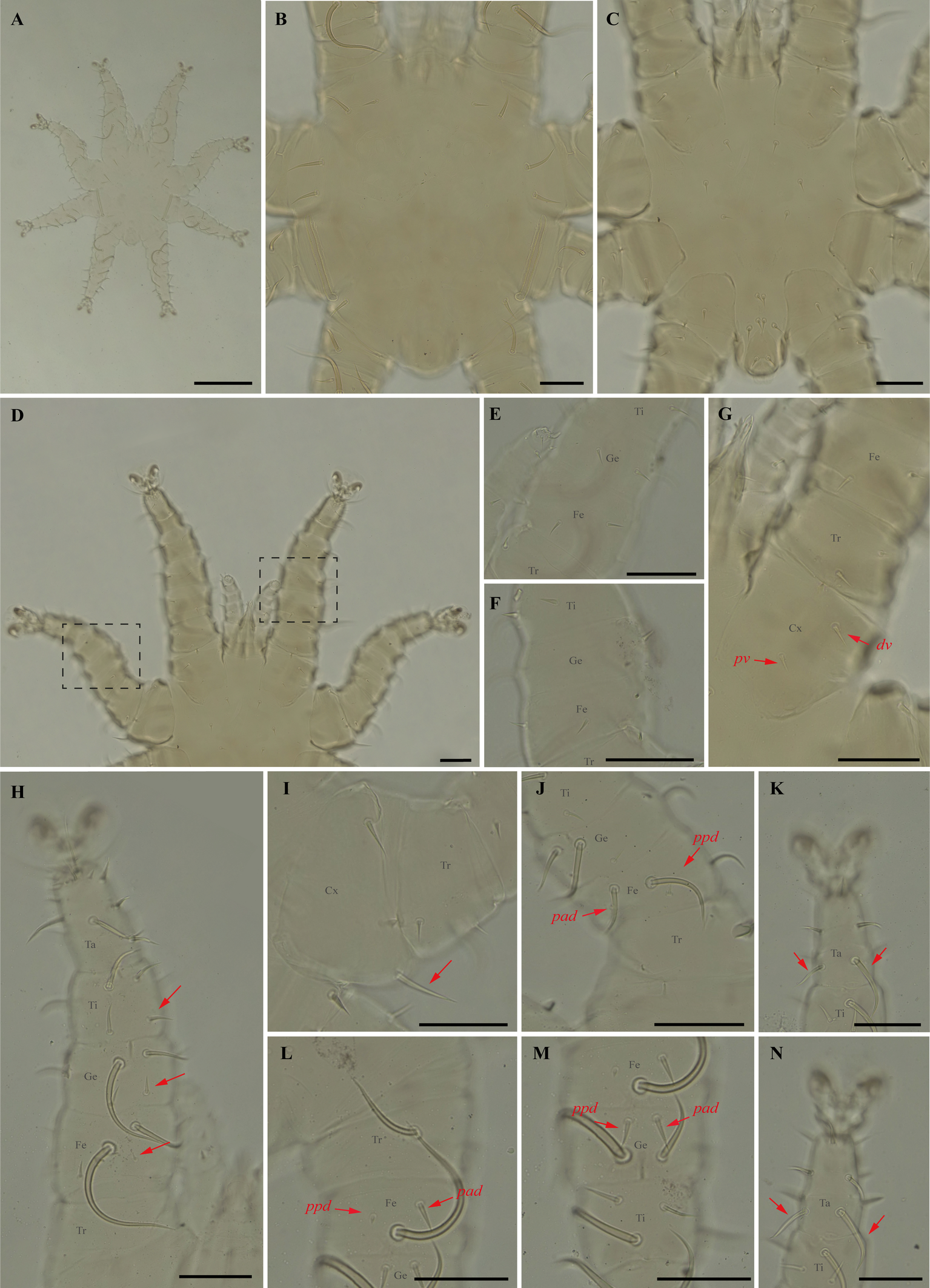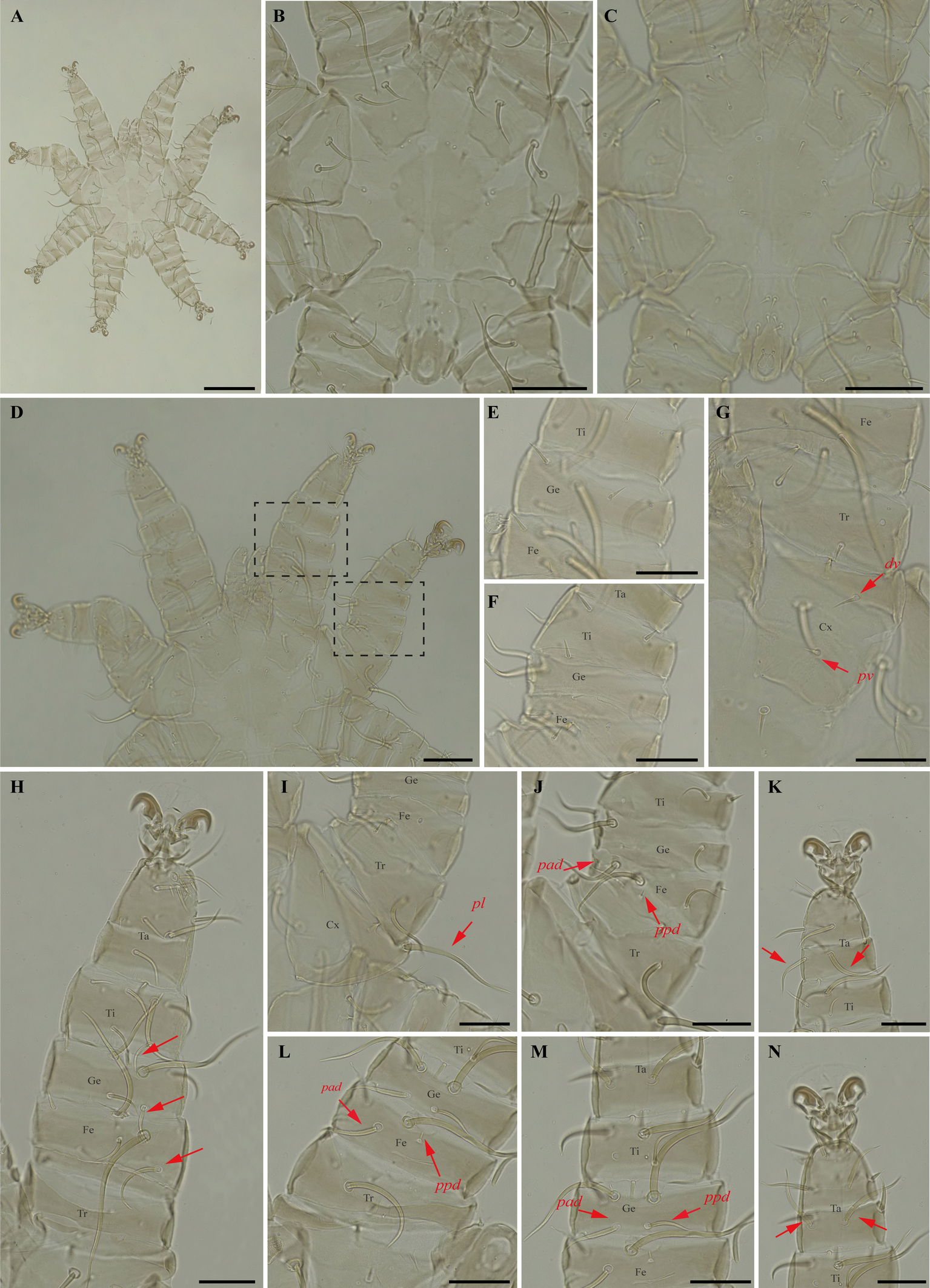 Nymphs (Figure 10A–N): similar to males with regard to above features, except by ontogenetic differences (Deunff et al. 2011). Deutonymph female has 13 pairs setae on intercoxal IV area, including adanal pair, and seven pairs of hysteronotal setae (one pair poststigmal setae and six pairs opisthosomal setae) and plus one unpaired seta on caudal dorsum. Deutonymph male has 10 pairs setae on intercoxal IV area, including adanal pair, and five pairs hysteronotal setae (one pair poststigmal setae and four pair opisthosomal setae) and plus one unpaired seta on caudal dorsum (similar to adult male). Protonymph has only two pairs hysteronotal setae (one pair poststigmal setae and one pair opisthosomal setae) and plus one unpaired seta on caudal dorsum.