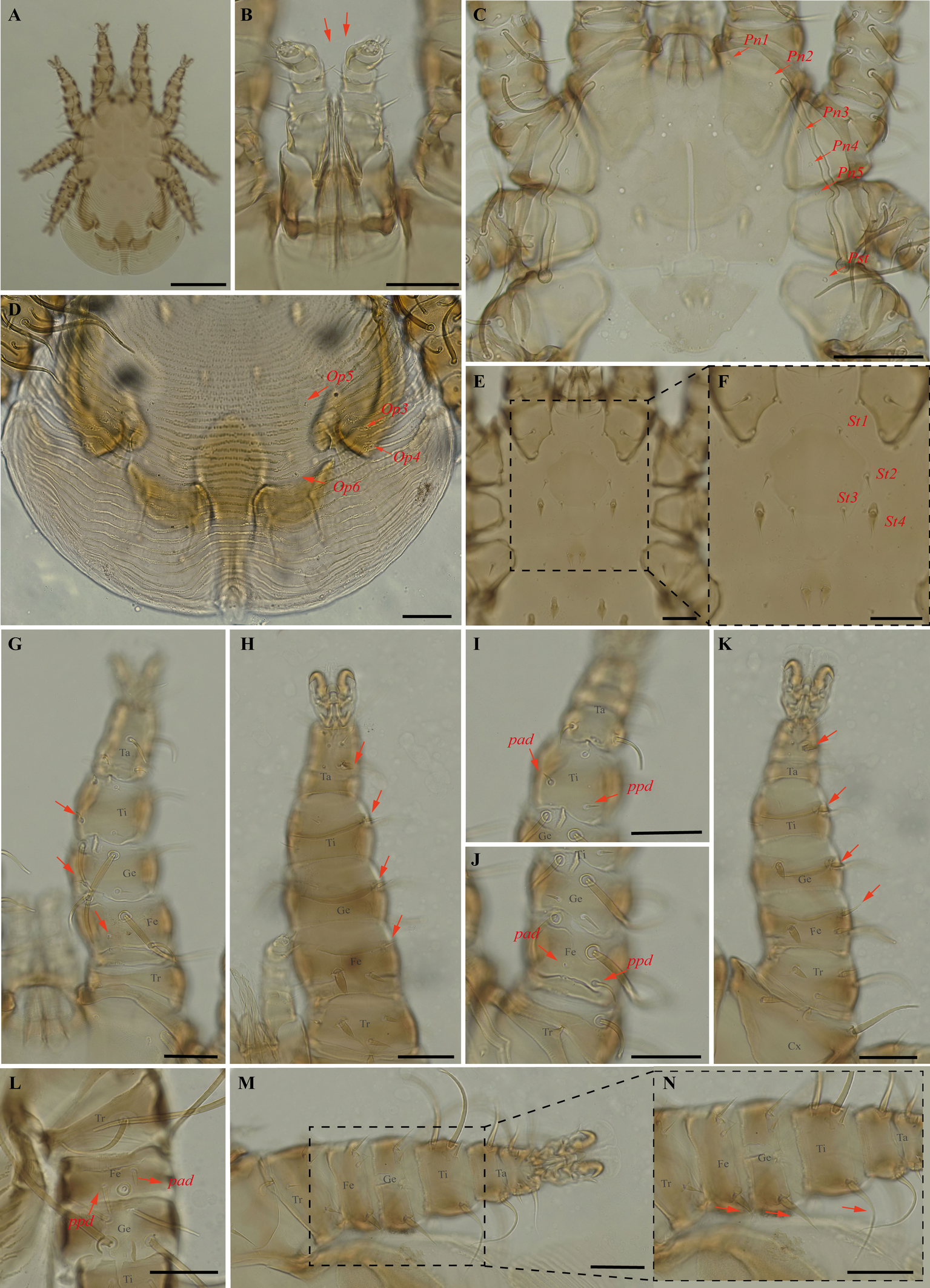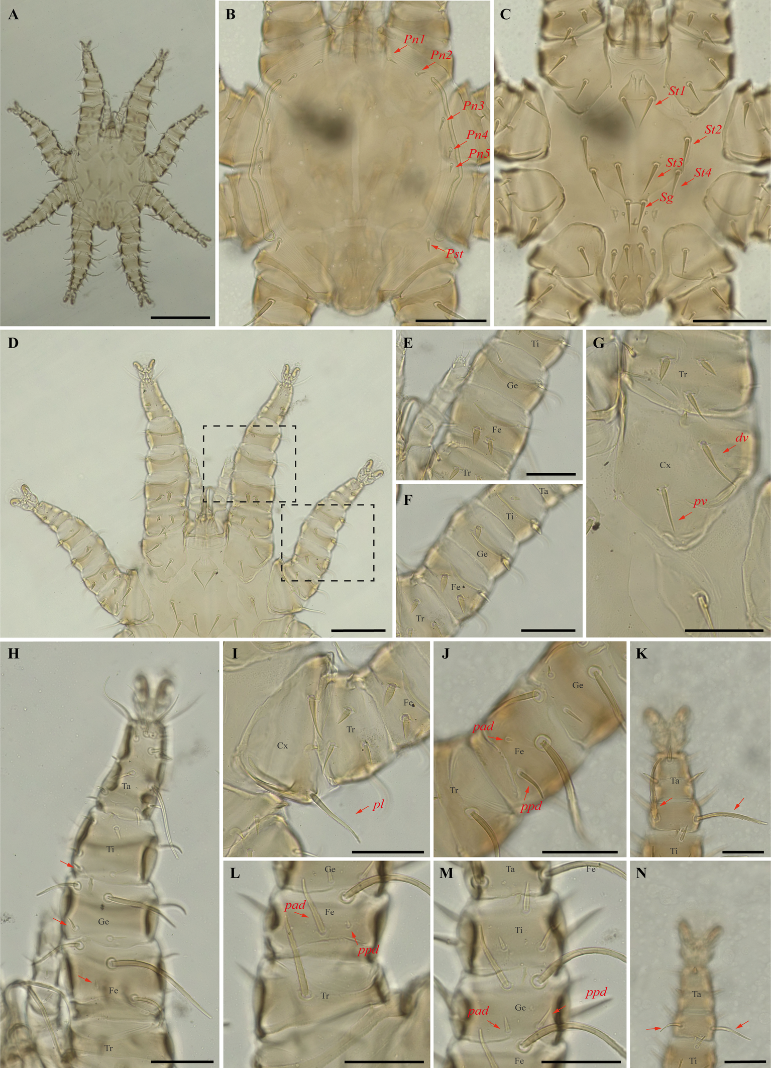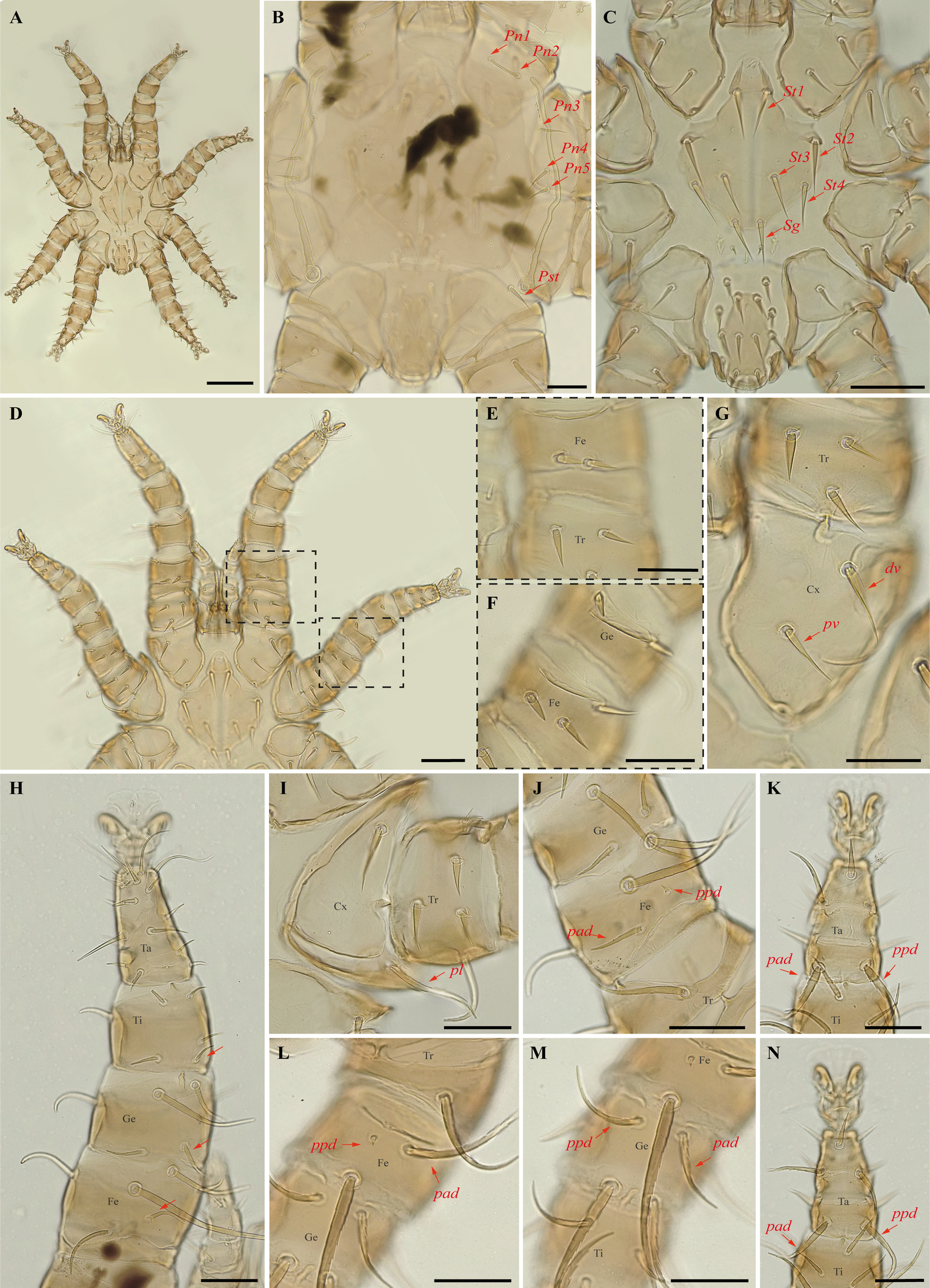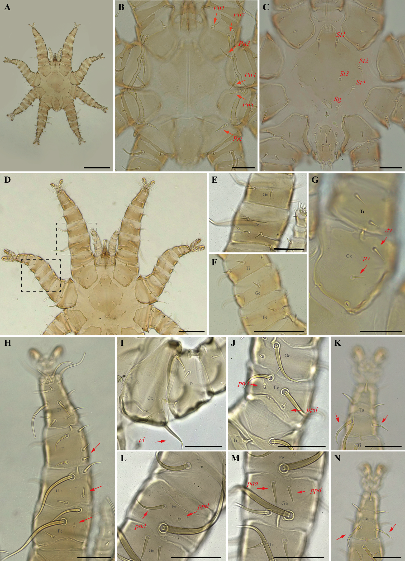 Differential diagnosis — Females: first pair of dorsal proteronotal setae minute and on the anterolateral margin of the dorsal plate, while the other proteronotal setae large and off the plate (Figure 11C); sternal plate pear shaped (Figure 11E–F); proximal anterodorsal seta of femur II minute and proximal posterodorsal seta of femur II medium sized (Figure 11J); posteroventral (pv) seta of femur-tibia IV straight and bladelike (Figure 11M–N). Male: intercoxa IV area with eight pairs of setae, first pair of setae posterior to sternal plate short to minute; sternogenital setae long, first pair extending to or beyond level of second pair of setae (Figure 12C); proximal antero- and posterodorsal setae of femur IV long, subequal in length (Figure 12L) (Herrin and Tipton 1975). Nymphs: similar to males with regard to above features, except by ontogenetic differences (Deunff et al. 2011) (Figure 13A–N). Deutonymph female has 13 pairs setae on intercoxal IV area, including adanal pair, and five pairs of hysteronotal setae (one pair poststigmal setae and four pairs opisthosomal setae) and plus one unpaired seta on caudal dorsum. Deutonymph male has eight pairs setae on intercoxal IV area, including adanal pair, two pairs hysteronotal setae (one pair poststigmal setae and one pair opisthosomal setae) and plus one unpaired seta on caudal dorsum (similar to adult male). Protonymph has pairs of hysteronotal setae and caudal dorsum similar to deutonymph male.
