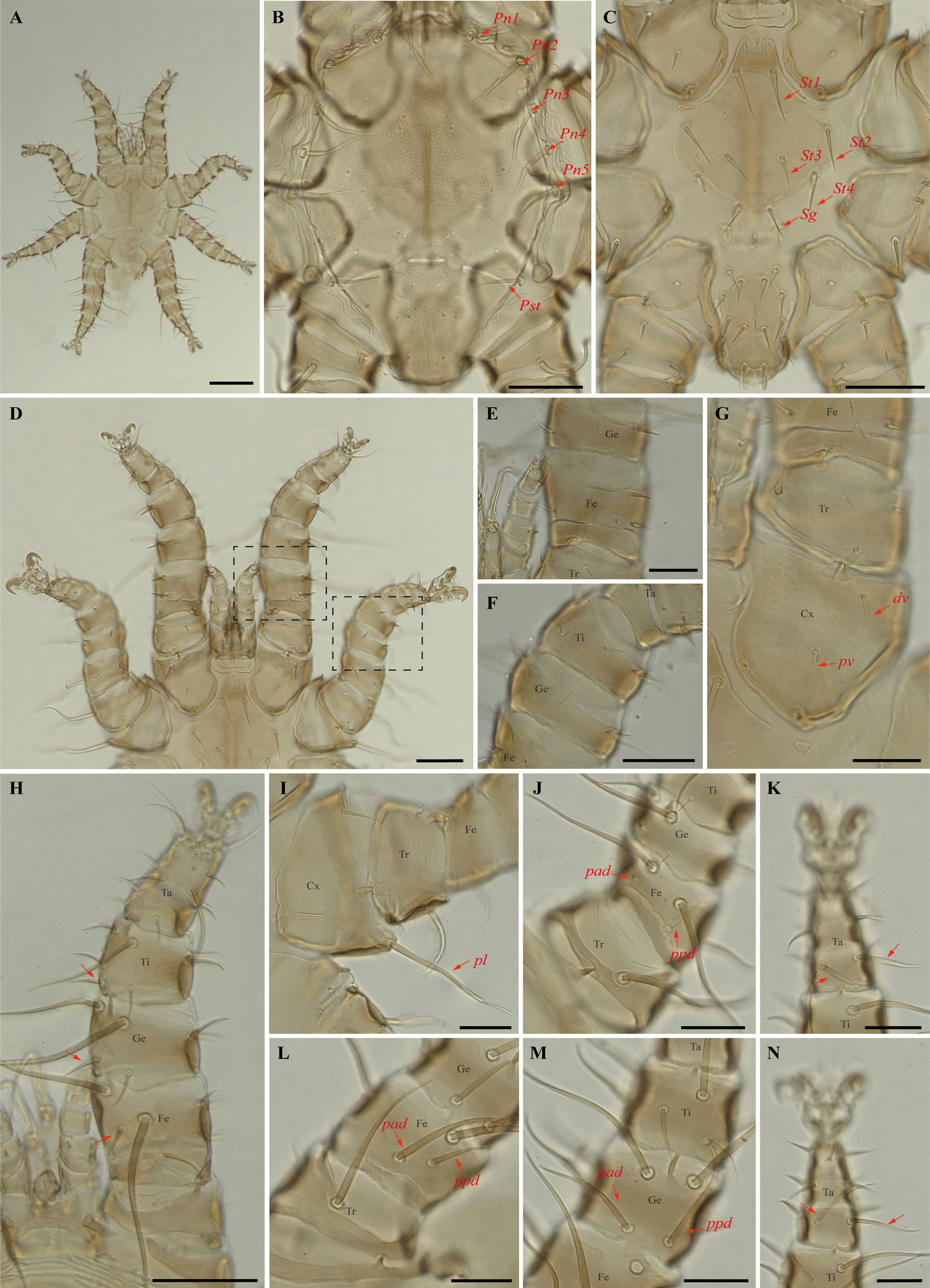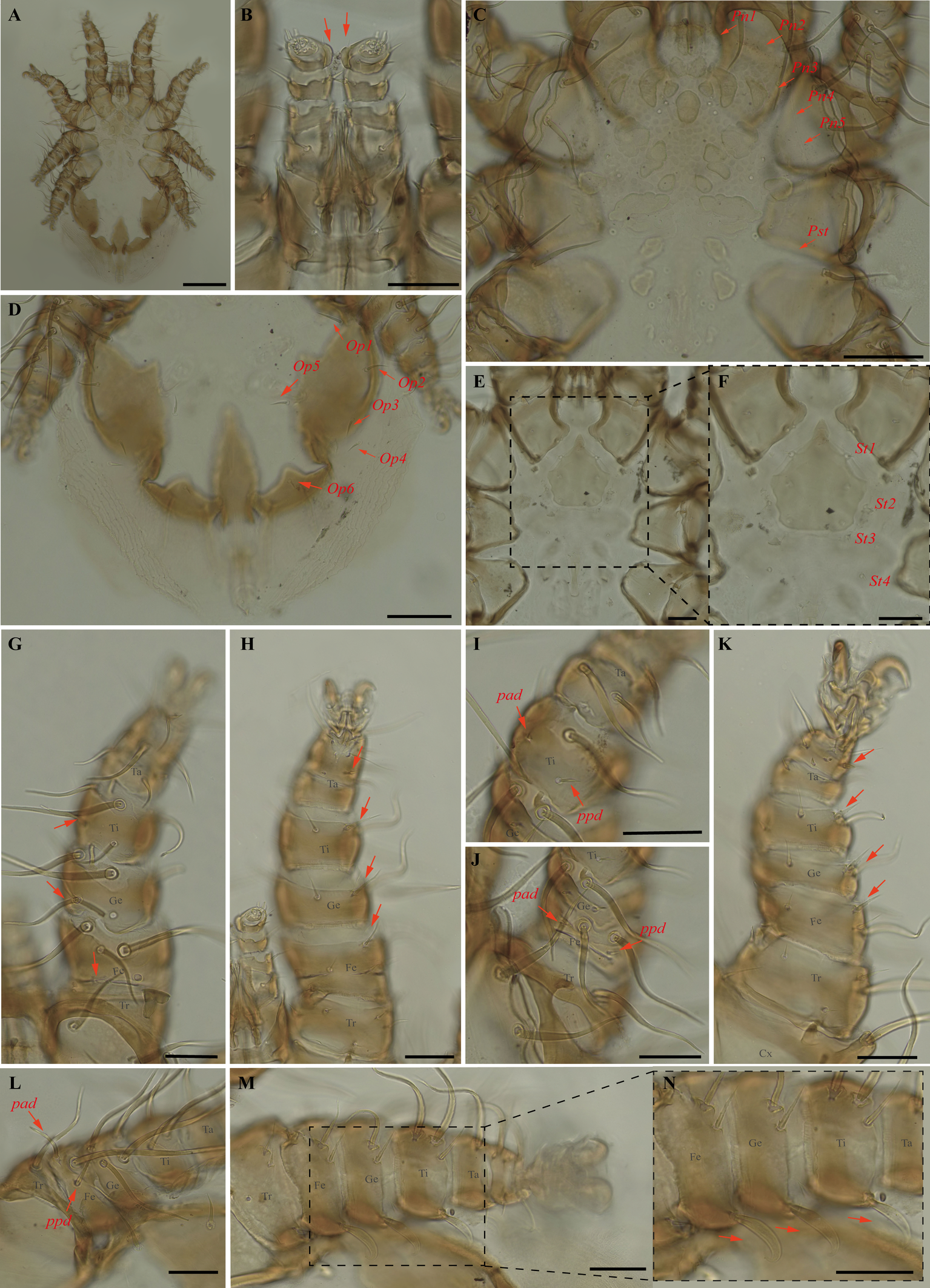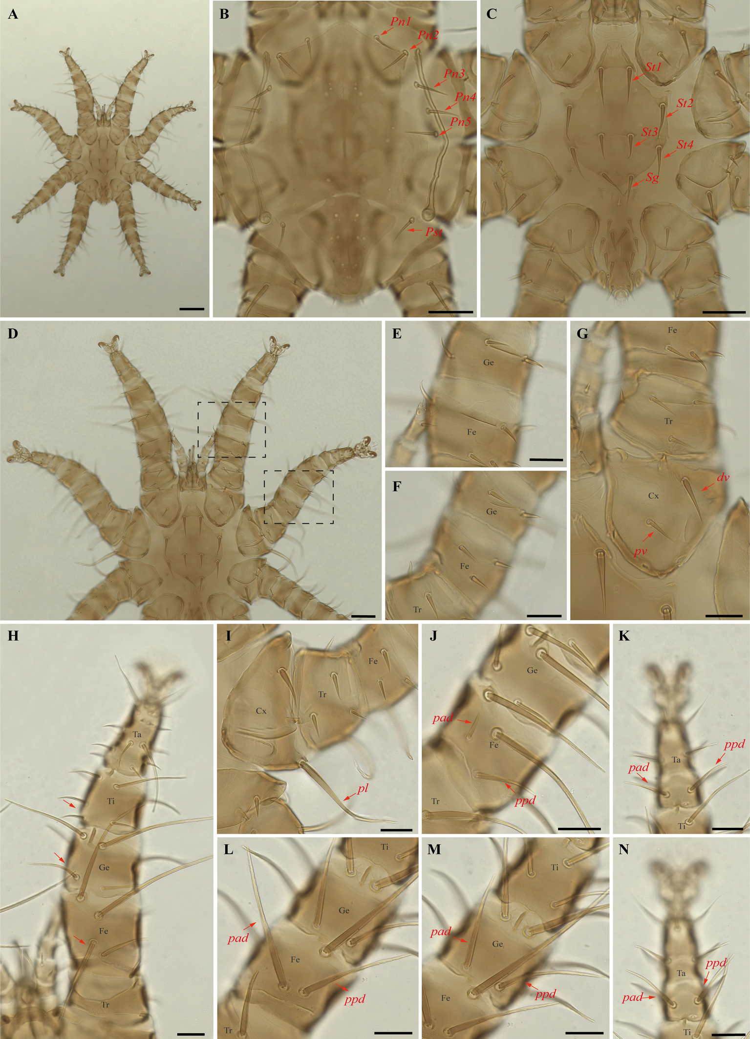 Differential diagnosis — Females: first pair of dorsal proteronotal setae minute and on the anterolateral margin of the dorsal plate, while the other proteronotal setae large and off the plate (Figure 11C); sternal plate pear shaped (Figure 11E–F); proximal anterodorsal seta of femur II minute and proximal posterodorsal seta of femur II medium sized (Figure 11J); posteroventral (pv) seta of femur-tibia IV straight and bladelike (Figure 11M–N). Male: intercoxa IV area with eight pairs of setae, first pair of setae posterior to sternal plate short to minute; sternogenital setae long, first pair extending to or beyond level of second pair of setae (Figure 12C); proximal antero- and posterodorsal setae of femur IV long, subequal in length (Figure 12L) (Herrin and Tipton 1975). Nymphs: similar to males with regard to above features, except by ontogenetic differences (Deunff et al. 2011) (Figure 13A–N). Deutonymph female has 13 pairs setae on intercoxal IV area, including adanal pair, and five pairs of hysteronotal setae (one pair poststigmal setae and four pairs opisthosomal setae) and plus one unpaired seta on caudal dorsum. Deutonymph male has eight pairs setae on intercoxal IV area, including adanal pair, two pairs hysteronotal setae (one pair poststigmal setae and one pair opisthosomal setae) and plus one unpaired seta on caudal dorsum (similar to adult male). Protonymph has pairs of hysteronotal setae and caudal dorsum similar to deutonymph male.