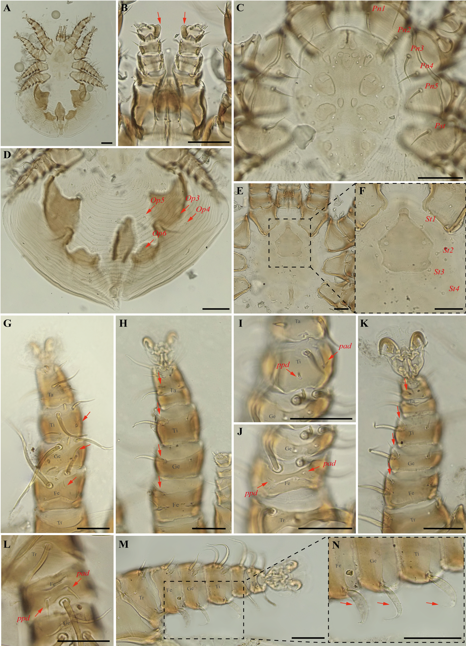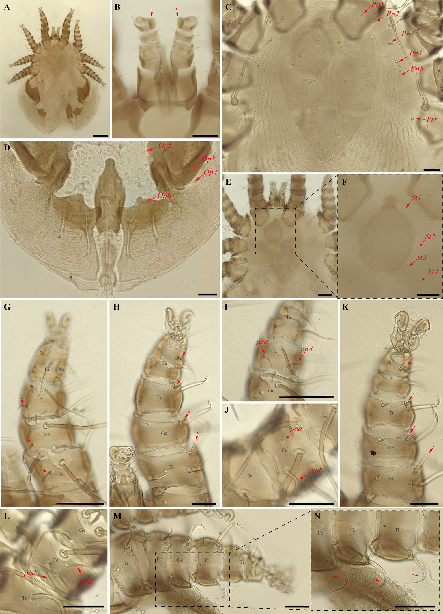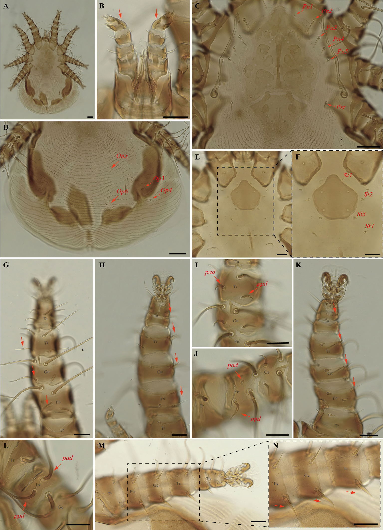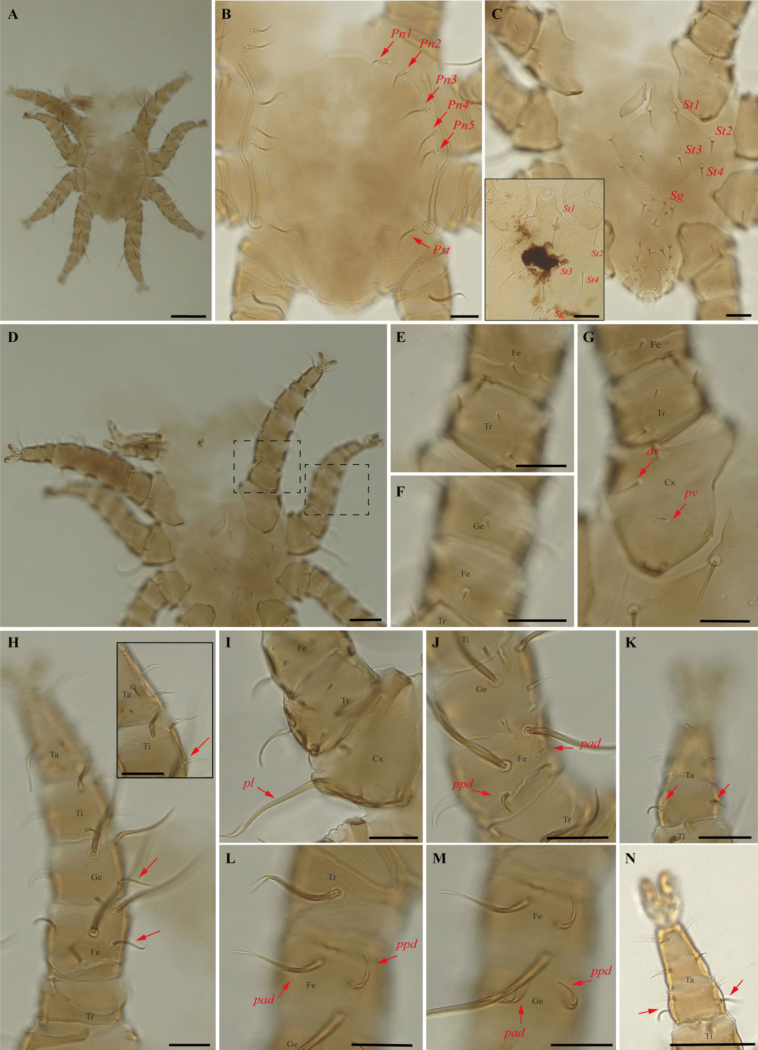 Differential diagnosis — Females: first pair of dorsal proteronotal setae minute and on the anterolateral margin of the dorsal plate, while the other proteronotal setae large and off the plate (Figure 11C); sternal plate pear shaped (Figure 11E–F); proximal anterodorsal seta of femur II minute and proximal posterodorsal seta of femur II medium sized (Figure 11J); posteroventral (pv) seta of femur-tibia IV straight and bladelike (Figure 11M–N). Male: intercoxa IV area with eight pairs of setae, first pair of setae posterior to sternal plate short to minute; sternogenital setae long, first pair extending to or beyond level of second pair of setae (Figure 12C); proximal antero- and posterodorsal setae of femur IV long, subequal in length (Figure 12L) (Herrin and Tipton 1975). Nymphs: similar to males with regard to above features, except by ontogenetic differences (Deunff et al. 2011) (Figure 13A–N). Deutonymph female has 13 pairs setae on intercoxal IV area, including adanal pair, and five pairs of hysteronotal setae (one pair poststigmal setae and four pairs opisthosomal setae) and plus one unpaired seta on caudal dorsum. Deutonymph male has eight pairs setae on intercoxal IV area, including adanal pair, two pairs hysteronotal setae (one pair poststigmal setae and one pair opisthosomal setae) and plus one unpaired seta on caudal dorsum (similar to adult male). Protonymph has pairs of hysteronotal setae and caudal dorsum similar to deutonymph male.