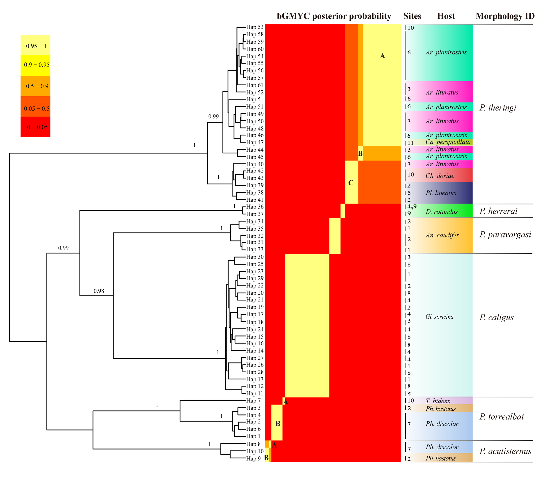 On other hand, the posterior probability of including all mites identified morphologically as P. iheringi in a single species is less than 50%, suggesting P. iheringi as a species complex. Interesting, when we turn to hosts: P. iheringi A was found on Artibeus planirostris Artibeus lituratus and Carollia perspicillata; P. iheringi B was found on Artibeus planirostris and Art. lituratus; and P. iheringi C was found on Art. lituratus, Platyrrhinus lineatus and Chiroderma doriae. Hence, all clades of P. iheringi were found on Artibeus lituratus.