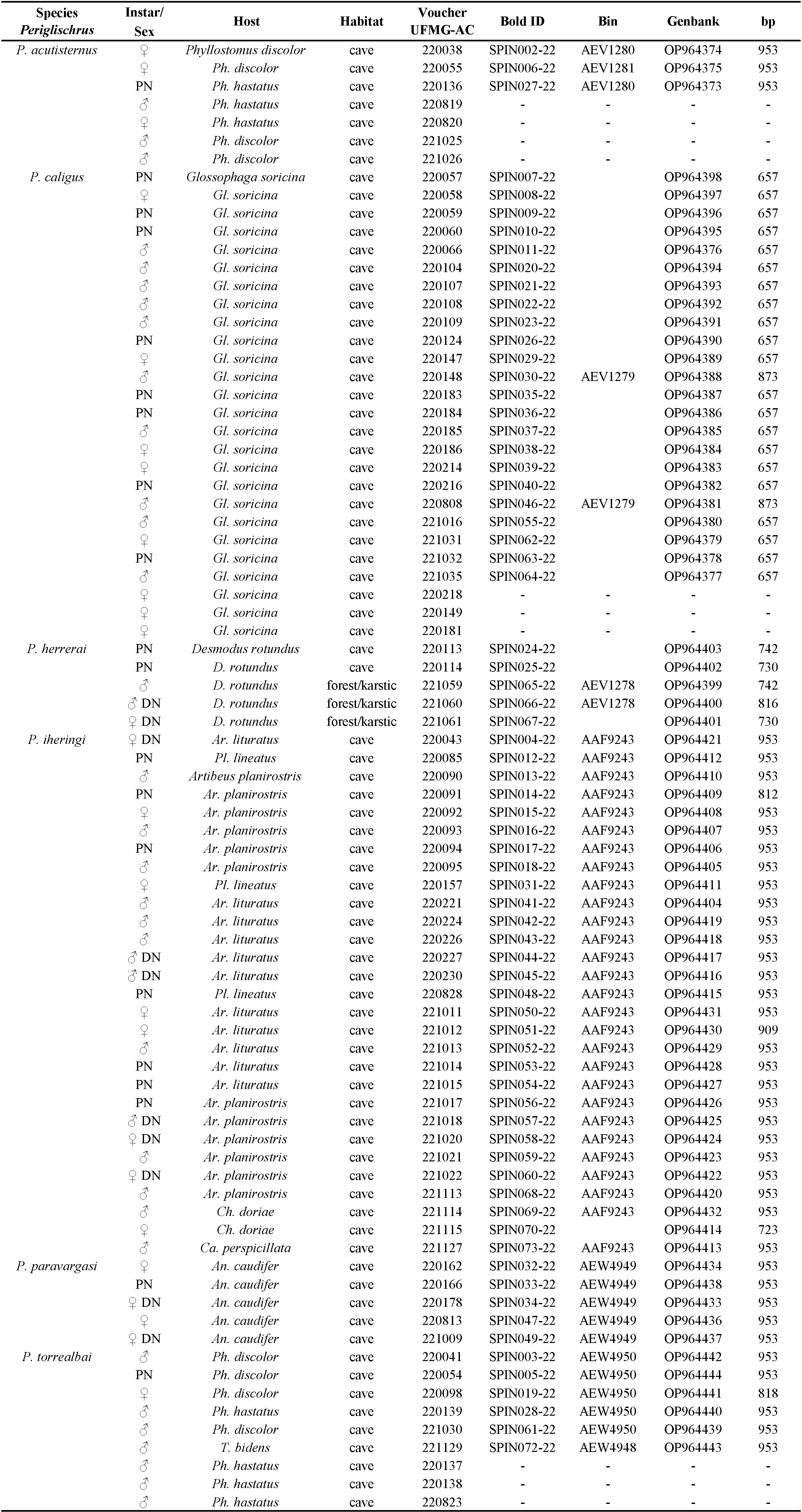 We examined a total of 81 specimens, consisting of males, females and nymphs from Minas Gerais state, Brazil. Of these, seventy-one individuals of Periglischrus had the cytochrome c oxidase subunit I (COI) gene successfully sequenced. Collection Numbers, BOLD IDs, BOLD Bin, instar/sex, host details, locality, coordinates and GenBank accession numbers are provided in Table 1. Localities are summarized in the map at Figure 1.