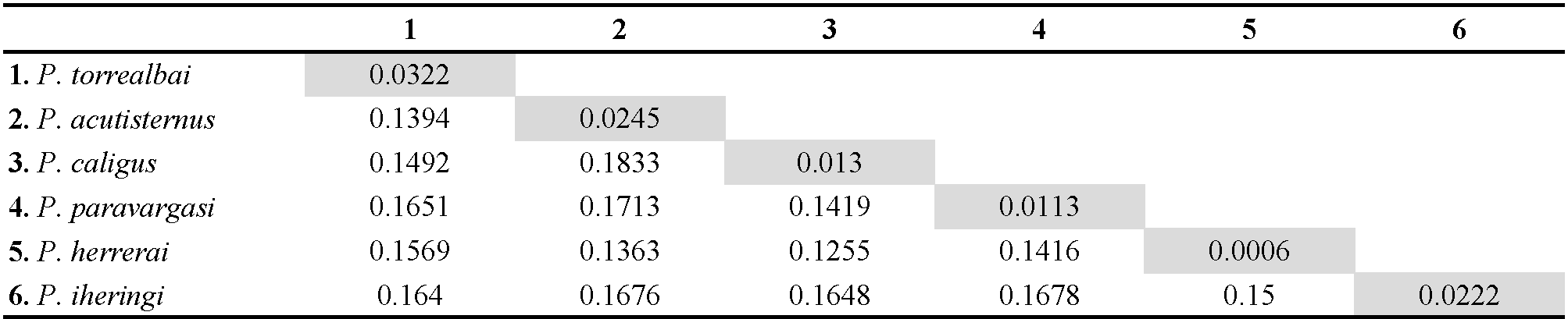 Species clustering and delimitation by BINs, ASAP and bGMYC yielded distinct but partially consistent results. For ASAP analysis identified a barcode gap and supported the six species, matching the morphological identification, while BINs supported eight species, as it subdivided P. acutisternus and P. torrealbai. In contrast, bGMYC identified at least 10 putative species, as it subdivided P. acutisternus and P. torrealbai into two species each (concordant with BINs), and further subdivided P. iheringi into three species.