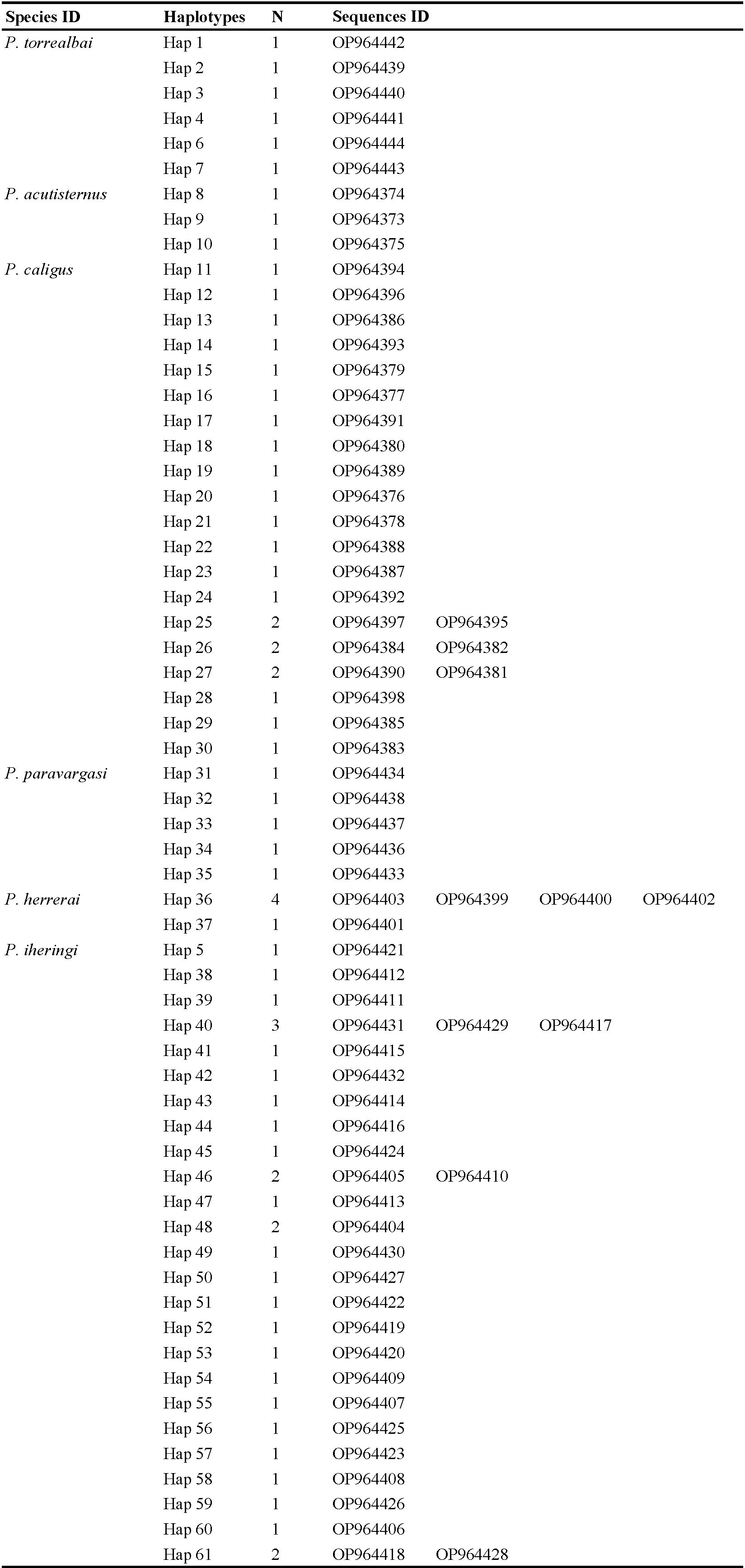 In our bGMYC species delimitation analyses (Figure 2), 25 haplotypes (5, 38 to 61) out of 29 sequences from individuals morphologically assigned to P. iheringi were recovered split into three well supported species (pp \textgreater95%). The first putative species hereinafter referred to as P. iheringi A includes haplotypes 5, 46 to 61 and the second, as P. iheringi B, includes haplotypes 44 to 45 and third, as P. iheringi C includes haplotypes 38 to 45.