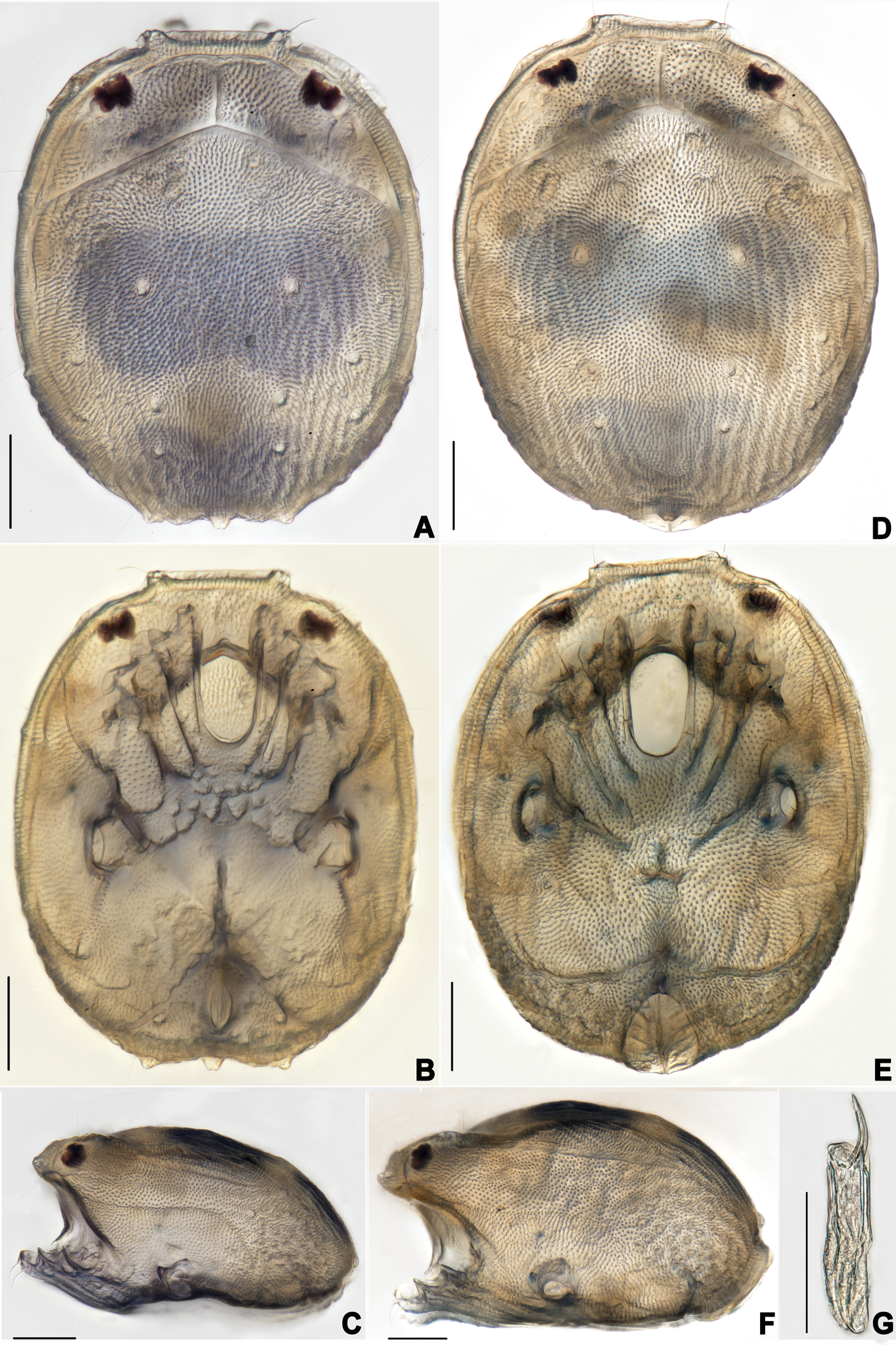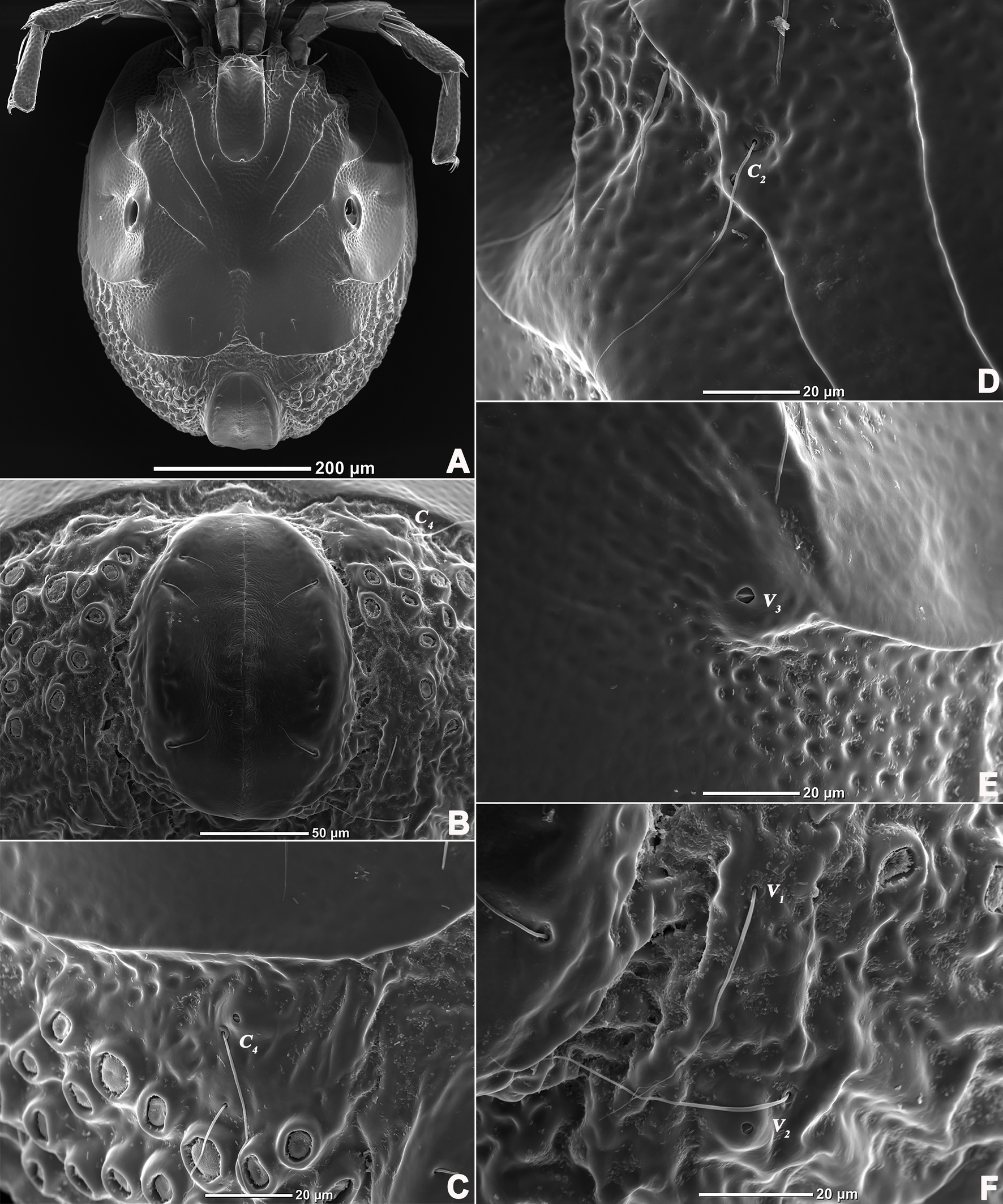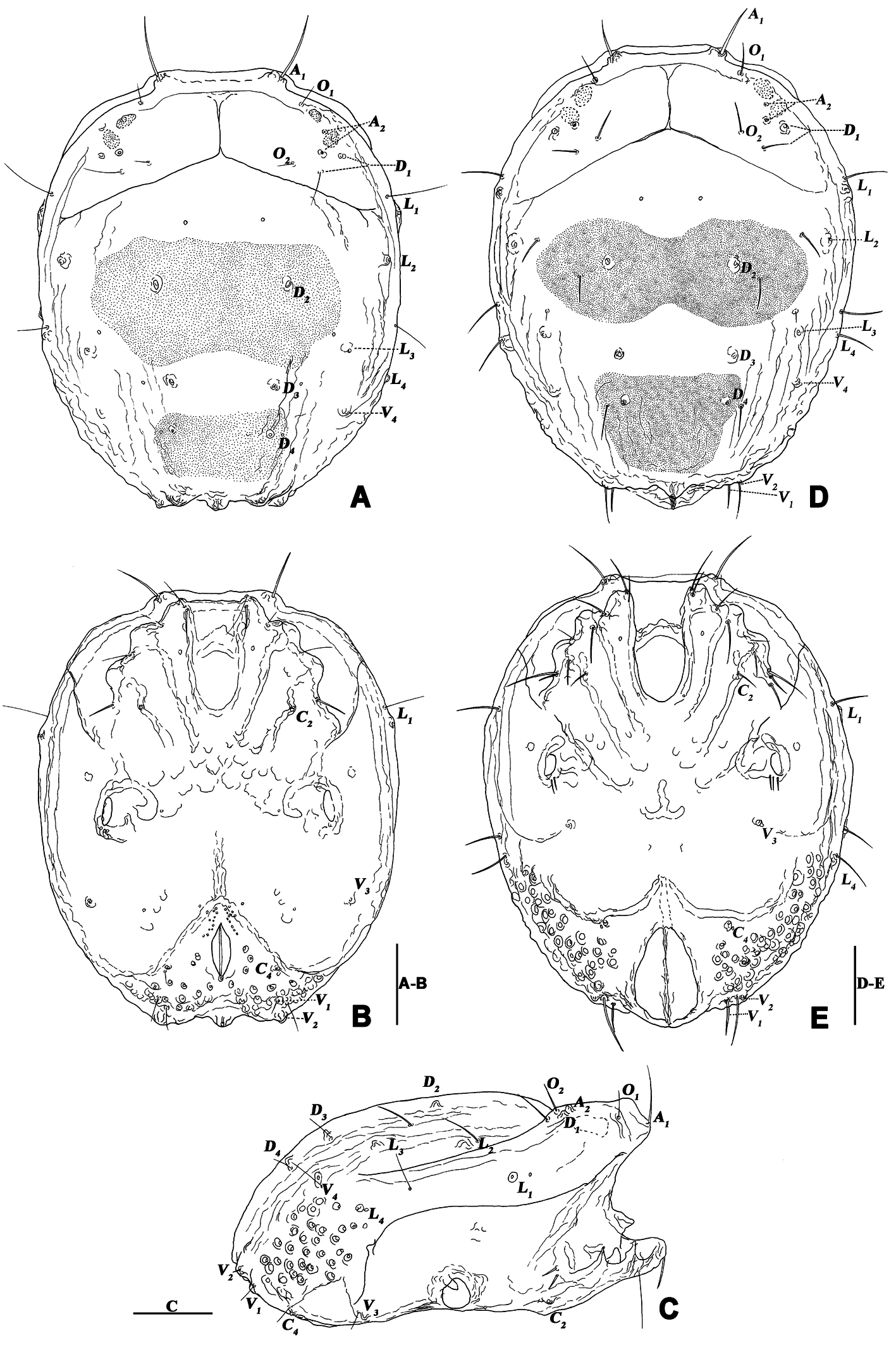 Description — Male (n=3). Idiosoma oval, slightly truncate at anterior end; dorsal and ventral shield present and this last with a conspicuous concavity (Figures 1 and 2). In dorsal view (Figures 1A and 2A): dorsal shield formed by one pair of anterior platelets and a large posterior plate; anterior platelets bearing the lateral eyes, O2 , A2 and D1 ; posterior plate bearing six pairs of glandularia (D2 –D4 , L2 –L3 and V4 ), setae of A2 , D1 –D3 , L2 –L3 all far away from glands, numerous longitudinal stripes, and two eyepatch-like violet spots, of which the anterior one is larger and covering almost 1/3 of the entire dorsal shield, and the posterior one situated at the end of the body; excretory pore protruding, located at the posterior end of the dorsal shield. In ventral view (Figures 1B and 2B): coxal plate single; tips of Cx-I not extending beyond the frontal margin; Cx-IV with distinct suture lines; suture line of Cx-III/IV ending medially to IV-L insertions and not reaching the medial line; C2 located at the posterior margin of Cx-II where suture line of Cx-II/III convex latero-posteriorly (Figure 3C); Cx-IV well extended posteriorly with round posterior margin and laterally with a ridge; IV-L basal segmental fossa without ankles. Genital field (Figure 3A) triangular and slightly depressed, fused to ventral shield; gonopore elongated and somewhat projecting, anteriorly with several genital hairs; with multiple acetabula located on both sides of gonopore to the posterolateral area of idiosoma; C4 located at either side of posterior part of genital pore (Figure 3E).