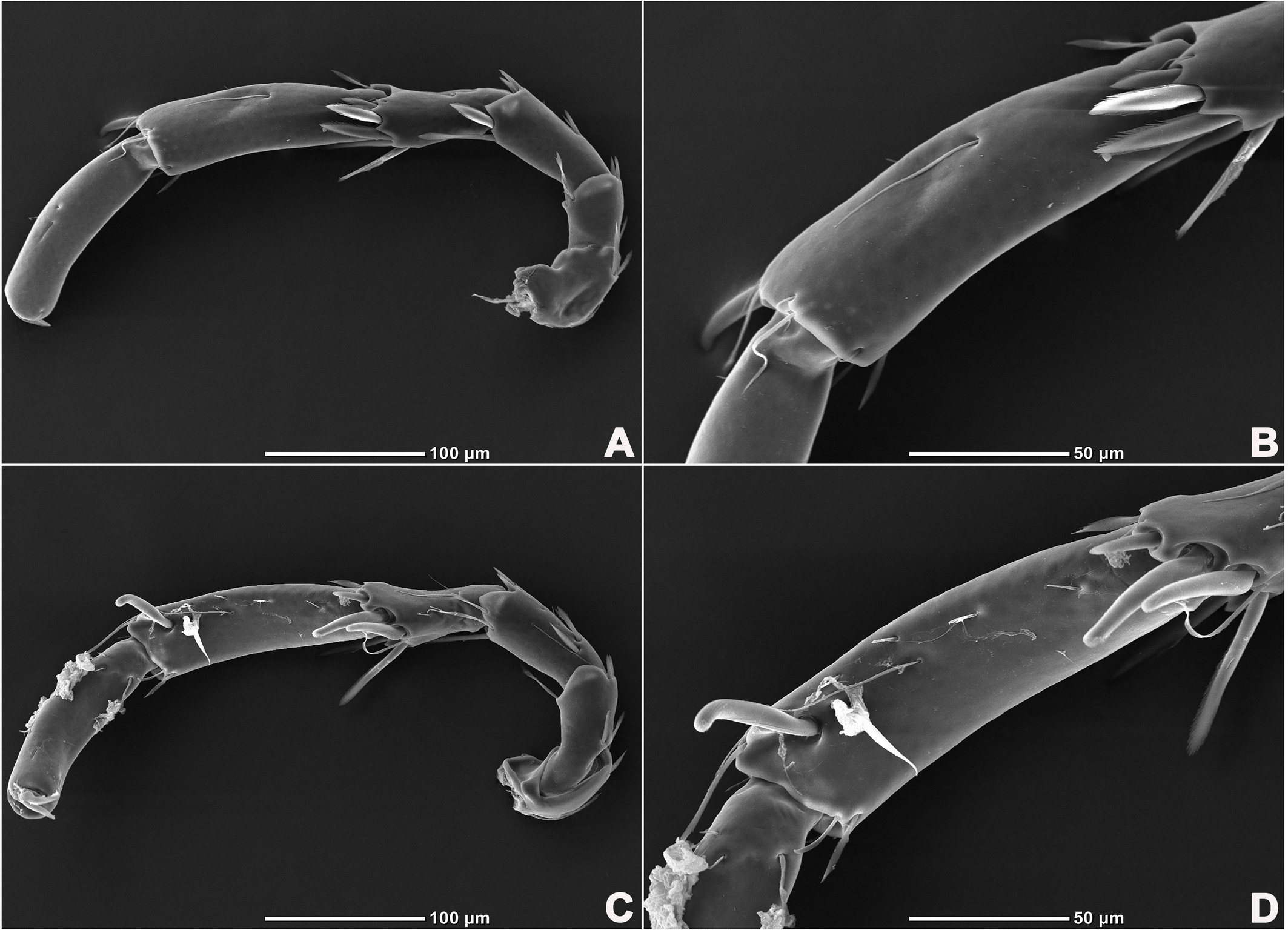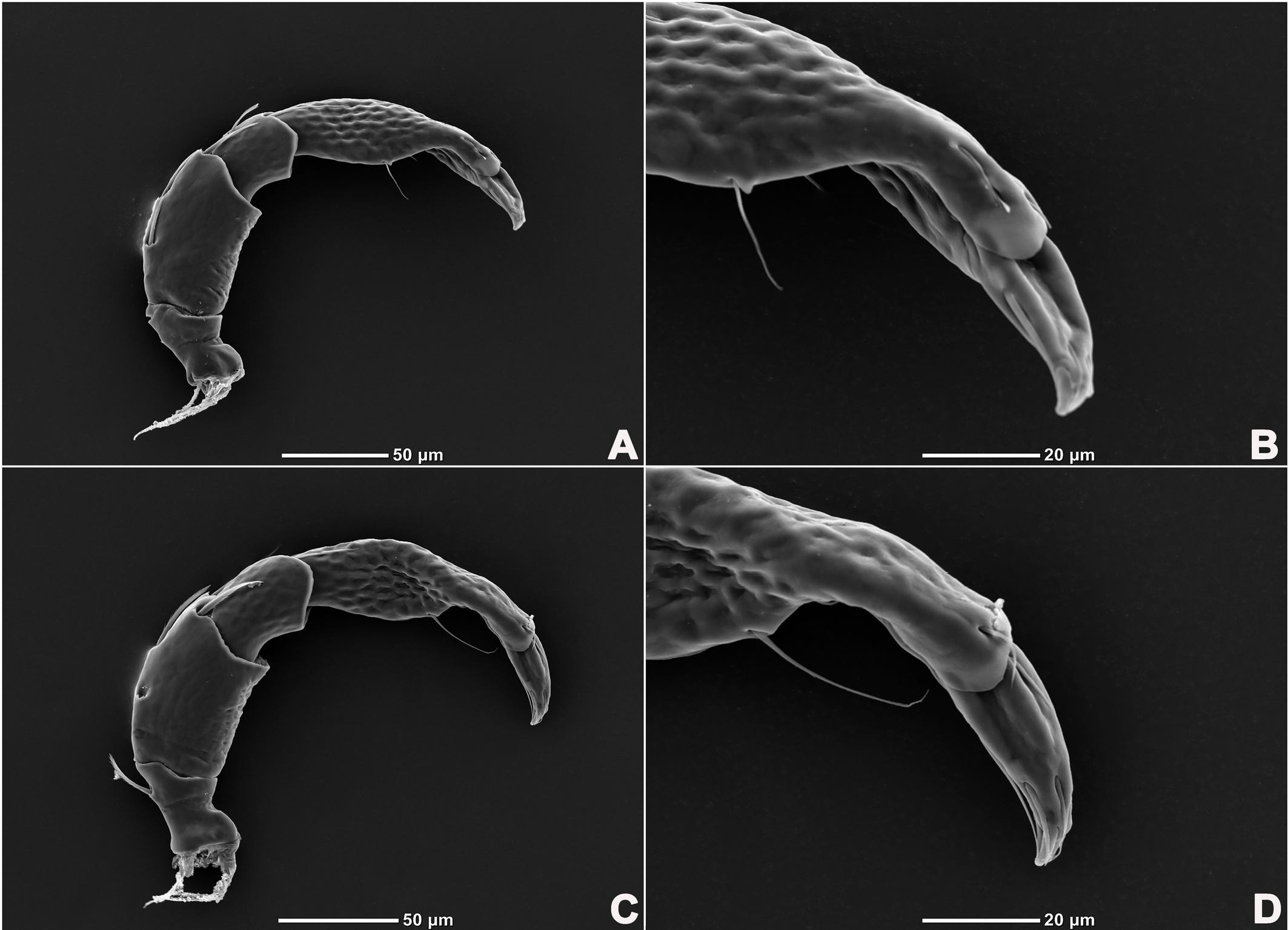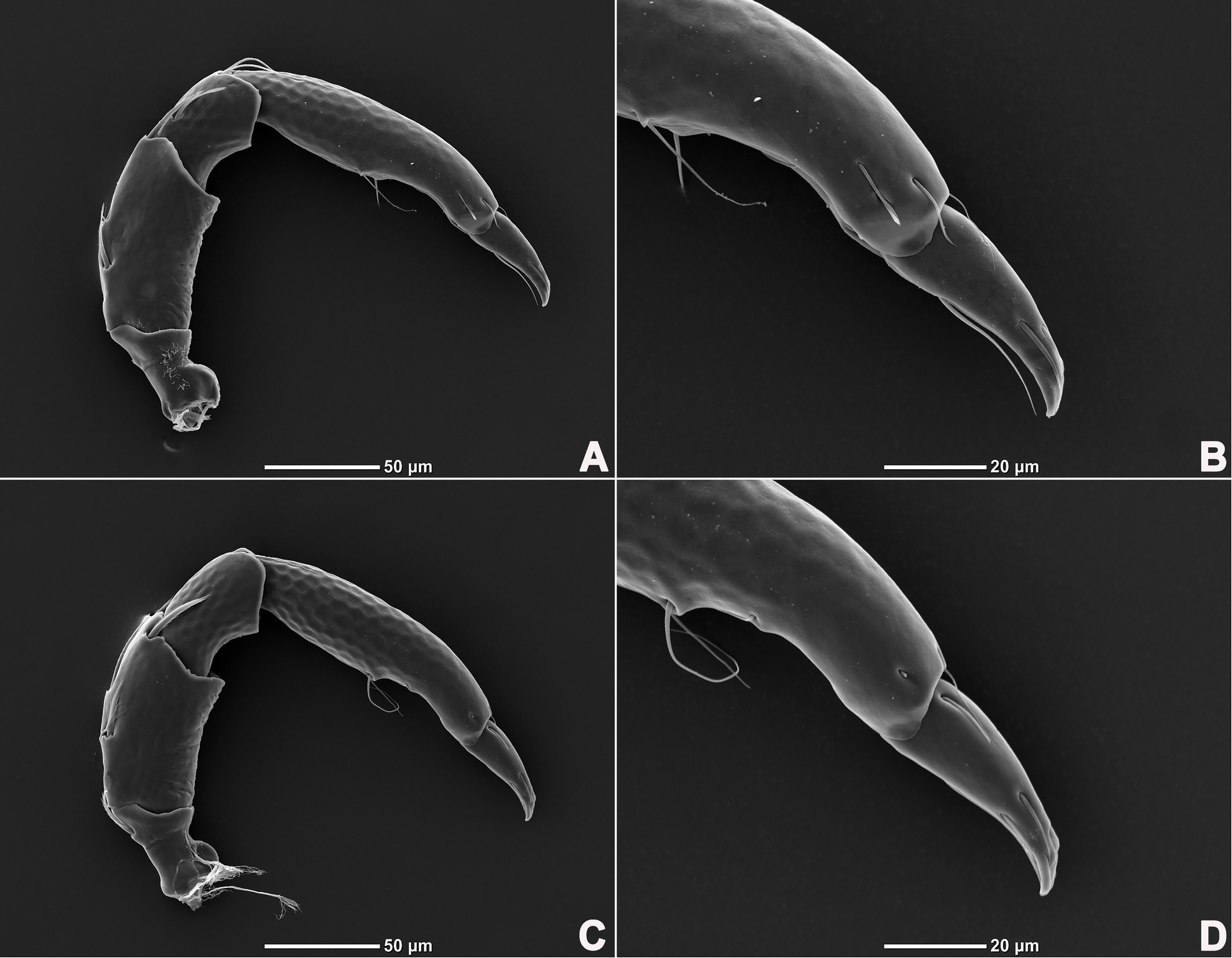 Legs six-segmented; ventral margin and dorsal margin of I-L-6 and II-L-6 with a dense patch of small setae (Figures 20B and 20D), claws with one dorsal and one ventral clawlet (Figures 19C, 19D and 20); III-L and IV-L exhibiting significant sexual dimorphism; III-L-4 with three large setae on the end of the inner side, two of which are cylindrical; III-L-5 terminally with one ventrally curved large seta on the outer side; III-L-6 without distinct specific setae, with a pair of heteromorphic claws (Figures 16E and 21); IV-L-4 with a well-developed projection bearing three large setae on the inner side (Figure 18E), the two last of which are blunt and slightly curved; IV-L-5 ending with one angular projection, ventrally with a row of plumose setae and one large cylindrical seta at the end; IV-L-6 without distinct processes, with a claw same as that of I-L and II-L (Figures 16F and 18D).