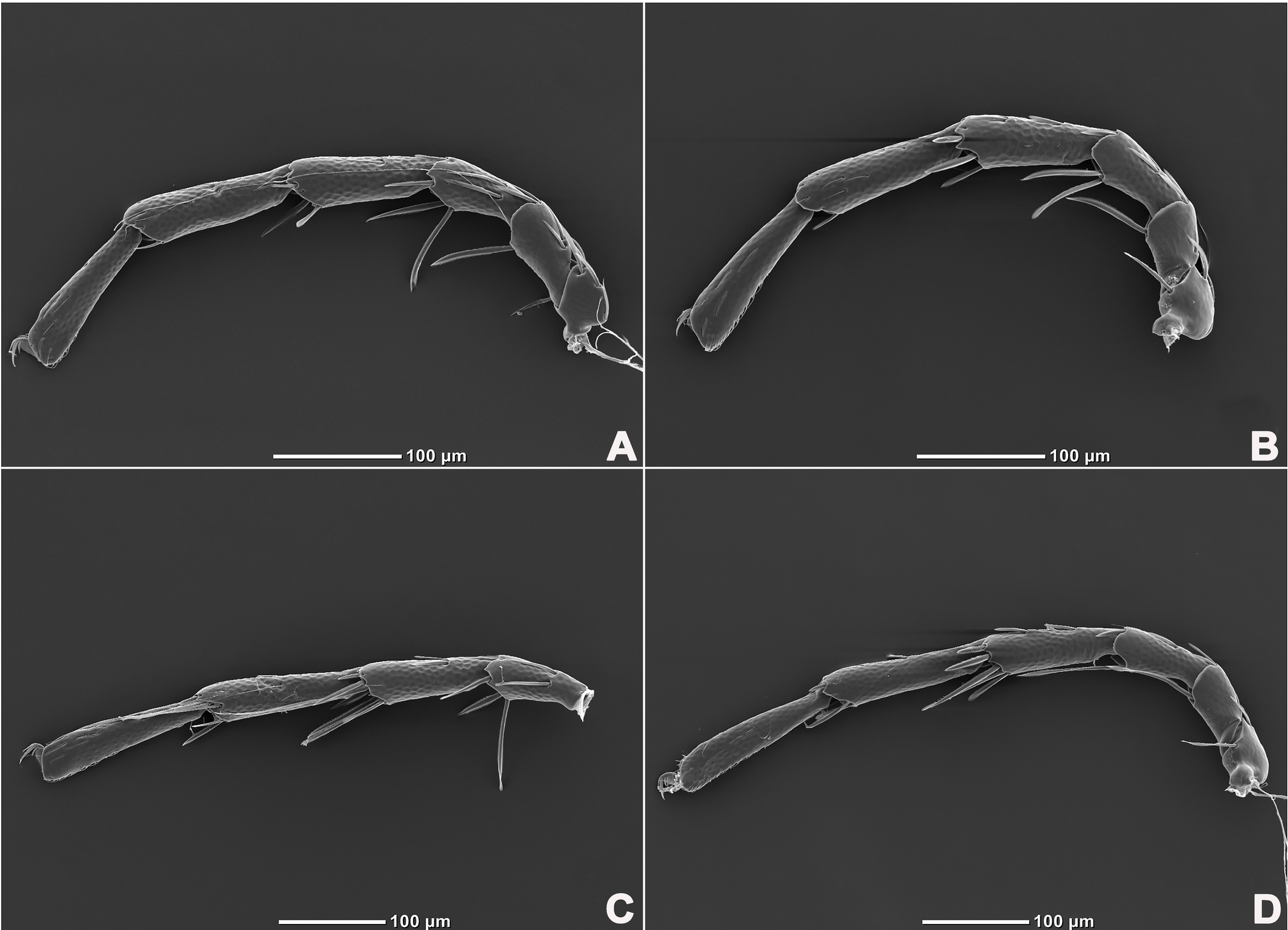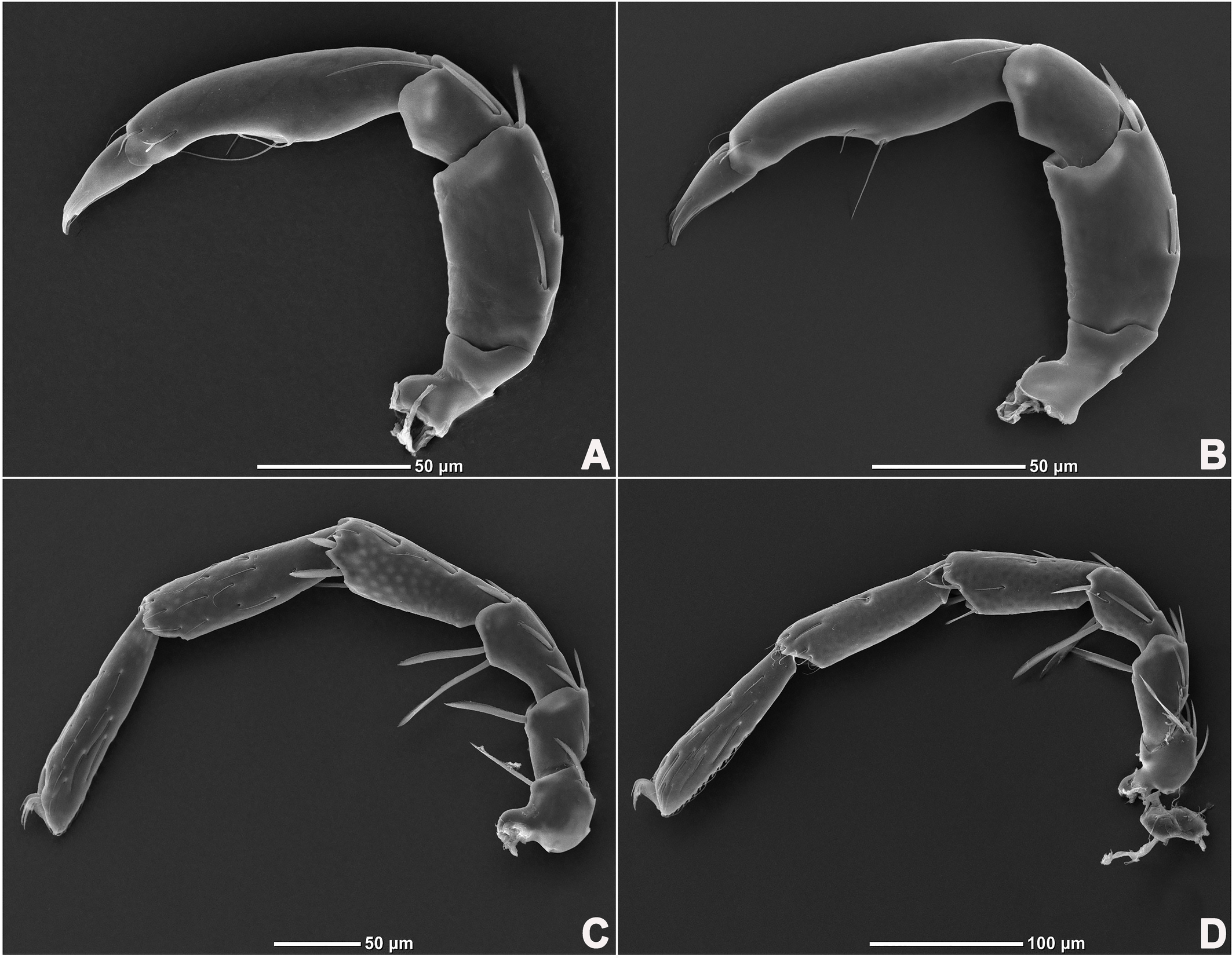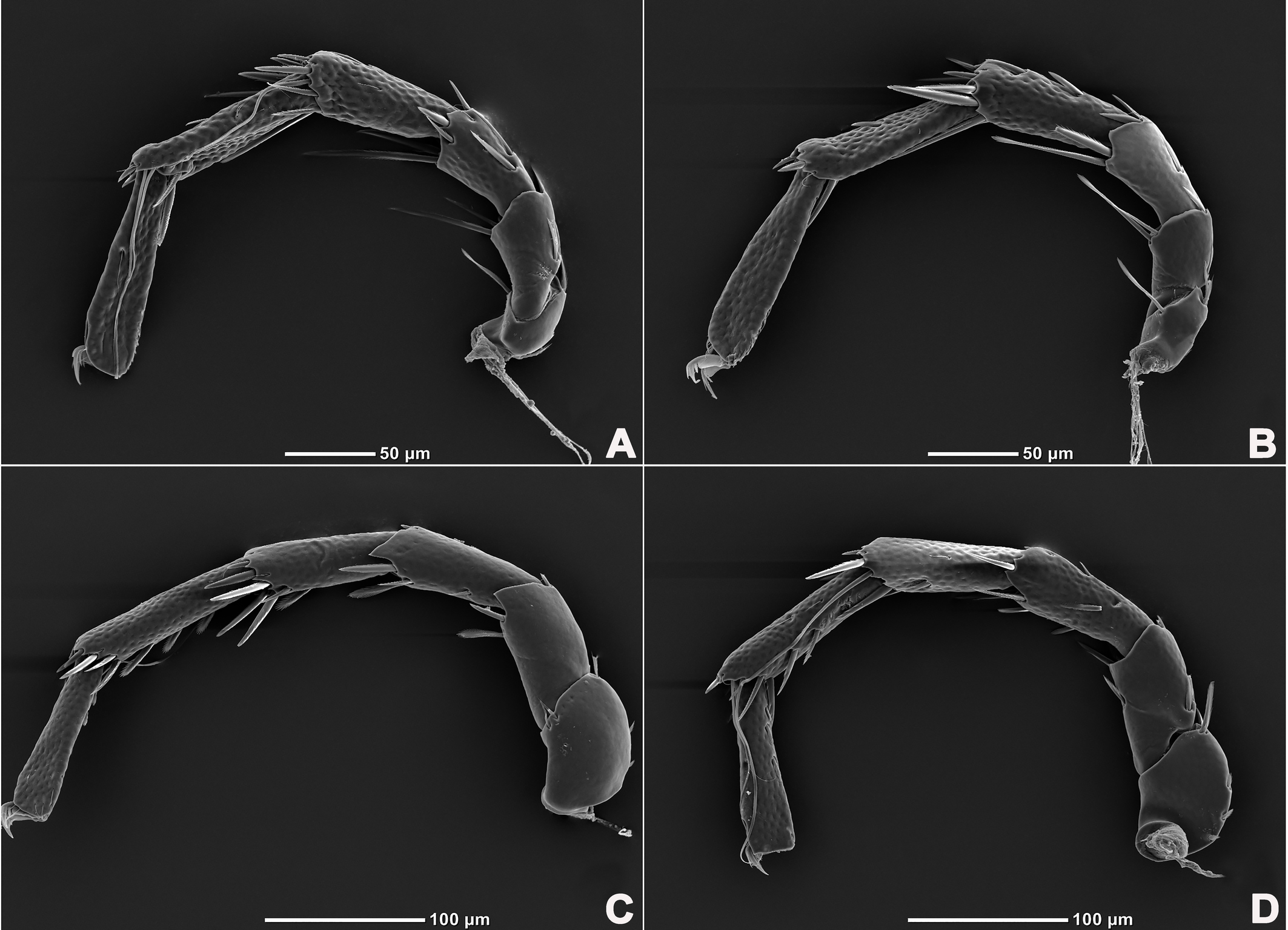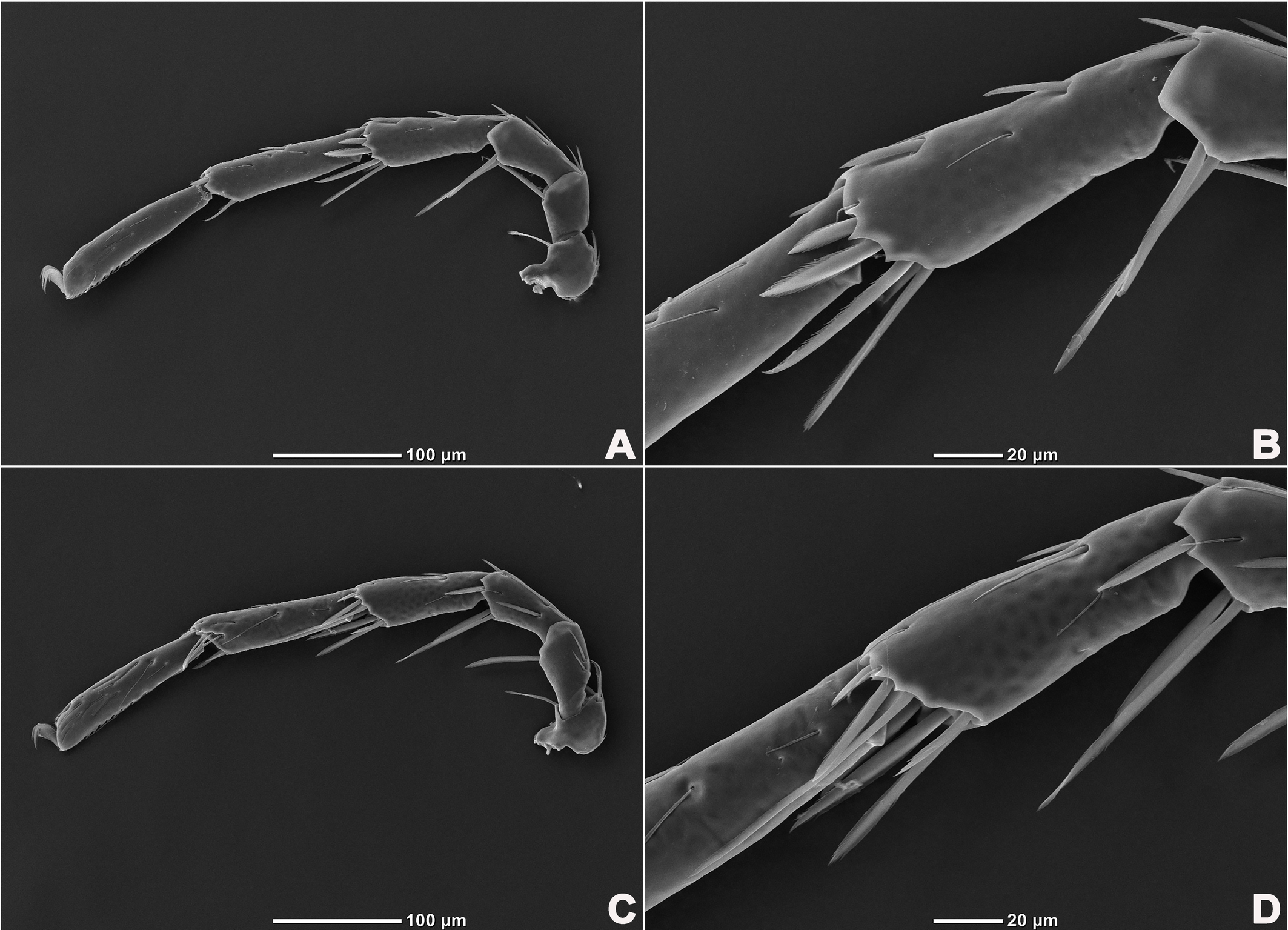 Legs six-segmented; ventral margin and dorsal margin of I-L-6 and II-L-6 with a dense patch of small setae (Figures 20B and 20D), claws with one dorsal and one ventral clawlet (Figures 19C, 19D and 20); III-L and IV-L exhibiting significant sexual dimorphism; III-L-4 with three large setae on the end of the inner side, two of which are cylindrical; III-L-5 terminally with one ventrally curved large seta on the outer side; III-L-6 without distinct specific setae, with a pair of heteromorphic claws (Figures 16E and 21); IV-L-4 with a well-developed projection bearing three large setae on the inner side (Figure 18E), the two last of which are blunt and slightly curved; IV-L-5 ending with one angular projection, ventrally with a row of plumose setae and one large cylindrical seta at the end; IV-L-6 without distinct processes, with a claw same as that of I-L and II-L (Figures 16F and 18D).