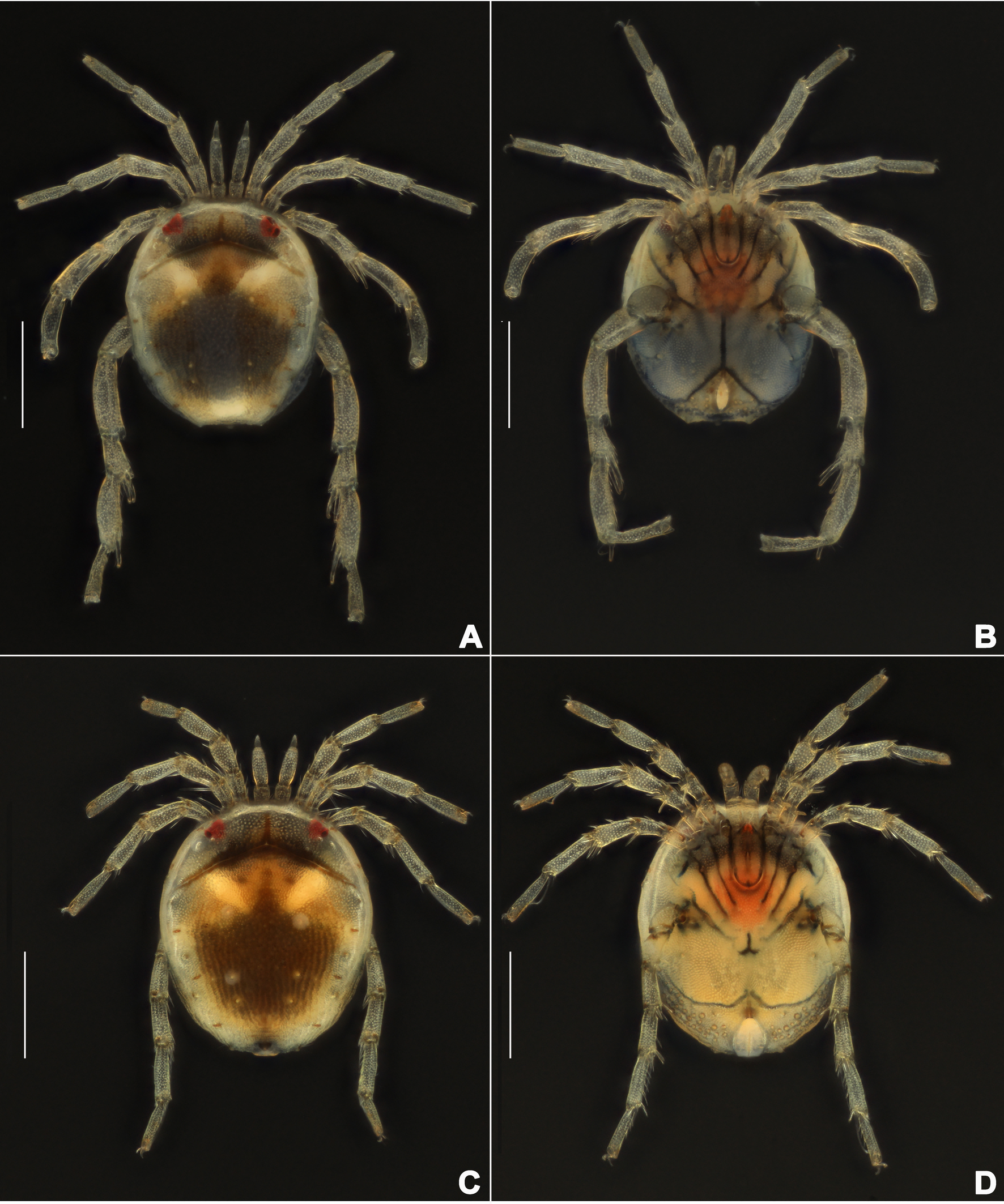 All terminology and abbreviations in this article were taken and updated from Jin (1997): a.s.l. = above sea level, A1 = preantennal glandularia, A2 = postantennal glandularia, A2g = glands of the A2 , A2s = seta of the A2 , C2 and C4 = coxoglandularia 2 and 4, Cx-I–Cx-IV = coxae I–IV, D1 –D4 = dorsoglandularia 1–4, D1g–D4g = glands of the D1 –D4 , D1s–D4s = setae of the D1 –D4 , dL = dorsal length, I-L-1–6, so forth. = first to sixth segment of the first leg, so forth., L = length, L1 –L4 = latero-glandularia 1–4, L1g–L4g = glands of the L1 –L4 , L1s–L4s = setae of the L1 –L4 , O1 = preocularia, O2 = postocularia, P-1–5 = first to fifth segments of the palp (from proximal to distal), V1 –V4 = ventroglandularia 1–4, vL = ventral length, W = width.