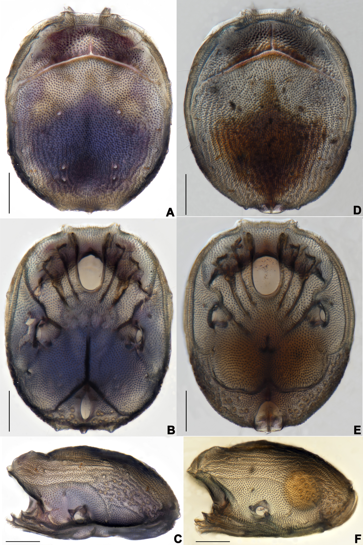 Patterns (presence or absence, shape, color and size) of large posterior dorsal plate is an important characteristic in species identification of Aturidae, and has been widely used, e.g. the genus of Axonopsis, Hexaxonopsis, Kongsbergia, Vicinaxonopsis, etc. (Asadi et al. 2010; Pešić et al. 2010; Radwell and Smith 2012; Pešić and Gerecke 2014; Pešić and Smit 2016; Smit 2016). Among the two species illustrated in this paper, eyepatch-like violet spots of the lager posterior plate in S. unicucrus and irregular bluish-purple pattern in S. hainanensis sp. nov. are embedding into the chitin exoskeletons and maintain intraspecific stability and interspecies differences. Therefore, the patterns (presence or absence, shape, color and size) of the large posterior plate could be used as discriminative features for species identification of Sinaxonopsis. At the same time, we should pay more attention to illustrate it in detail, to provide enough materials for future taxonomic studies of Aturidae. The present results have not only provided potentially effective characters for species identification in Sinaxonopsis, but also materials for phylogenetic analysis based on glandularia.