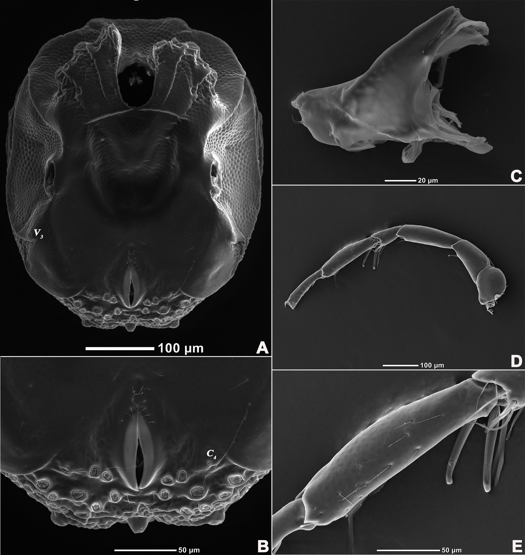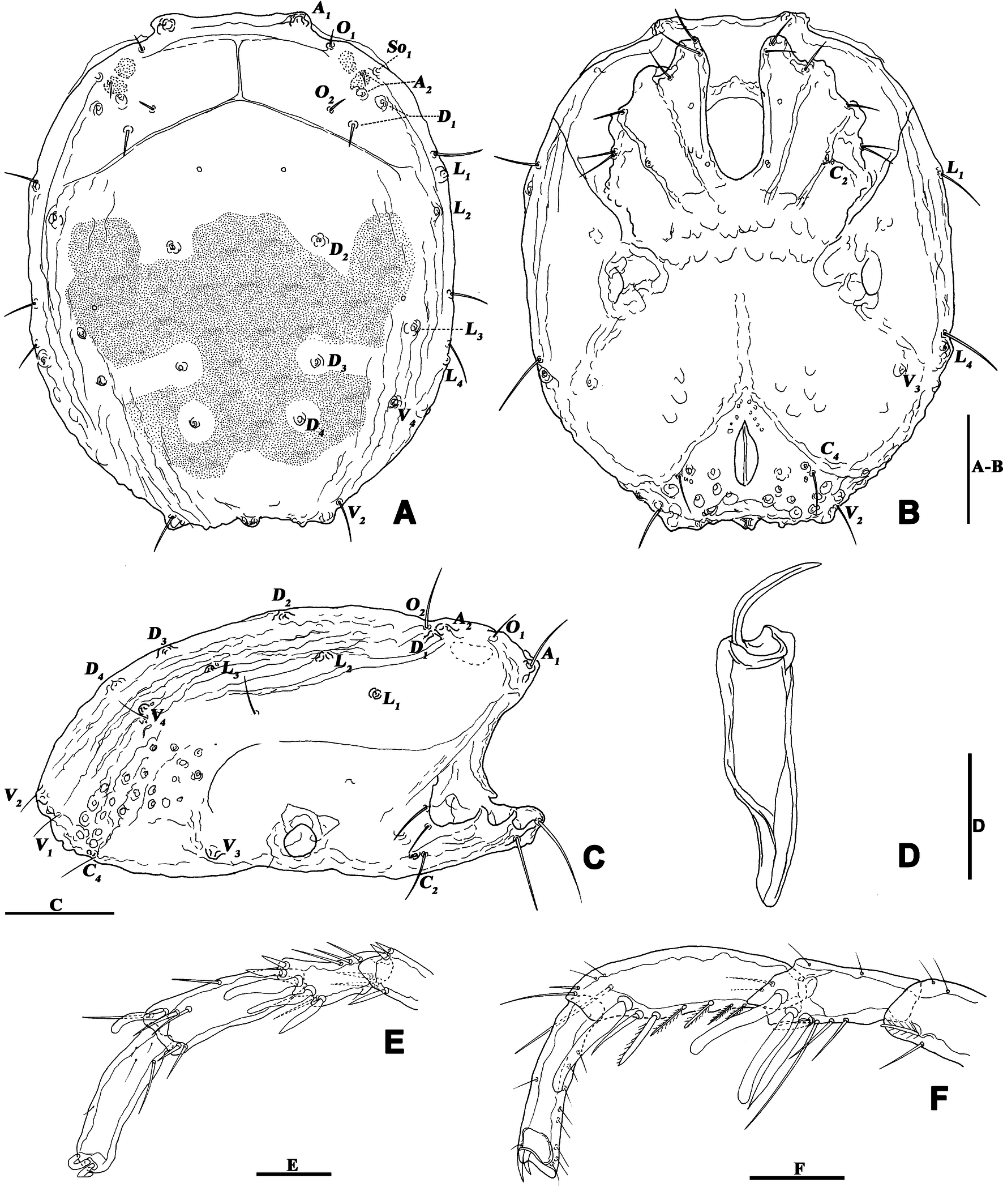 Remarks — The specimens from Henan Province were identified as S. unicucrus Yi & Jin, 2012 due to the following characteristics: (1) dorsal shield formed by one pair of anterior platelets and a large posterior plate; (2) III-L-4 with two blunt and cylindrical setae at the end; (3) III-L-5 terminally with one large cylindrical seta curving toward the ventral surface; (4) III-L-6 with a pair of heteromorphic claws; (5) IV-L-4 with a developed irregular protrusion and four large setae at the end; (6) IV-L-5 with well-developed protrude collar and three heteromorphic setae at the end, the nearest to the back is cylindrical and much thicker than the other two; (7) IV-L-6 with a particularly well-developed dorsal process (Yi and Jin 2012).