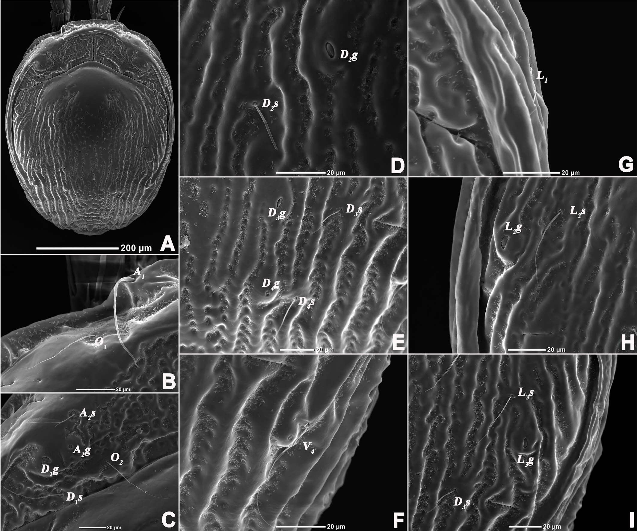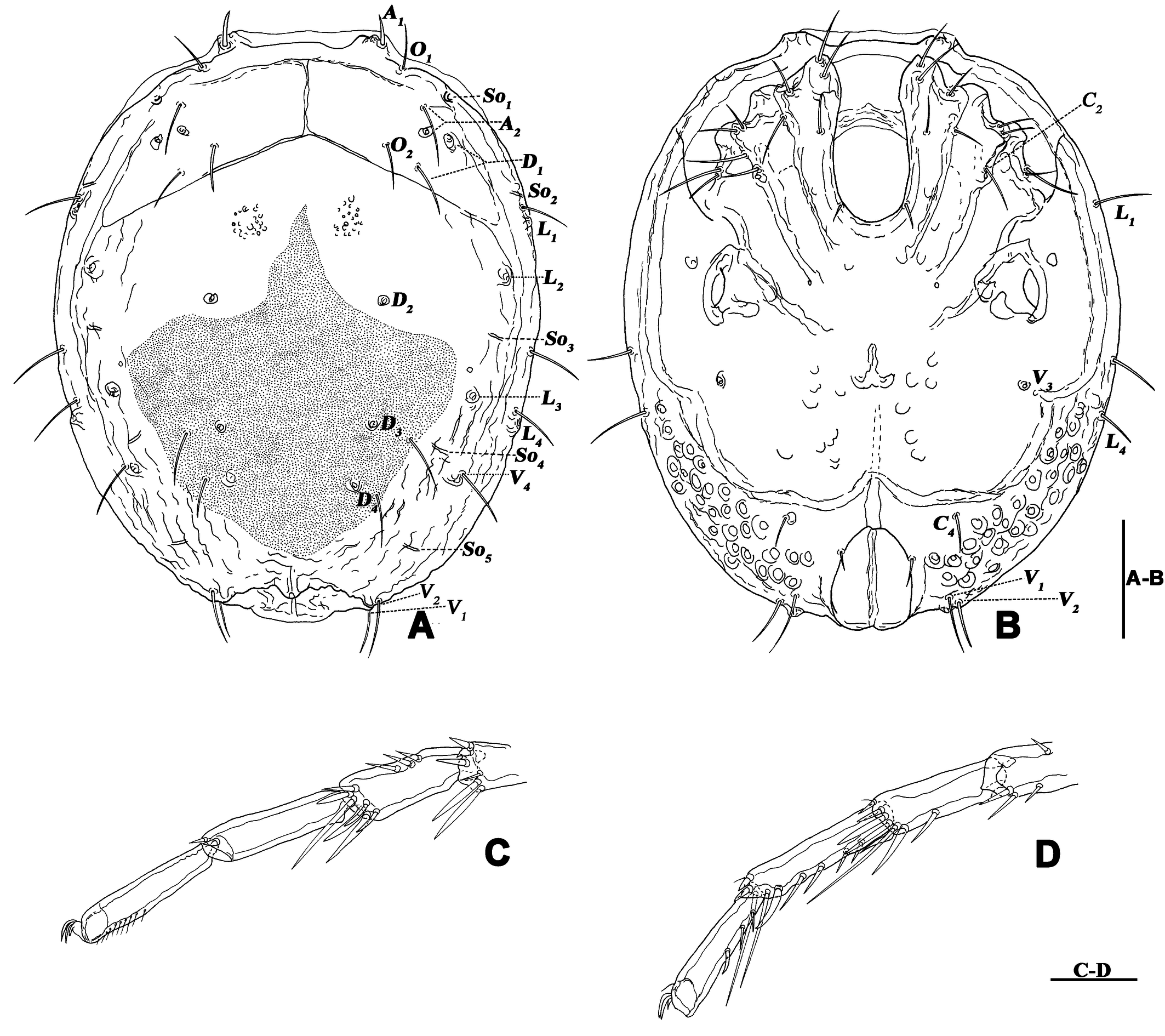 Female (n=9). Idiosoma L/W 572–654/463–525; anterior platelets L/W 217–238/76–84, posterior plate L/W 455–507/430–489; gnathosomal bay L 159–171, gnathosoma vL 122–146, dL 146–158. Palp: dL of P-1–5, 47–51, 82–94, 41–45, 114–125, 44–45. Legs: dL of I-L-1–6: 47–56, 50–56, 63–70, 94–105, 113–122, 118–134; dL of II-L-1–6: 51–53, 52–57, 69–73,108–111, 131–144, 138–146; dL of III-L-1–6: 56–63, 54–55, 72–74, 107–116, 138–141, 143–145; dL of IV-L-1–6: 94–109, 76–85, 109–119, 112–124, 148–164, 136–155.