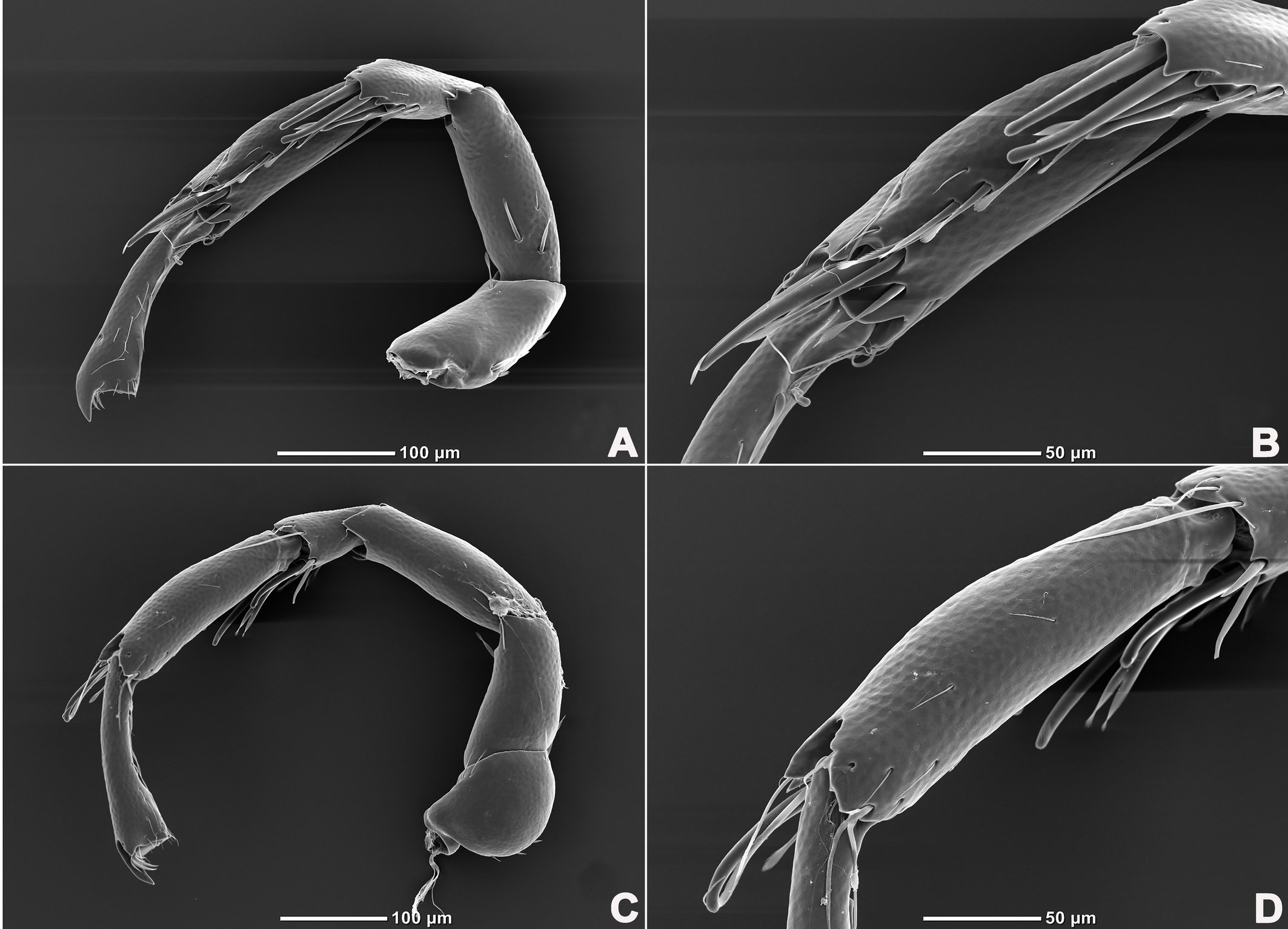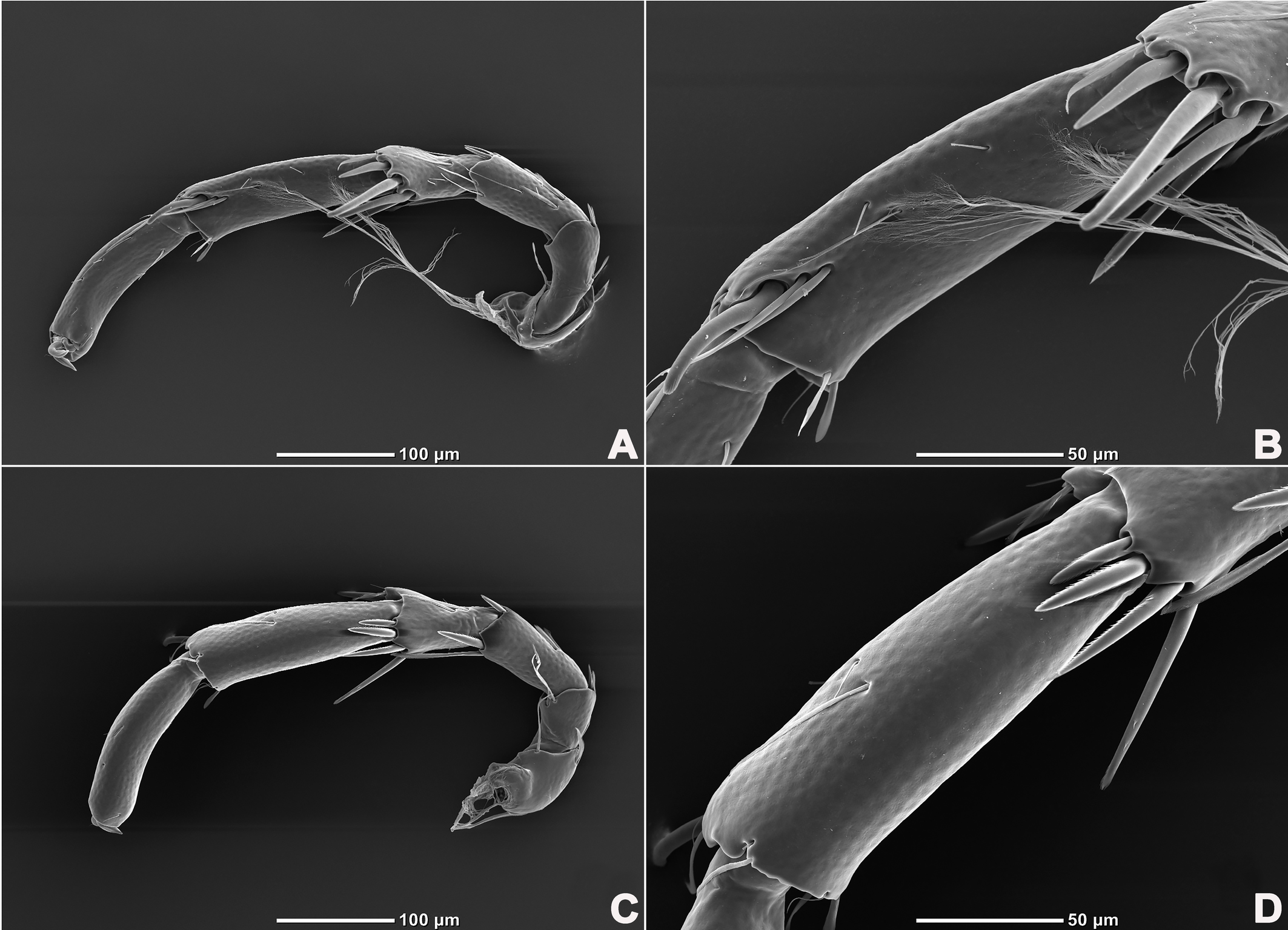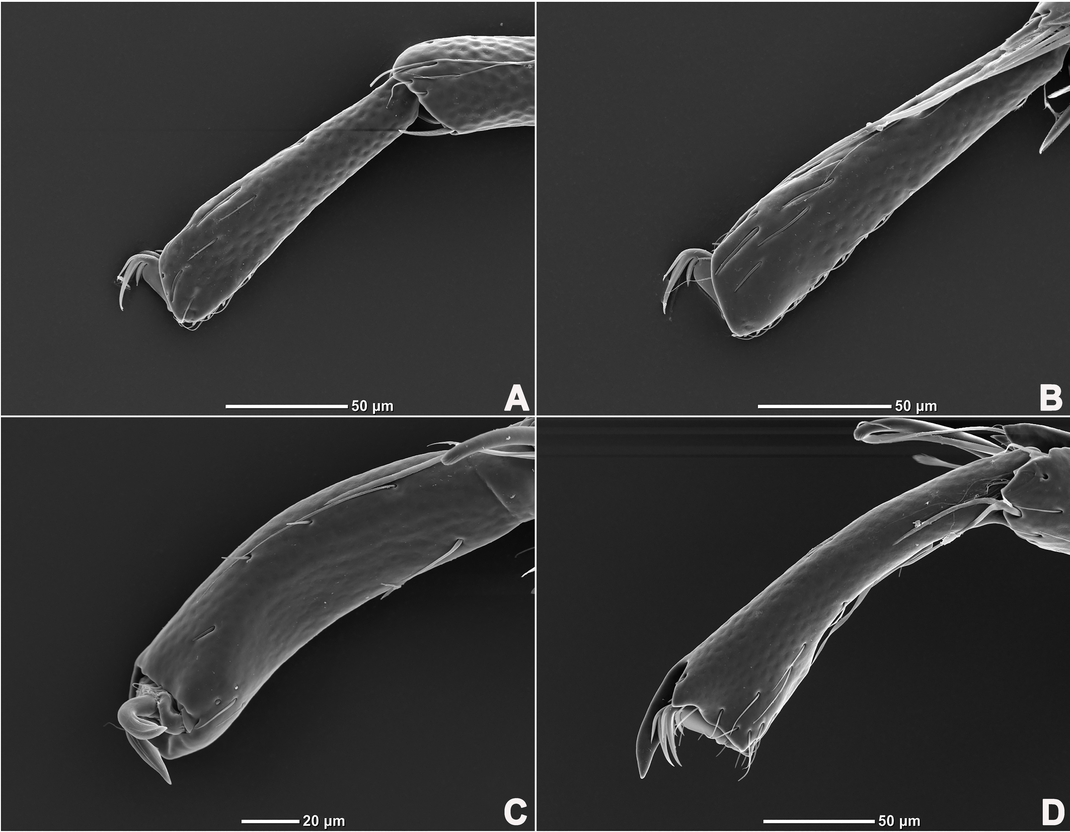 Legs six-segmented; ventral margin of I-L-6 and II-L-6 with dense small setae; claws with one dorsal and one ventral clawlet (Figures 5, 8A and 8B); III-L and IV-L exhibiting significant sexual dimorphism; III-L-4 with four large setae at the end of the outer side, two of which are blunt and cylindrical; III-L-5 ending in one large cylindrical seta curved towards the ventral surface on the outer side; III-L-6 ventrally curved, with a pair of heteromorphic claws (Figures 6 and 8C). IV-L-4 with a developed irregular protrusion and four large setae at the end of the outer side, the two last of which are blunt and cylindrical; IV-L-5 with one cylindrical seta at the end; lateral margin with a row of setae neatly arranged; IV-L-6 terminally enlarged, with a particularly well-developed dorsal process; features of the claws the same as I-L and II-L (Figures 7 and 8A).