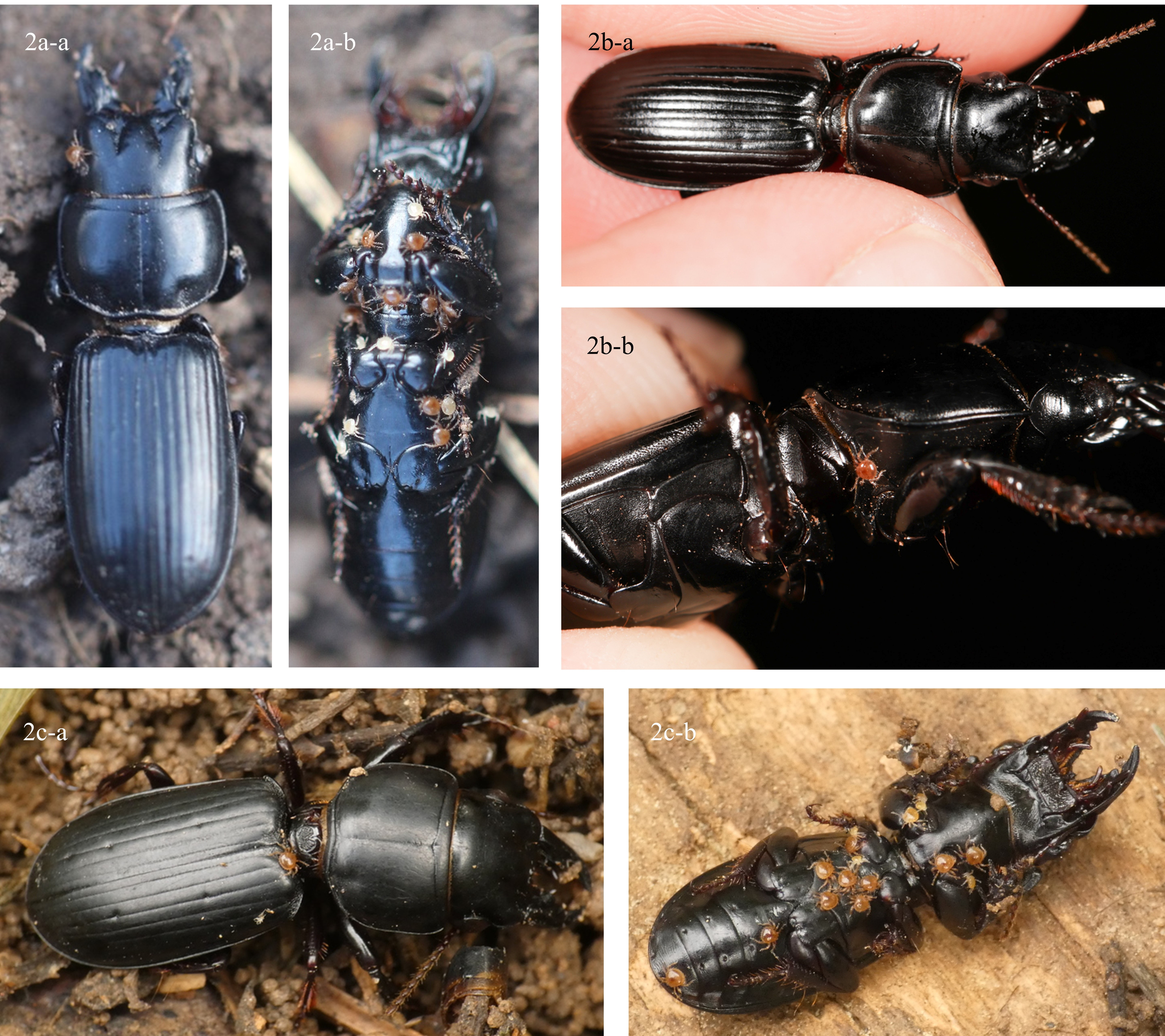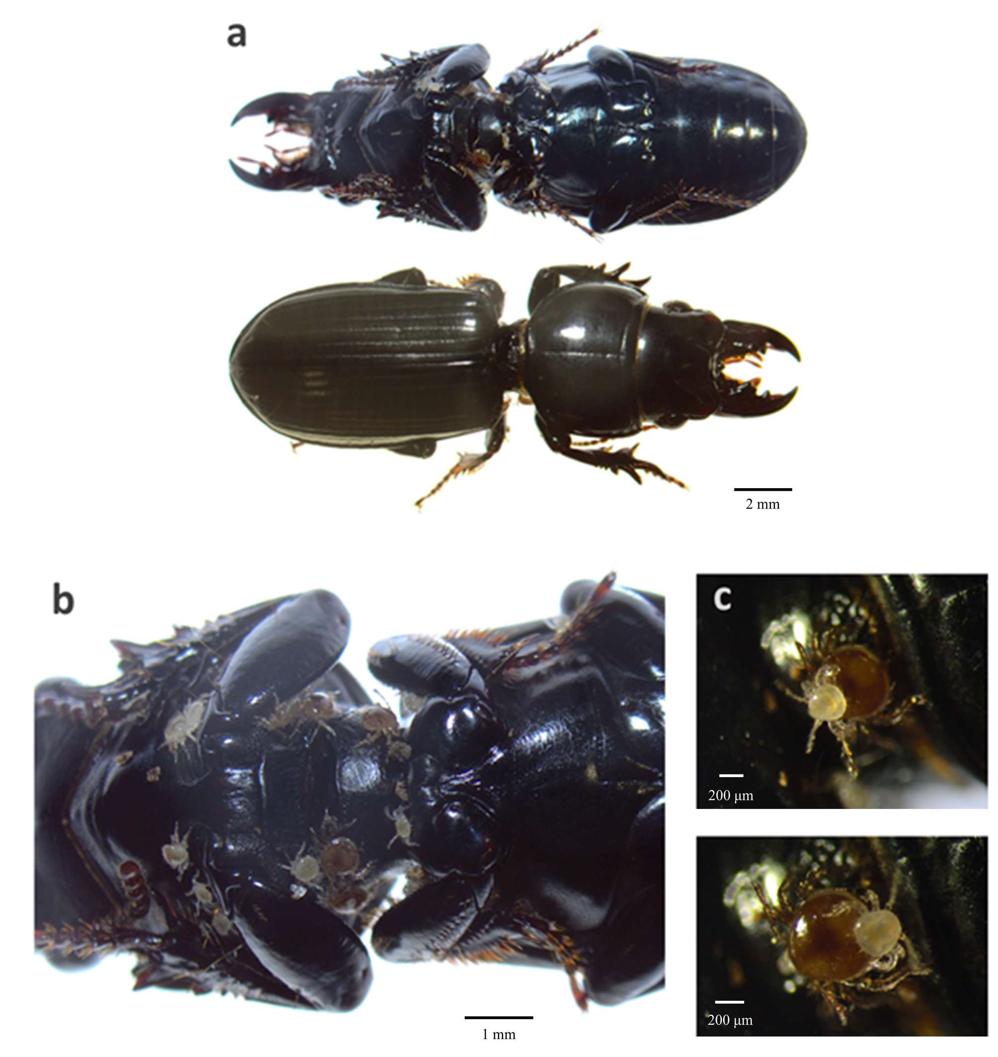 Micromegistus bakeri favor the ventral surface of their hosts (Figures 1–2) and can remain somewhat hidden under the prothorax and beneath or around the legs. Nickel and Elzinga (1970a) found that the mites prefer the coxae, trochanters and femora of legs II, and will secondarily occupy the same segments of legs I and III, as well as the thorax near the narrow junction between the prothorax and mesothorax of the beetle. Our inspection of two S. subterraneus infested with M. bakeri revealed that the mites favored the area around the junction of the prothorax and mesothorax (Figure 1b) compared to the other regions of the beetle noted by Nickel and Elzinga (1970a). However, as the mite population grew on these two S. subterraneus kept in the lab, increased activity on the entire ventral surface was also noted, presumably because preferred sites were overcrowded. Immatures were often observed interacting with adult mites (Figure 1c shows a larva on an adult, probably a female), and were frequently found on the beetle's mandibles as well as occasionally walking across the elytra.