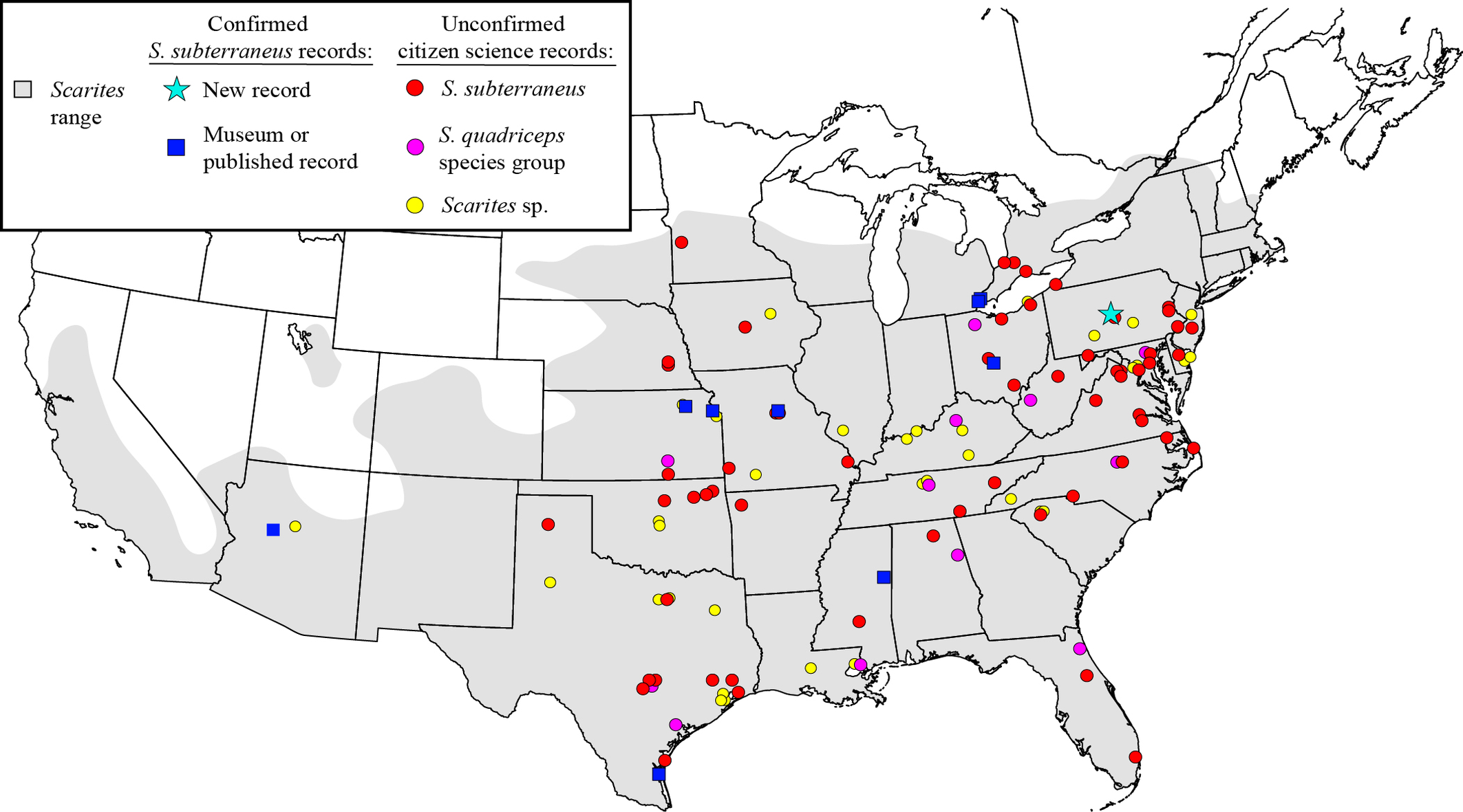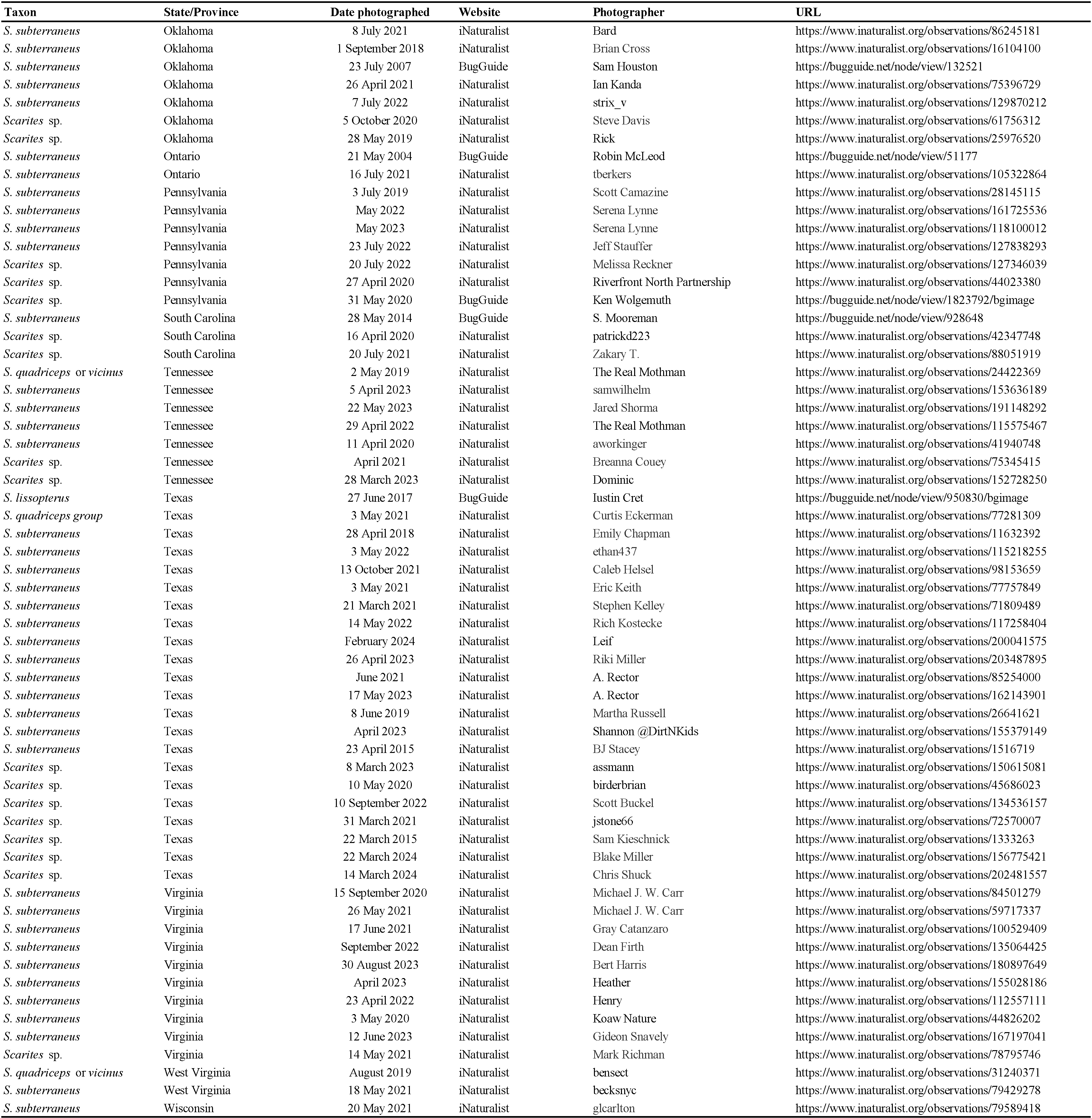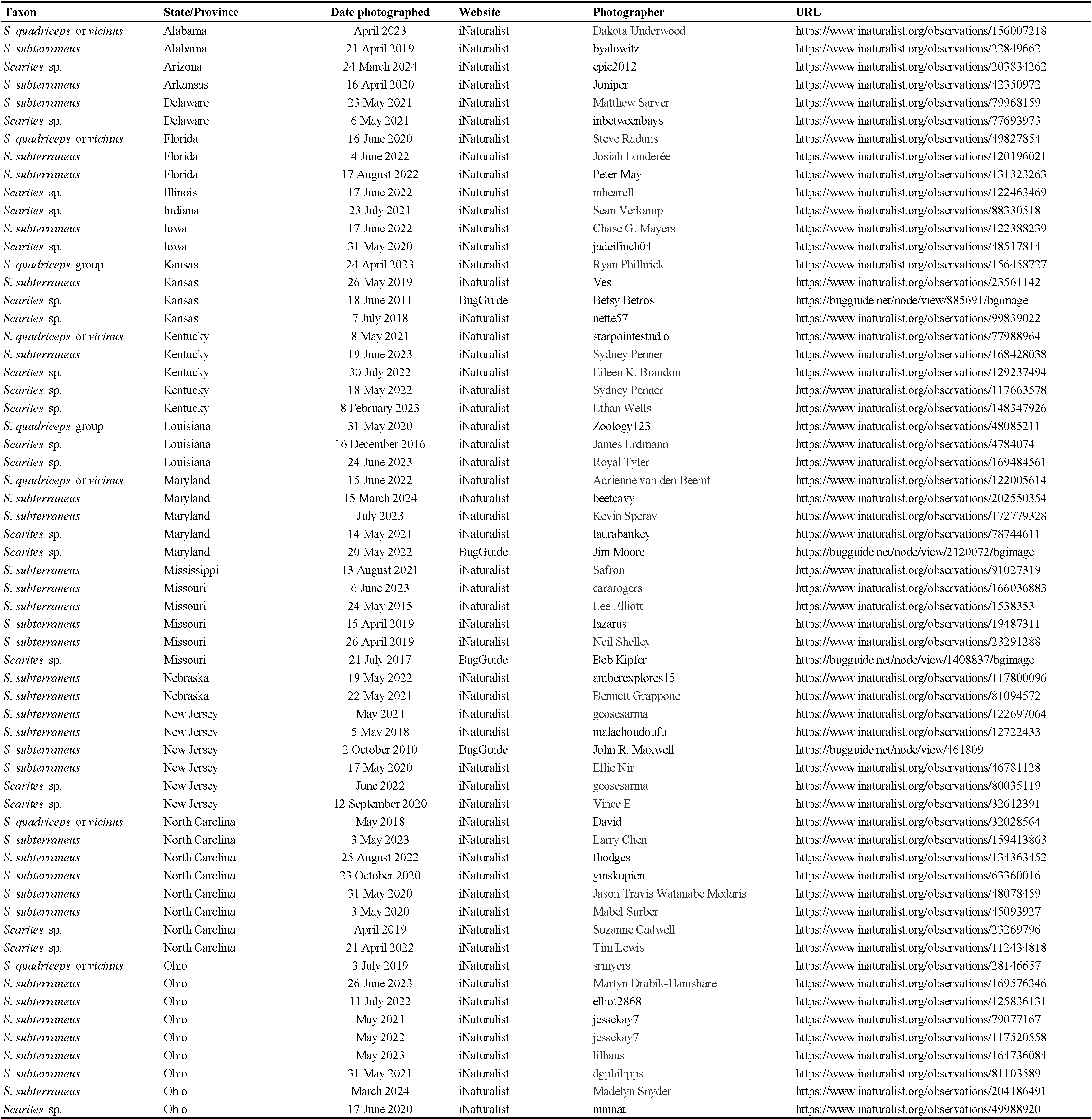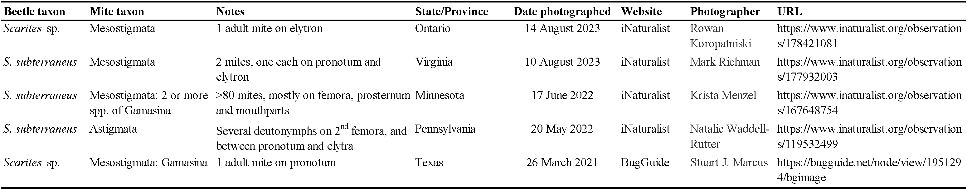 ) were examined for visible mites to document additional suspected locality records (Table 1). The identities of all Scarites that had mites were confirmed by the authors. The map was created in Adobe Illustrator using Google Maps to mark localities. Because (1) the range of S. subterraneus encompasses the ranges of the other six Scarites species found in the United States and Canada, (2) the species identity of many Scarites posted on iNaturalist could not be confirmed beyond genus due to the absence of morphologically informative characters in photographs, and (3) Micromegistus-like mites were found on Scarites species other than S. subterraneus (see ''Utility of citizen science photographs'' below), the range map is based on all Research-grade Scarites observations available on iNaturalist.