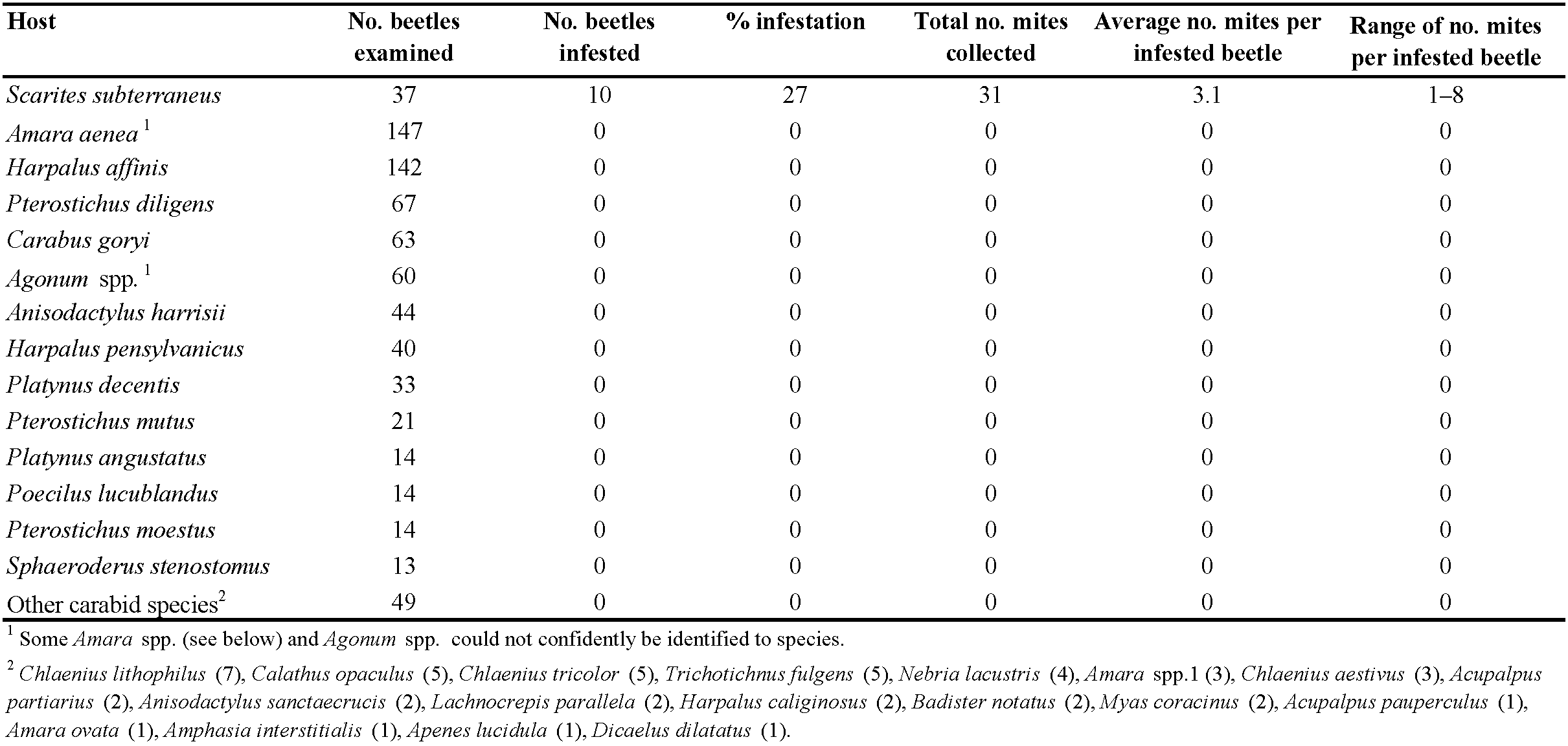 In total, 573 ground beetles, representing 32 species, were collected. Micromegistus bakeri were found on 10 of 37 (27%) of S. subterraneus, but none of the 31 other carabid species (Table 2). Micromegistus bakeri was the only mite species observed on the field-collected ground beetles, although the subelytral space was not examined for mites. Although most carabid taxa were collected in low abundances (17 species plus unidentified Amara spp.), we collected at least 10 specimens from each of 13 non-Scarites taxa (12 species plus unidentified Agonum spp.). Furthermore, six of these species were found in abundances (33–147 individuals) similar to or greater than S. subterraneus, suggesting that M. bakeri do not use these carabids as hosts despite their similar prevalence in this locality. To our knowledge, Nickel and Elzinga (1970a) conducted the only other assessment of host range in M. bakeri, which encompassed a single locality in Kansas. They observed a high prevalence of M. bakeri on S. subterraneus (52 of 112 specimens; 46.4%). They also observed the mites on two other carabid beetles, Cyclotrachelus sodalis LeConte (reported as Evarthrus sodalis colossus in their study), and Patrobus longicornis, that occurred at the same site. Infestation rates on these two carabid species were high (25% and 33% of beetles had mites, respectively), but these figures were based on the inspection of only four and six specimens, respectively. With such limited data on the association between M. bakeri and these two apparent hosts, it remains unclear whether these occurrences represent accidental phoresy or a true symbiotic relationship.
