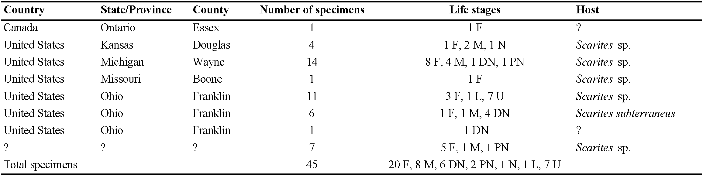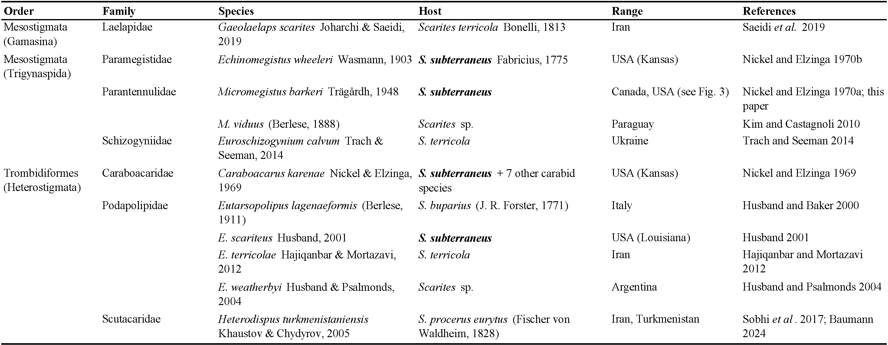 Micromegistus bakeri was first described from adult specimens collected from Scarites subterraneus (Carabidae: Scaritinae; Figures 1–2) in Mississippi (Trägårdh 1948). Following this discovery, M. bakeri was reported from Kansas by Nickel and Elzinga (1970a), who redescribed the species and detailed most of our current knowledge about its natural history, including feeding biology. They confirmed that M. bakeri occurred most frequently on S. subterraneus, but also reported a few individuals from two other carabid species: Cyclotrachelus sodalis (LeConte, 1846) (reported as Evarthrus sodalis colossus in their study), and Patrobus longicornis (Say, 1823). Since then, M. bakeri was subsequently reported from Padre Island, Texas (McDaniel and Bolen 1979), but has otherwise received no other scientific study. It has not been reported from any of the six other species of Scarites in North America north of Mexico.