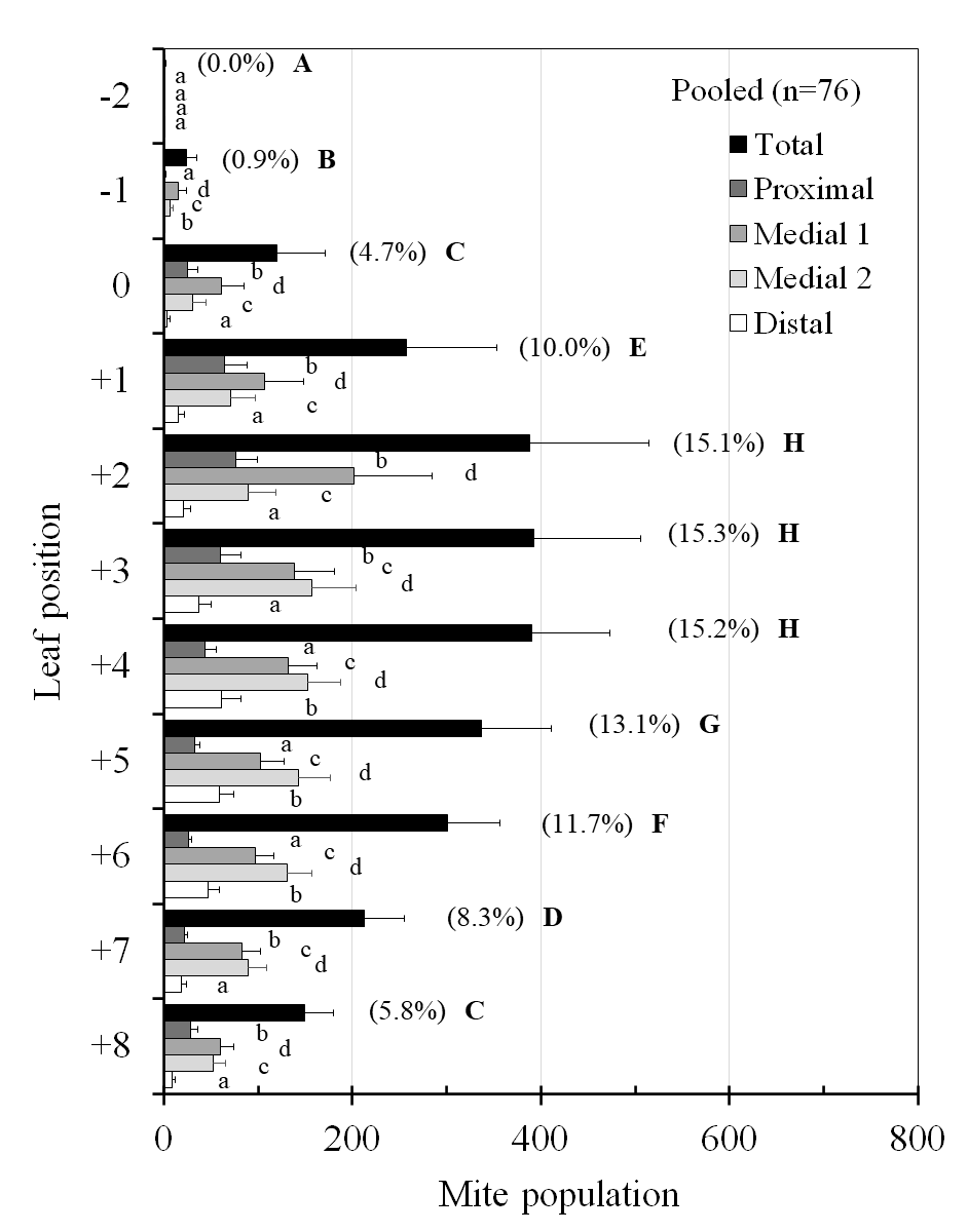 The leaf observations revealed that mite populations among plants and leaves varied greatly. The SRM populations per plant ranged from as low as 15 mites to as many as 23,408 mites with an average of 2,406 mites. Moreover, SRM populations per leaf ranged from 0–6,041 mites with an average of 228 mites. Along with the SRM populations, the leaves infested with mites varied within the range of 16–100% (Table 1). Leaves -2 and -1 were less infested, while leaves 0 downward to +8 were mostly infested by the SRM.