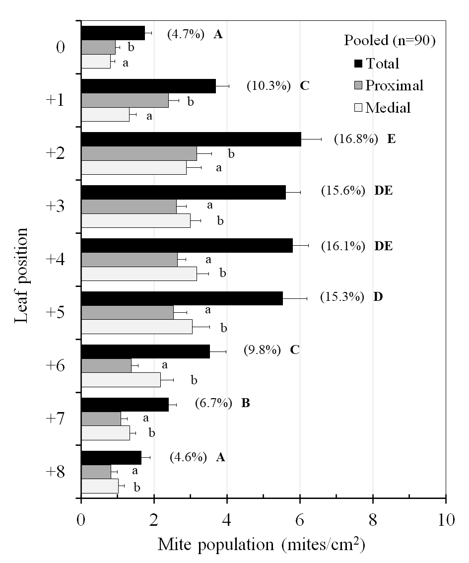 Leaves -2 and -1 were not observed in the imprinting technique because many leaves in the previous technique were without any mites. Furthermore, leaves +9 and +10 were observed but were not included in the analysis because they had been shed from many of the samples. The mite infestation rates were high between 69–100% (Table 1). Meanwhile, the mite density within the plant canopy varied greatly with an average of 2.0 mites/cm2 and ranged from 0 to 35 mites/cm2.