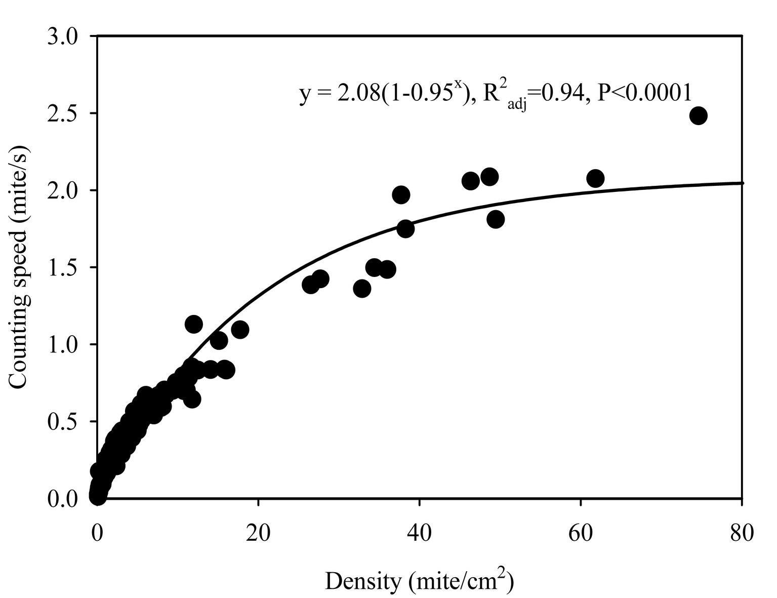 Sampling efficiency was evaluated by measuring the counting speed of mites on glass slides. As many as 158 glass slides with various mite densities taken from the previous observations were utilized in this evaluation. The mite density was recorded along with the time required for mite counting. Furthermore, observing the speed of the 93 blank slides (slides without mites) was also examined as a standard. This observation was performed at a fixed magnification of 15 times.