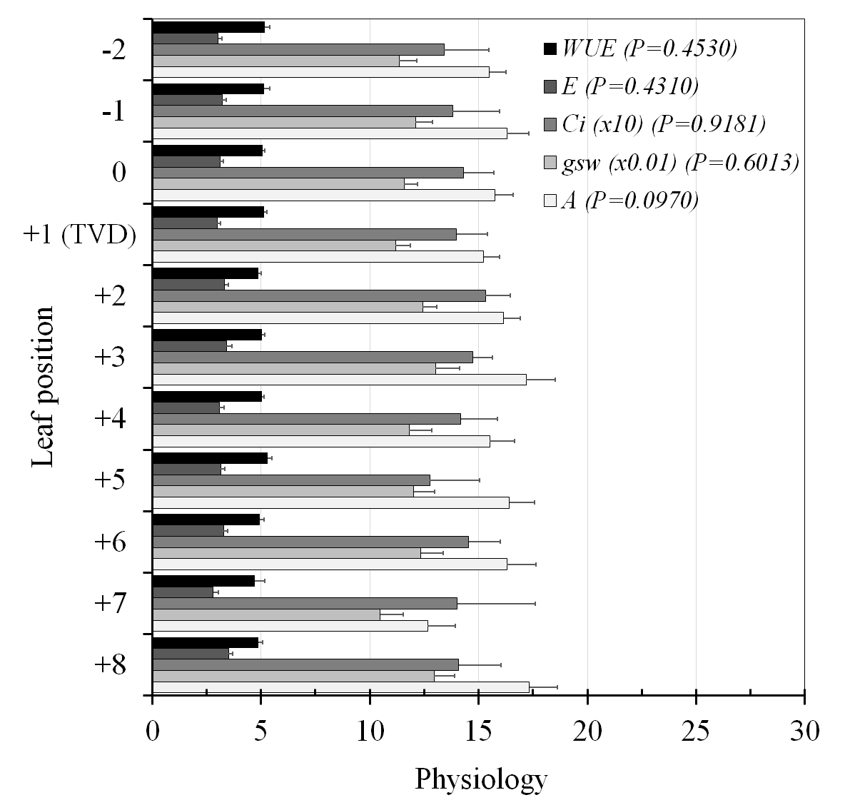 Analyses of variance revealed that the effect of leaf position on physiological parameters was not significant (Figure 5). The averages of net assimilation rate (A) or photosynthetic rate, stomatal conductance (gsw ), intercellular CO2 (Ci ), transpiration (E) and WUE were 15.85 µmol CO2/m2/s, 0.119 mol H2O/m2/s, 141.11 µmol CO2/mol, 3.18 mmol H2O/m2/s and 5.03 µmol CO2/mmol H2O, respectively. Furthermore, there were no obvious patterns in the parameters regarding the position of the leaves. Consequently, the physiological status of the leaf should not be considered in the SRM sampling.