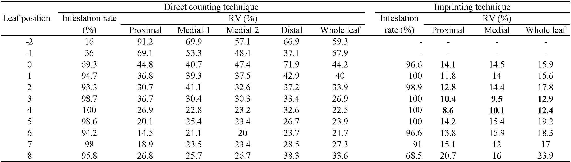 The RVs generated by direct counting were between 14.5–91.2% and none of them met the sampling requirement, regardless of leaf position (Table 1). On the other hand, the imprinting technique was more promising with the smaller RVs, especially for leaf +3 and +4 which was between 8.6–20.7%. The variation of the direct counting was larger than that of the imprinting technique as reflected by their RVs which were the larger the RVs, the larger the sample variations, and vice versa.