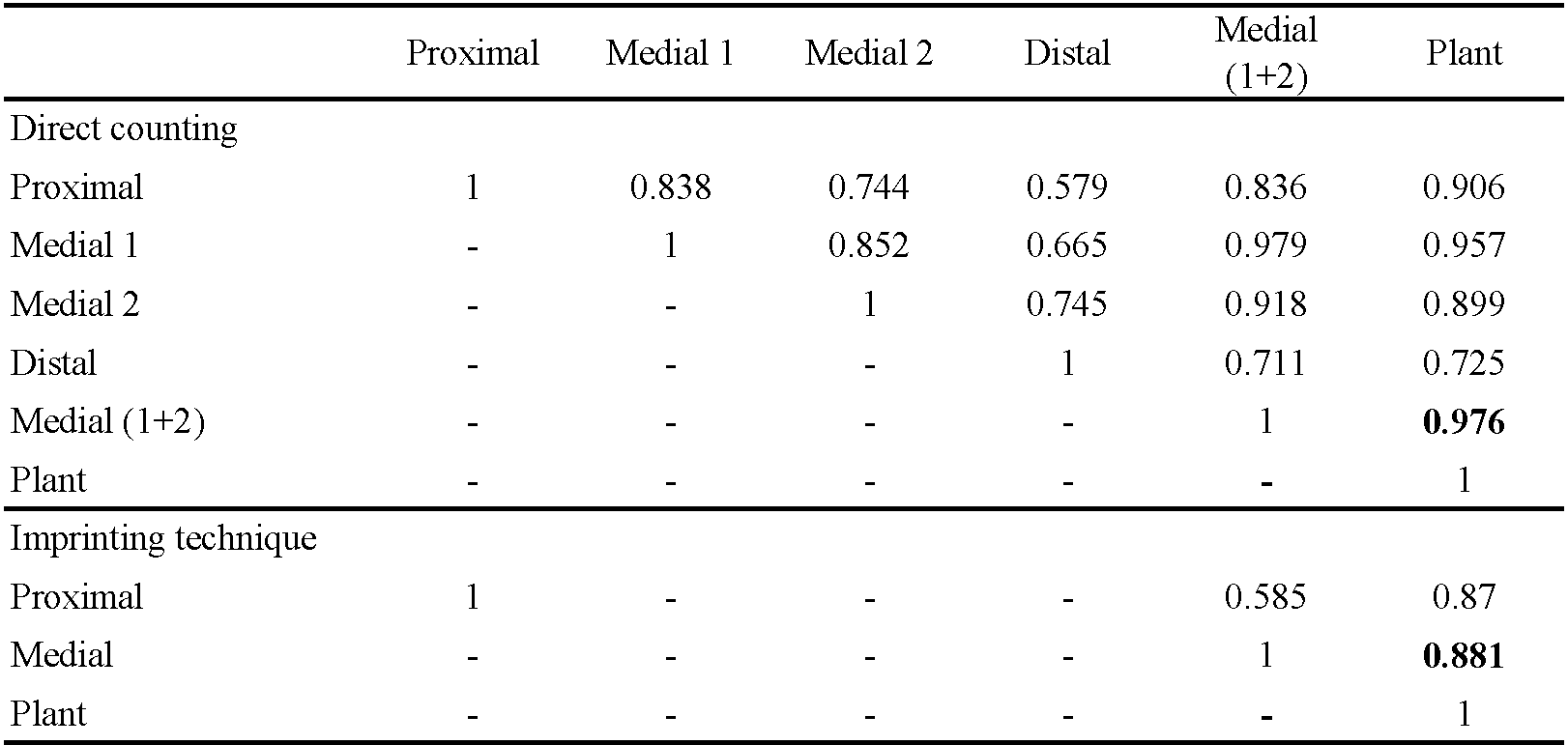 The associations between mite populations on entire plant and leaf portions in the imprinting technique were also moderate to very strong positives (Table 2). In addition, the association of the entire mites on canopy with the mites on medial portion was stronger than the proximal portion.
