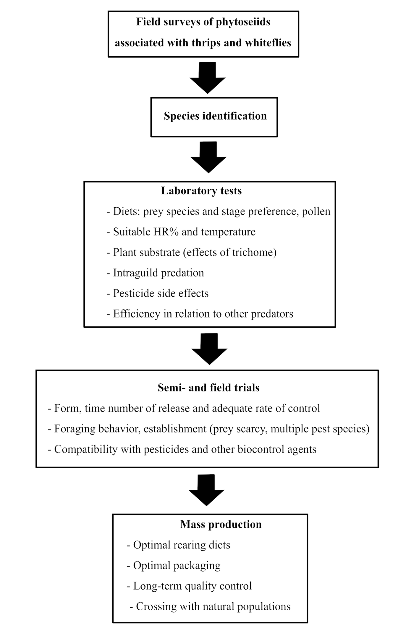 A total of 40 phytoseiid species have been shown their ability to predate, develop and reproduce on one or several species of thrips and whiteflies. Among them, 11 species are specialists and prefer feeding on Tetranychidae or other phytophagous mite family members (Eriophyidae, Tarsonemidae or Tenuipalpidae). Eleven species have shown good performance on thrips and whiteflies, and have already been commercially available as biological control agents, most of them on greenhouse crops. They all belong to the subfamily Amblyseiinae and are generalist predators most are found on plants with glabrous leaves, from soil/litter habitats, or are pollen-feeding predators. Amblyseius swirskii was the most studied and used for biological control of at least six thrips and two whiteflies species in greenhouses with bean, cucumber, sweet pepper, eggplant, tomatoes, chrysanthemum, roses and poinsettia. Neoseiulus cucumeris, was mainly used for controlling many thrips species. Amblydromalus limonicus was used for both thrips and whiteflies. The 18 remaining species mostly belong to the subfamily Amblyseiinae and nine of them originated from the oriental biogeographical zone. Amblyseius eharai, P. lenis and P. mexicanus were promising candidates for the biological control of thrips. However, additional studies (i.e. effects of abiotic factors, predation capacity, and ability to mass production) are needed to confirm their performance and potential establishment in the field. Similarly, A. herbicolus, A. largoensis, E. concordis and N. tunus could be promising control agents of whitefly species. However, evaluation of their biological traits, prey species preference and their performances under semi-field and field conditions should essentially be examined and. Few data are available about the performance of the last 11 remaining species as predators of thrips and whiteflies. It is difficult to confirm their effectiveness since extensive future research (evaluation of life history traits, prey preference and alternative food, computability with pesticides, effects of abiotic factors, effects of host plant traits, intraguild predation, development of mass production) is necessary.