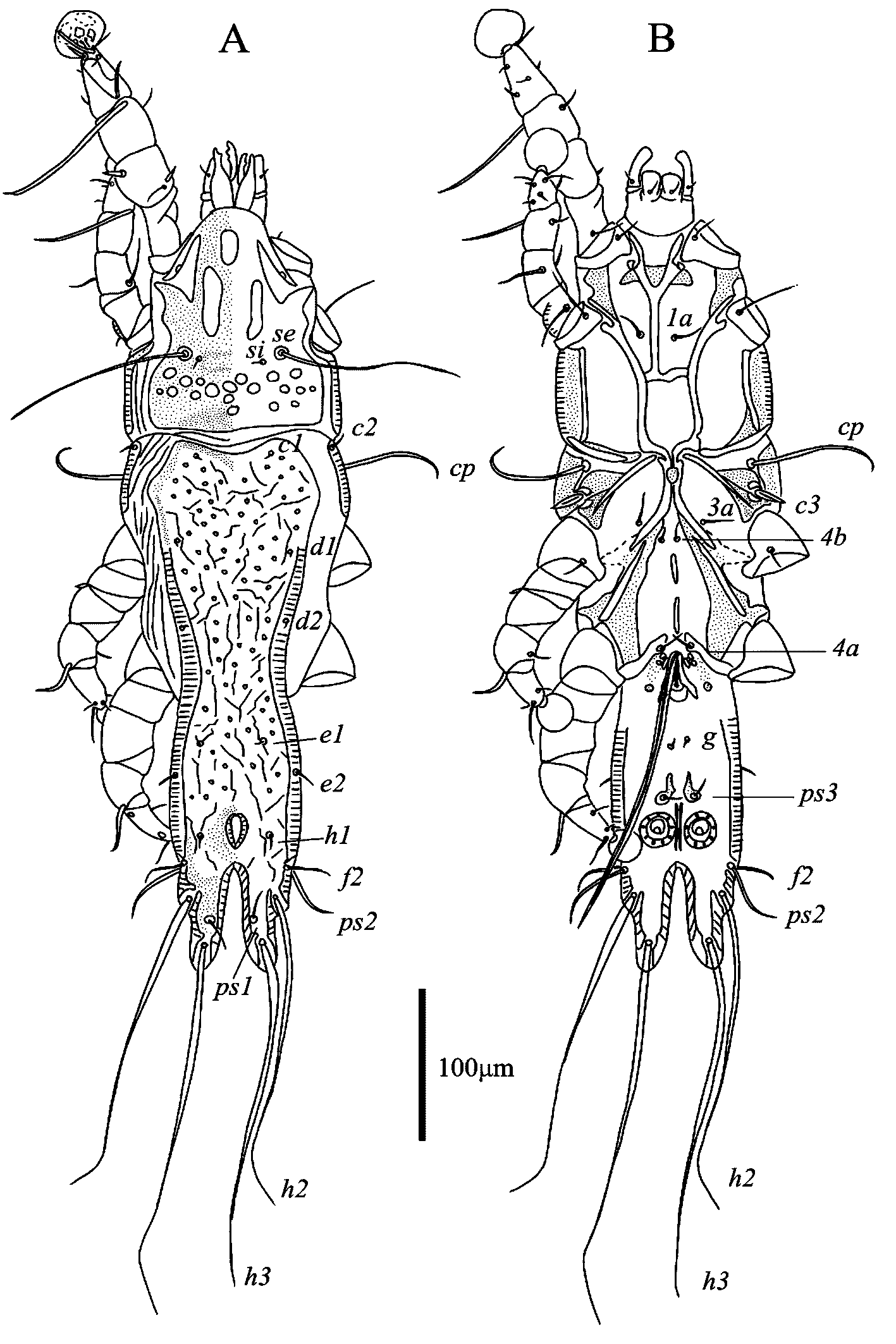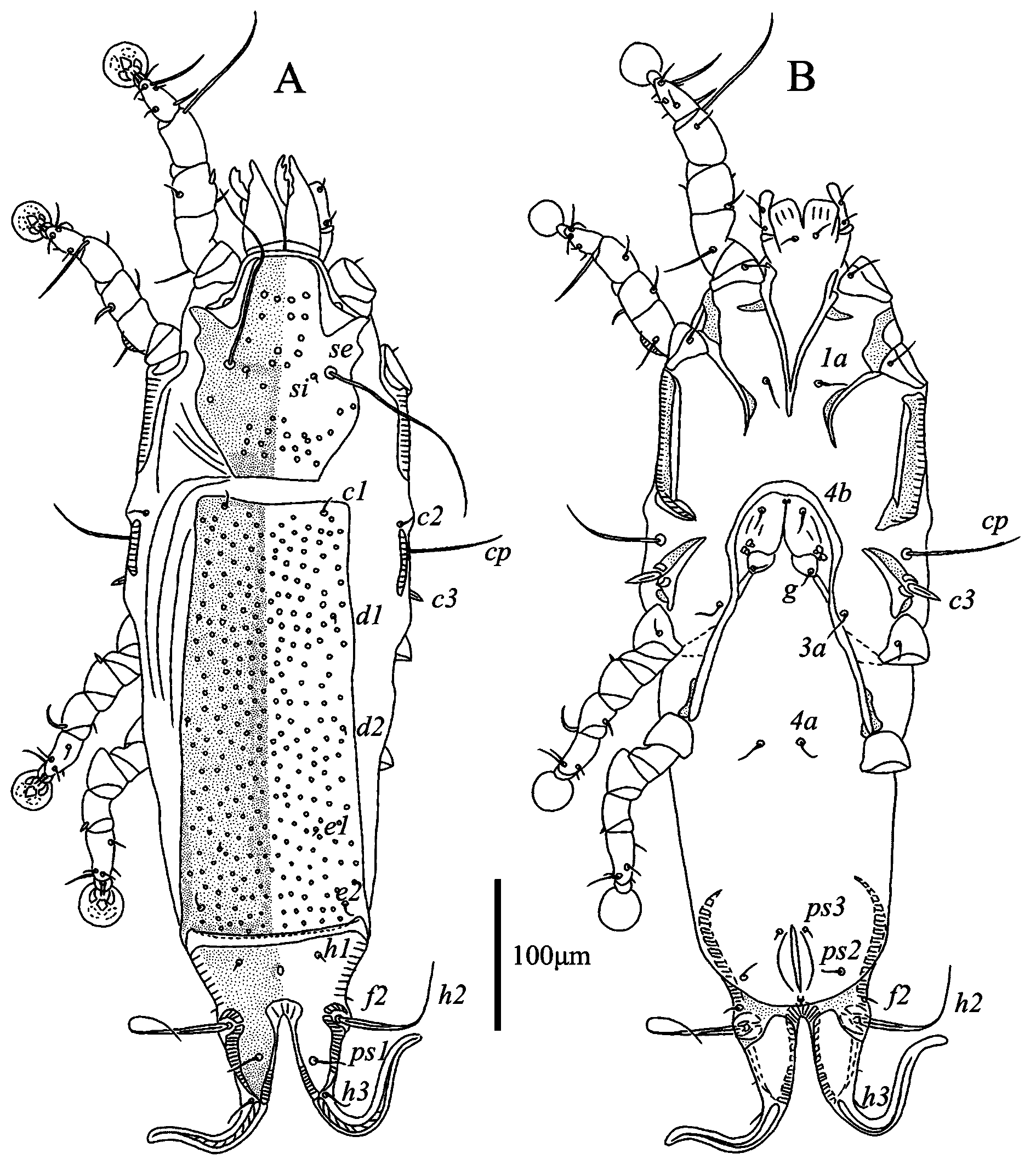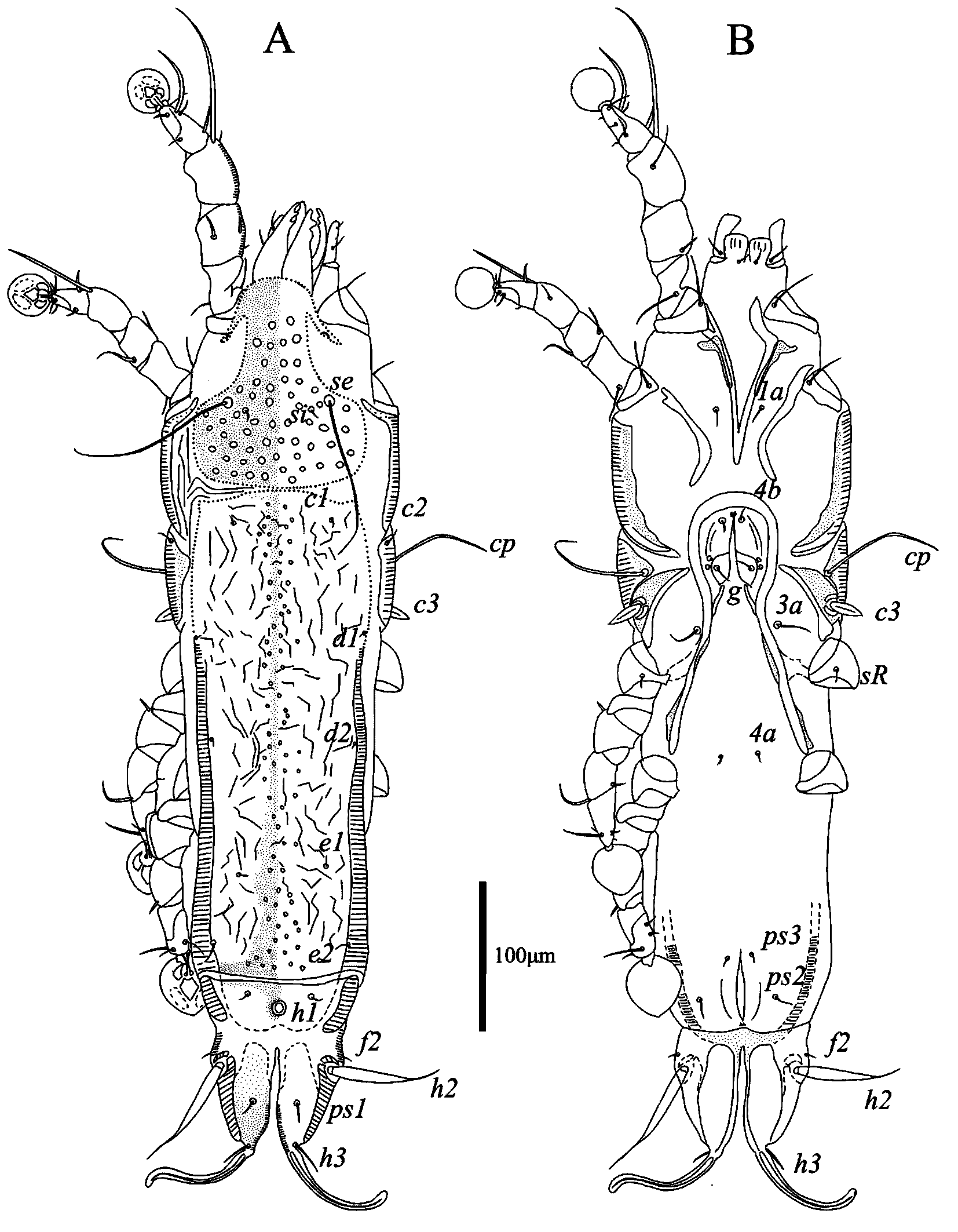 Female — (range for 6 paratypes) (Figs. 3, 4). Idiosoma length 539–588, width 140–176, hysterosoma length 371–421. Prodosal shield: entire, without clearly outlined border, without antrolateral extensions; most surface except anterior end with numerous circular and ovate lacunae; length146–163, width 105–131. Scapular setae se separated by 66–79. Scapular shield narrow. Humeral shields narrow, connected by posterior ends to epimerites Ⅲ. Setae cp situated on ventral margin of humeral shield, setae c2 situated on anterior end of humeral shield. Setae c3 lanceolate, 23–24 × 8–9. Distance between prodorsal and hysteronotal shields 1–4. Hysteronotal shield separated into anterior and lobar parts by narrow transverse band of soft tegument. Anterior hysteronotal shield: anterior margin and lateral margins up to level of trochanters III poorly outlined, narrow median area strongly sclerotized and with numerous small circular lacunae, remaining surface with irregular sparsely disposed striae, lateral areas are poorly sclerotized like soft tegument, length 305–103, width at anterior margin 146–163. Length of lobar region 104–117, width at level of setae h2 84–88. Terminal cleft shaped as a narrowly V, length 62–74, and greatest width at level of setae h3 12–20. Supranal concavity circular, clearly outlined. Setae h1 situated on lobar shield anterior to supranal concavity. Setae h2 spindle-shaped, with short terminal filaments, 92–114 × 8–10. Setae ps1 close to inner margin of opisthosomal lobes, approximately equidistant from levels of setae h2 and h3. Setae h3 19–26 long, about 1/3 the total length of terminal appendages (Fig. 3A). Dorsal measurements: c2–d2 129–149, d2–e2 111–133, e2–h2 78–83, h2–h3 45–55, d1–d2 53–78, e1–e2 46–53, h1–h2 43–50, h2–ps1 17–23, h1–h1 40–44, h2–h2 65–70.