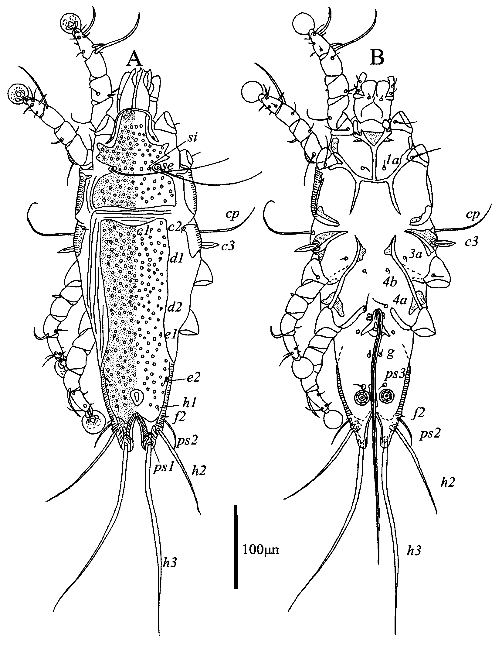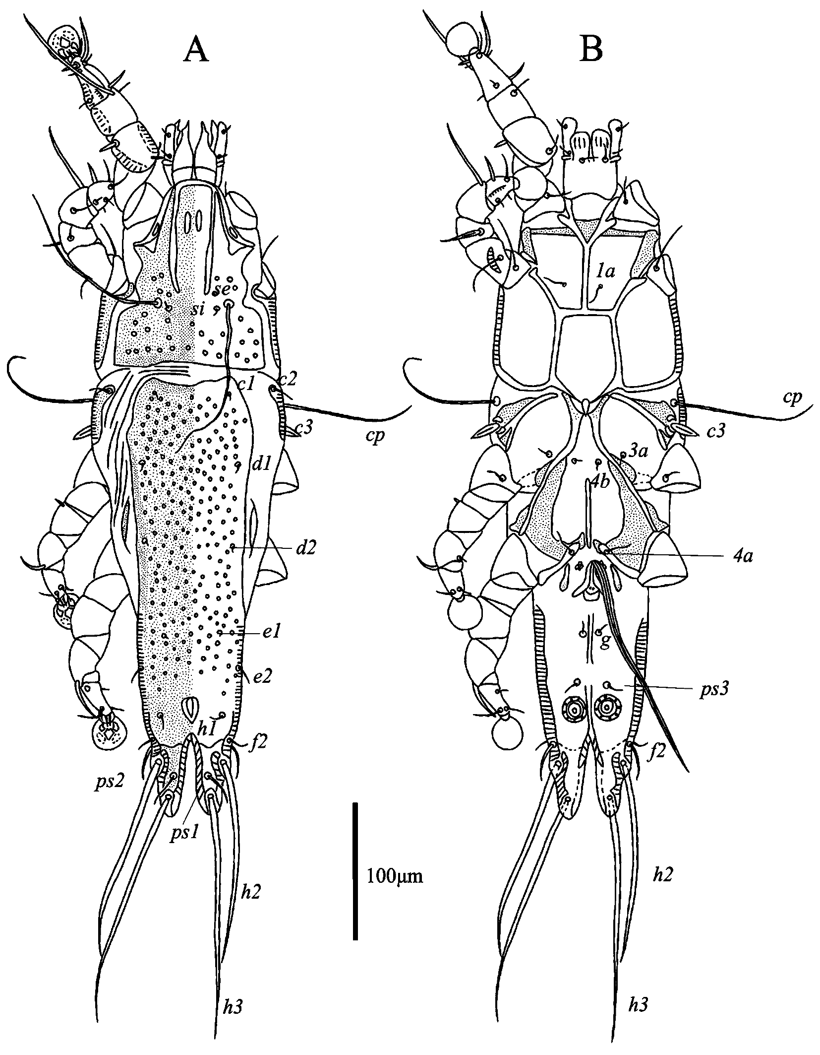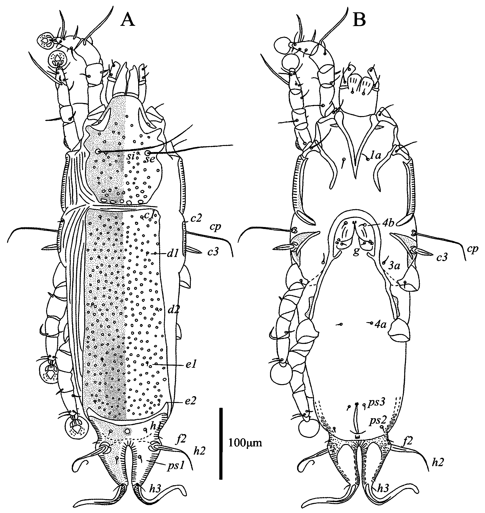 Female — (range for 6 paratypes) (Figs. 3, 4). Idiosoma length 539–588, width 140–176, hysterosoma length 371–421. Prodosal shield: entire, without clearly outlined border, without antrolateral extensions; most surface except anterior end with numerous circular and ovate lacunae; length146–163, width 105–131. Scapular setae se separated by 66–79. Scapular shield narrow. Humeral shields narrow, connected by posterior ends to epimerites Ⅲ. Setae cp situated on ventral margin of humeral shield, setae c2 situated on anterior end of humeral shield. Setae c3 lanceolate, 23–24 × 8–9. Distance between prodorsal and hysteronotal shields 1–4. Hysteronotal shield separated into anterior and lobar parts by narrow transverse band of soft tegument. Anterior hysteronotal shield: anterior margin and lateral margins up to level of trochanters III poorly outlined, narrow median area strongly sclerotized and with numerous small circular lacunae, remaining surface with irregular sparsely disposed striae, lateral areas are poorly sclerotized like soft tegument, length 305–103, width at anterior margin 146–163. Length of lobar region 104–117, width at level of setae h2 84–88. Terminal cleft shaped as a narrowly V, length 62–74, and greatest width at level of setae h3 12–20. Supranal concavity circular, clearly outlined. Setae h1 situated on lobar shield anterior to supranal concavity. Setae h2 spindle-shaped, with short terminal filaments, 92–114 × 8–10. Setae ps1 close to inner margin of opisthosomal lobes, approximately equidistant from levels of setae h2 and h3. Setae h3 19–26 long, about 1/3 the total length of terminal appendages (Fig. 3A). Dorsal measurements: c2–d2 129–149, d2–e2 111–133, e2–h2 78–83, h2–h3 45–55, d1–d2 53–78, e1–e2 46–53, h1–h2 43–50, h2–ps1 17–23, h1–h1 40–44, h2–h2 65–70.