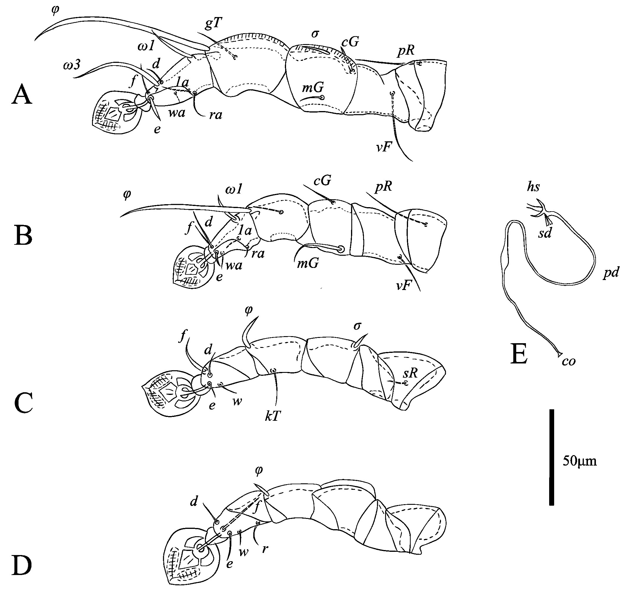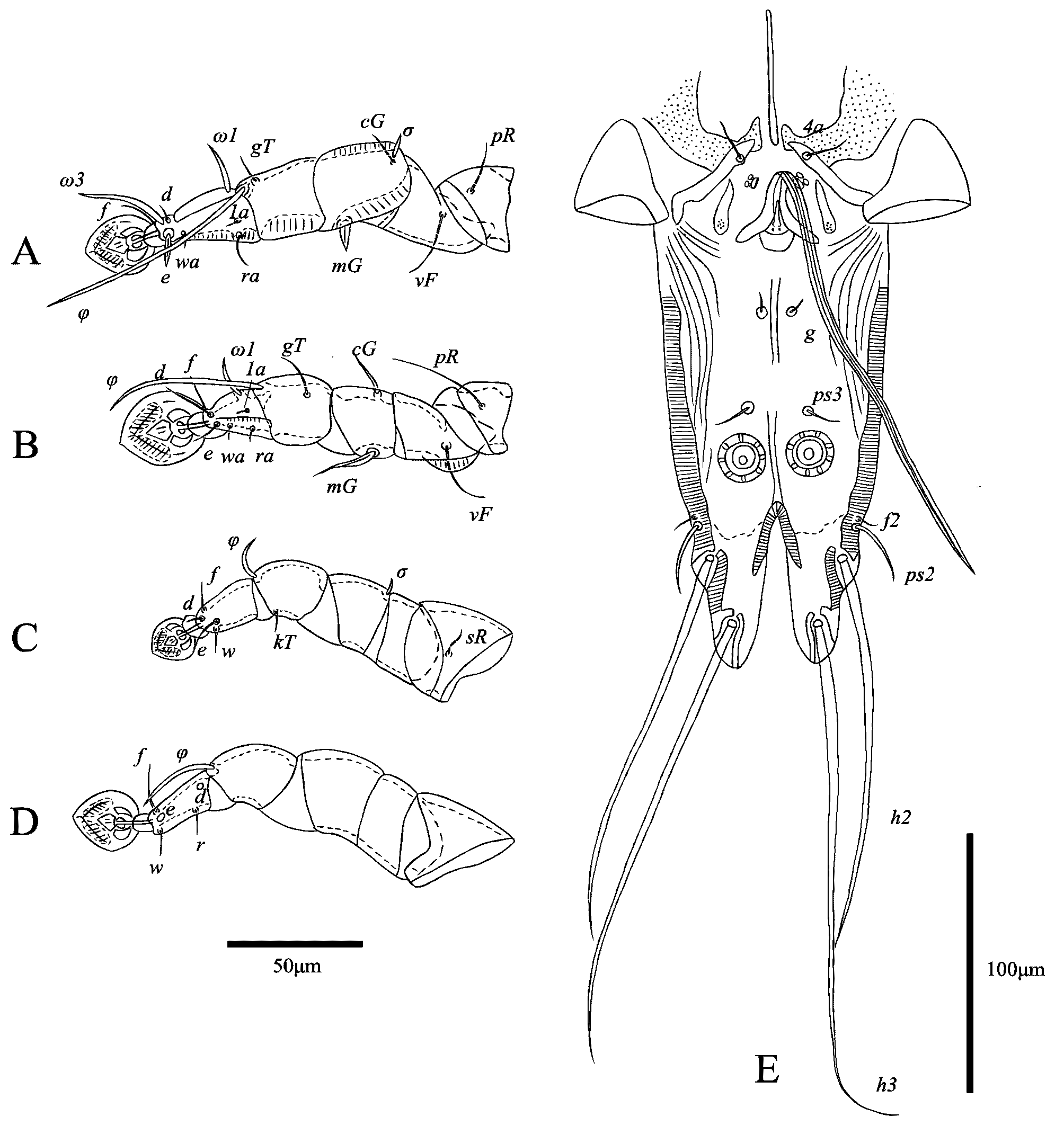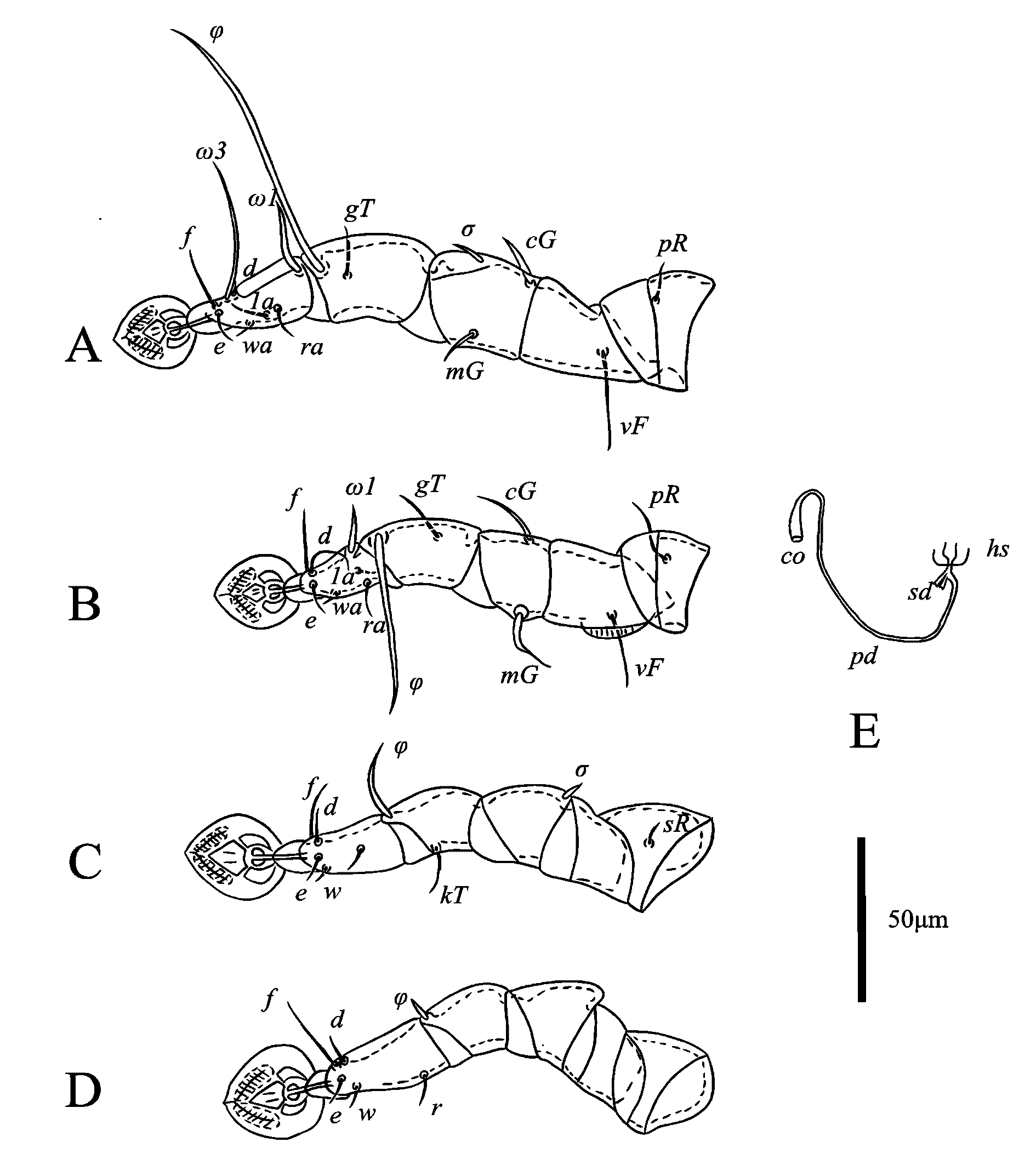 Legs Ⅰ longer and thicker than legs Ⅱ; femur Ⅱ with ventral crest, Solenidion σ of genu Ⅰ stick-like, 10 (7–8) long, situated at base of segment. Setae cG Ⅰ, cG Ⅱ setiform; seta mGⅡ thickened with filiform apex, 14 (14–18) long, seta mG Ⅰ spiculiform, 11 (10–12) long; seta cG Ⅱ longer than seta cG Ⅰ. Seta e of tarsus Ⅰ thick spiniform, 15 (9–17) long. Setae d, f of tarsus Ⅱ subequal in length (Fig. 10A, B). Setae f of tarsus Ⅲ approximately 2 times longer than setae d. Leg Ⅲ, Ⅳ similar in size. Tarsus Ⅳ 28 (26–30) long, without apical claw, with a small apicoventral extension bearing seta w; setae d, e button-like, situated in basal and apical parts of this segment, respectively (Fig. 10D). Lengths of solenidia: ω1Ⅰ 13 (10–12), ω1Ⅱ 10 (7–11), φⅠ 79 (72–81), φⅡ 57 (54–59), φⅢ 22 (21–27), φⅣ 30 (24–28).