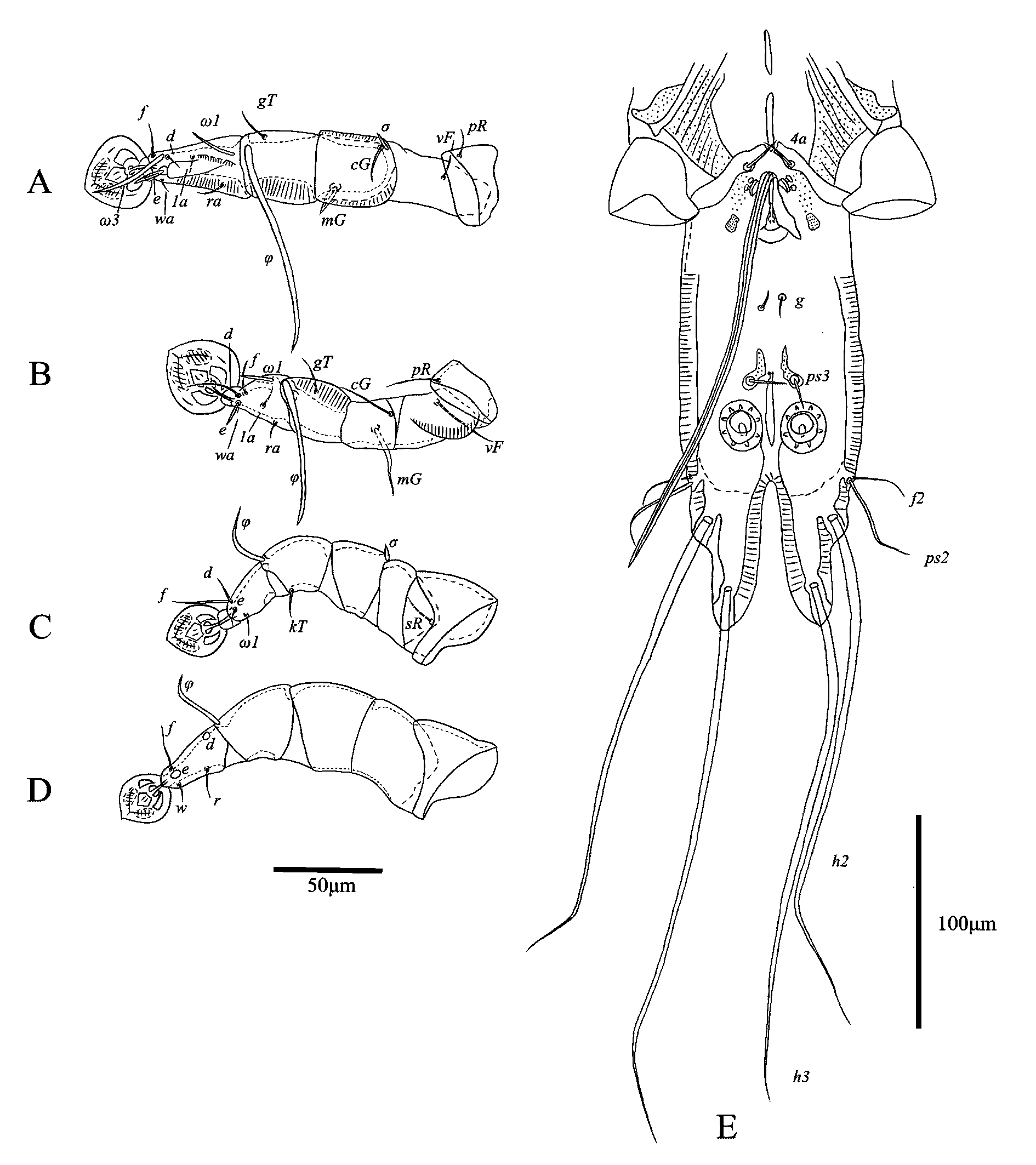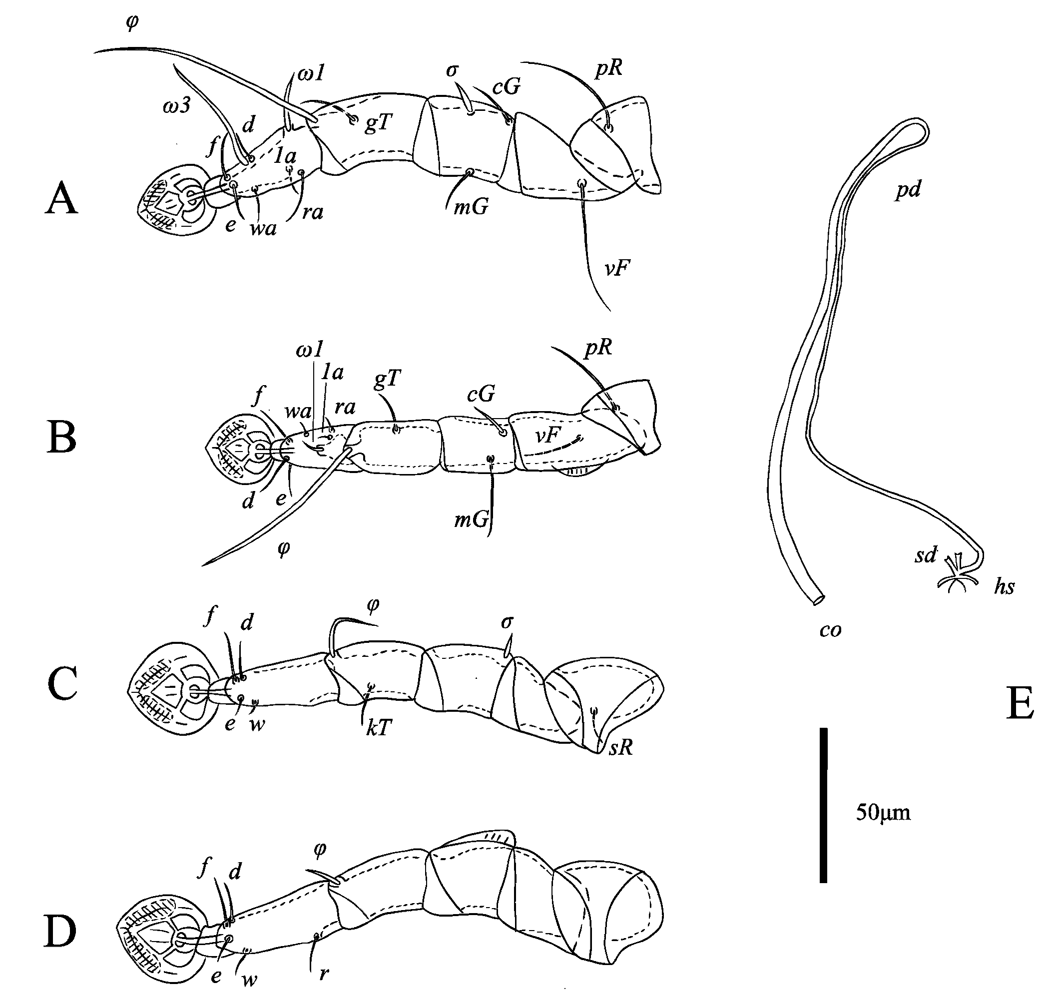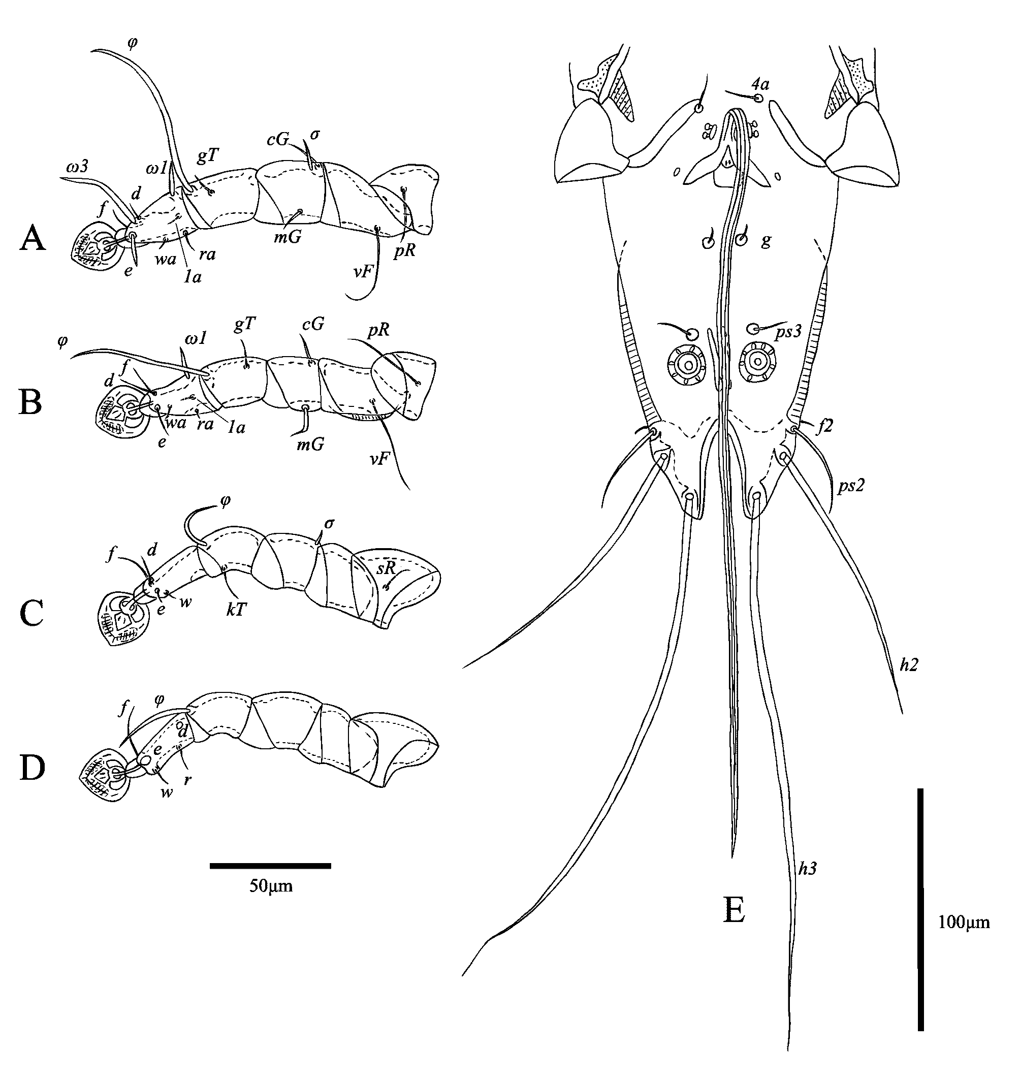 Legs Ⅰ longer and thicker than legs Ⅱ; femur Ⅱ with ventral crest, Solenidion σ of genu Ⅰ stick-like, 10 (7–8) long, situated at base of segment. Setae cG Ⅰ, cG Ⅱ setiform; seta mGⅡ thickened with filiform apex, 14 (14–18) long, seta mG Ⅰ spiculiform, 11 (10–12) long; seta cG Ⅱ longer than seta cG Ⅰ. Seta e of tarsus Ⅰ thick spiniform, 15 (9–17) long. Setae d, f of tarsus Ⅱ subequal in length (Fig. 10A, B). Setae f of tarsus Ⅲ approximately 2 times longer than setae d. Leg Ⅲ, Ⅳ similar in size. Tarsus Ⅳ 28 (26–30) long, without apical claw, with a small apicoventral extension bearing seta w; setae d, e button-like, situated in basal and apical parts of this segment, respectively (Fig. 10D). Lengths of solenidia: ω1Ⅰ 13 (10–12), ω1Ⅱ 10 (7–11), φⅠ 79 (72–81), φⅡ 57 (54–59), φⅢ 22 (21–27), φⅣ 30 (24–28).