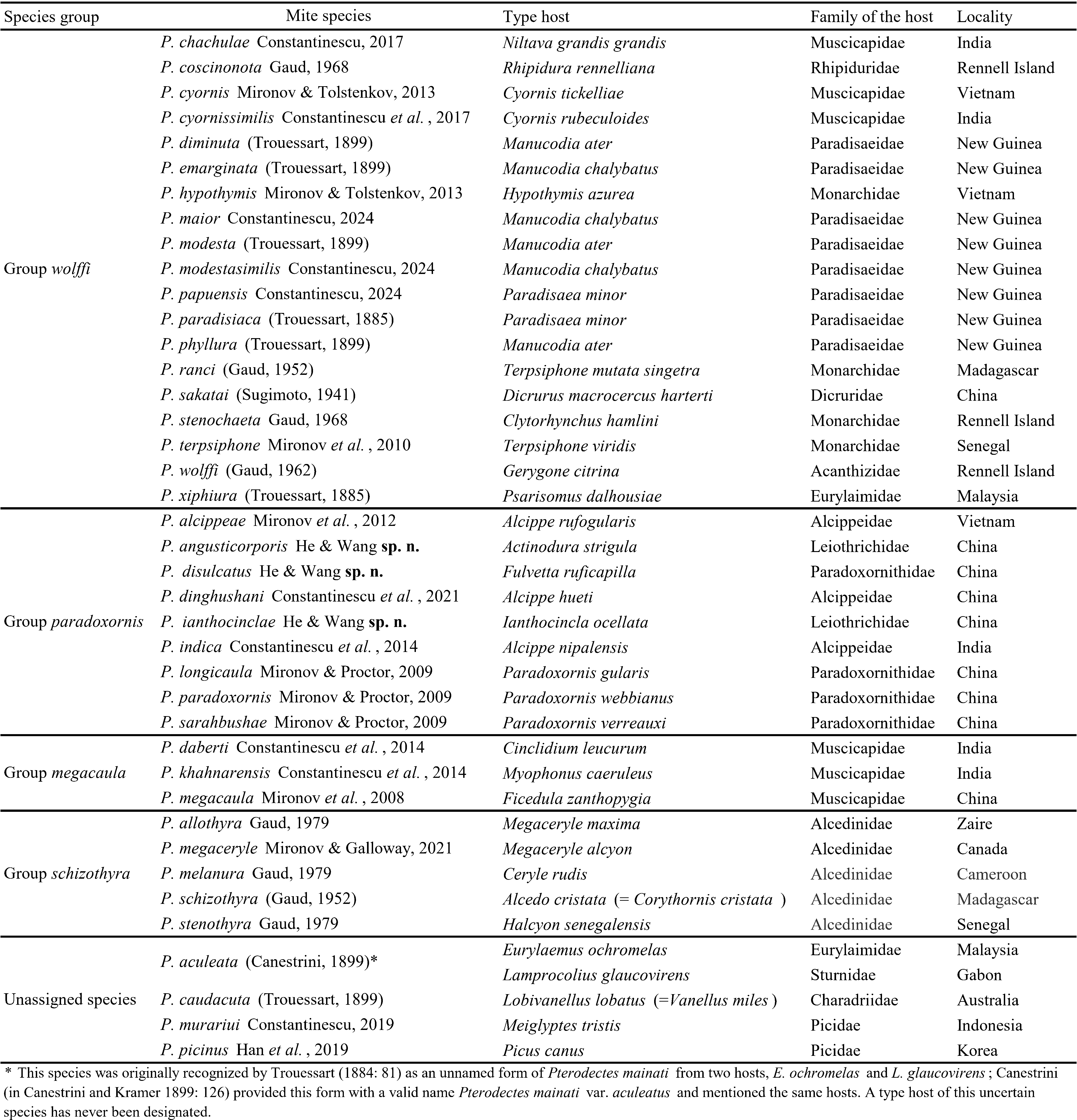 https://doi.org/10.24349/y1xh-2eq2Feather mites of the genus Proterothrix Gaud, 1968 (Astigmata: Proctophyllodidae: Pterodectinae) have been found, to date, on birds of the orders Passeriformes, Coraciiformes, and Piciformes. According to the current taxonomic concept, the subfamily Pterodectinae is divided into the tribes Ramphocaulini and Pterodectini; in turn, the tribe Pterodectini is divided into the generic groups Pterodectes and Proterothrix (Mironov, 2009; Hernandes and Valim 2014). The genus Proterothrix belongs to the latter group and, is characterized by setae ps3 situated anteromesal to the adanal suckers in males and seta wa situated anterior to setae ra and la on tarsi Ⅰ and Ⅱ in both sexes (Mironov 2009; Mironov and Proctor 2009; Mironov and OConnor 2017; Constantinescu et al. 2017b, 2019). To date, the genus Proterothrix has included 37 species; of these, 33 species were arranged in four species groups: wolffi (19 species), paradoxornis (6 species), schizothyra (5 species) and megacaula (3 species) (Table 1). Representatives of the schizothyra group are restricted to kingfishers (Coraciiformes: Alcedinidae). Species of the wolffi group are associated with various passerine families (Passerifomes), while those of the megacaula group are only known from the passerine family Muscicapidae. (Gaud 1952, 1962, 1968, 1979; Park and Atyeo 1971; Mironov 2009; Mironov and Proctor 2009, 2023; Mironov et al. 2008, 2010, 2012, Mironov and Tolstenkov 2013; Constantinescu et al.2014, 2017a, 2017b, 2018, 2019, 2021, 2024; Han et al. 2019; Mironov and Galloway 2021). Mites of the schizothyra group have coxal fields III in males open, the terminal cleft in females with distinctly divergent margins (V-shaped); those of the megalcaula group are characterized by the absence of dorsal setae c1 in both sexes and an extremely long aedeagus in males (Constantinescu et al., 2014, 2021). The wolffi group is characterized by the coxal fields Ⅲ in males closed or with a very narrow gap in the anteromesal part and the terminal cleft in females usually parallel-sided (Mironov et al. 2008). In the wolffi group, Mironov and Proctor (2009) recognized the paradoxornis species complex, which is characterized by lanceolate seta e on tarsus Ⅰ in males. As recently proposed by Mironov and Galloway (2021), it is reasonable to treat this complex as a fourth species group in Proterothrix.