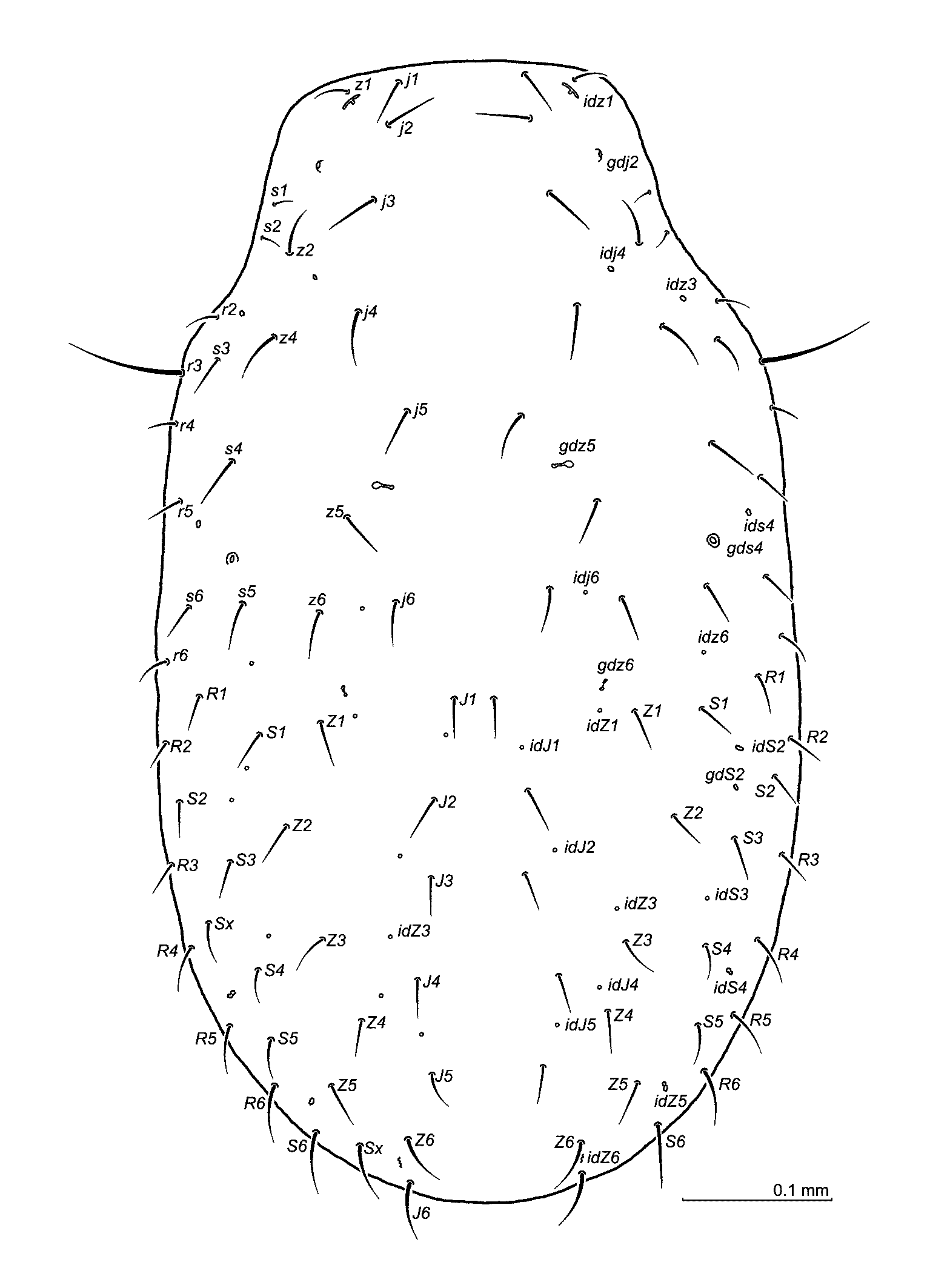 Idiosoma — Oval and well sclerotised, 740–800 x 410–450 (length x width, n=5). Podonotum – 22 pairs of setae (r1 and z3 lacking), podonotum setae lengths 29– 52 (j1 44– 52), s1 and s2 ca. 32–39 long, r3 ca. 94–97, r4 ca. 20 –24. Opisthonotum – with 24 pairs of normal setae, but one or two supplementary setae (Sx) may also be present. Setae on the opisthonotum are similar in length to the podonotal ones, and range from ca. 27 to 39, but posterior marginal setae may reach 39–52. Dorsal setae simple, podonotum not reticulated, opisthonotum with a scale-like reticulation. Peritreme – length 305–320, ending anteriorly at the Co I level.