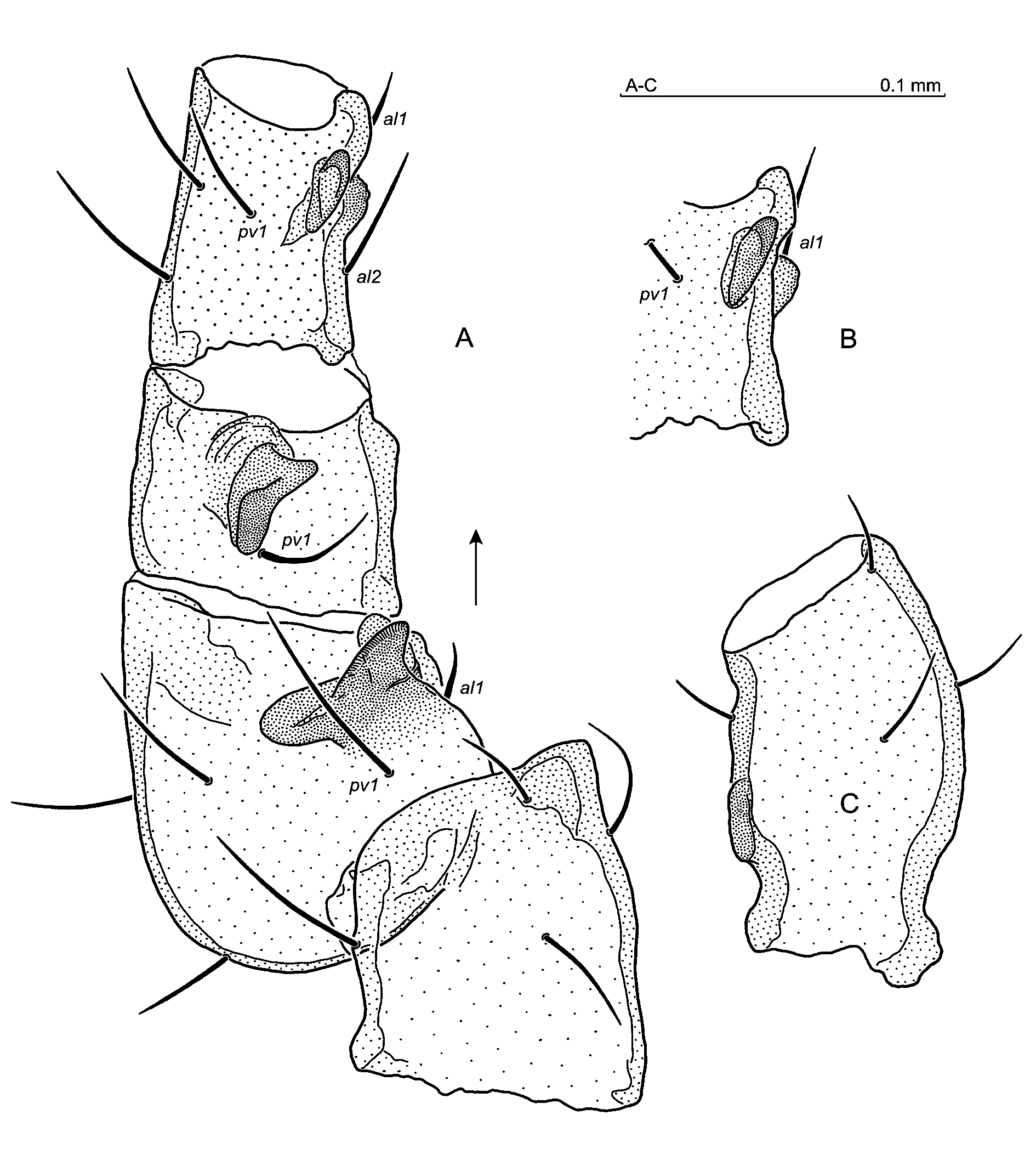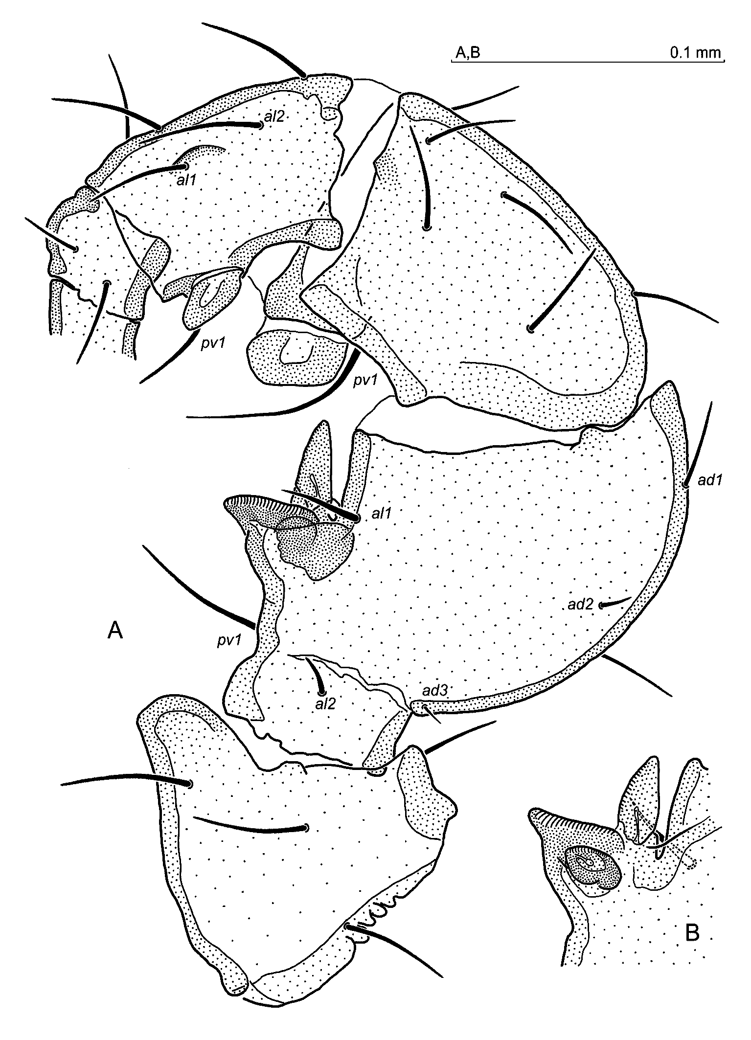 Legs — Seta al on Tr I somewhat shorter, seta al1 on Fe I normal, al2 minute. Leg II: setae al1, al2 on Fe II shortened. Leg IV: posterolateral setae on the femur shorter than others, posteroventral setae on Ge II, Ti II, Ge IV and Ti IV thicker than anteroventral ones. Tarsal tactile seta pd1 thin and long. Trochanter IV with a posterolateral tubercle (Fig. 3B). Ta IV 191–202 long. Other aspects of legs I–IV unremarkable.