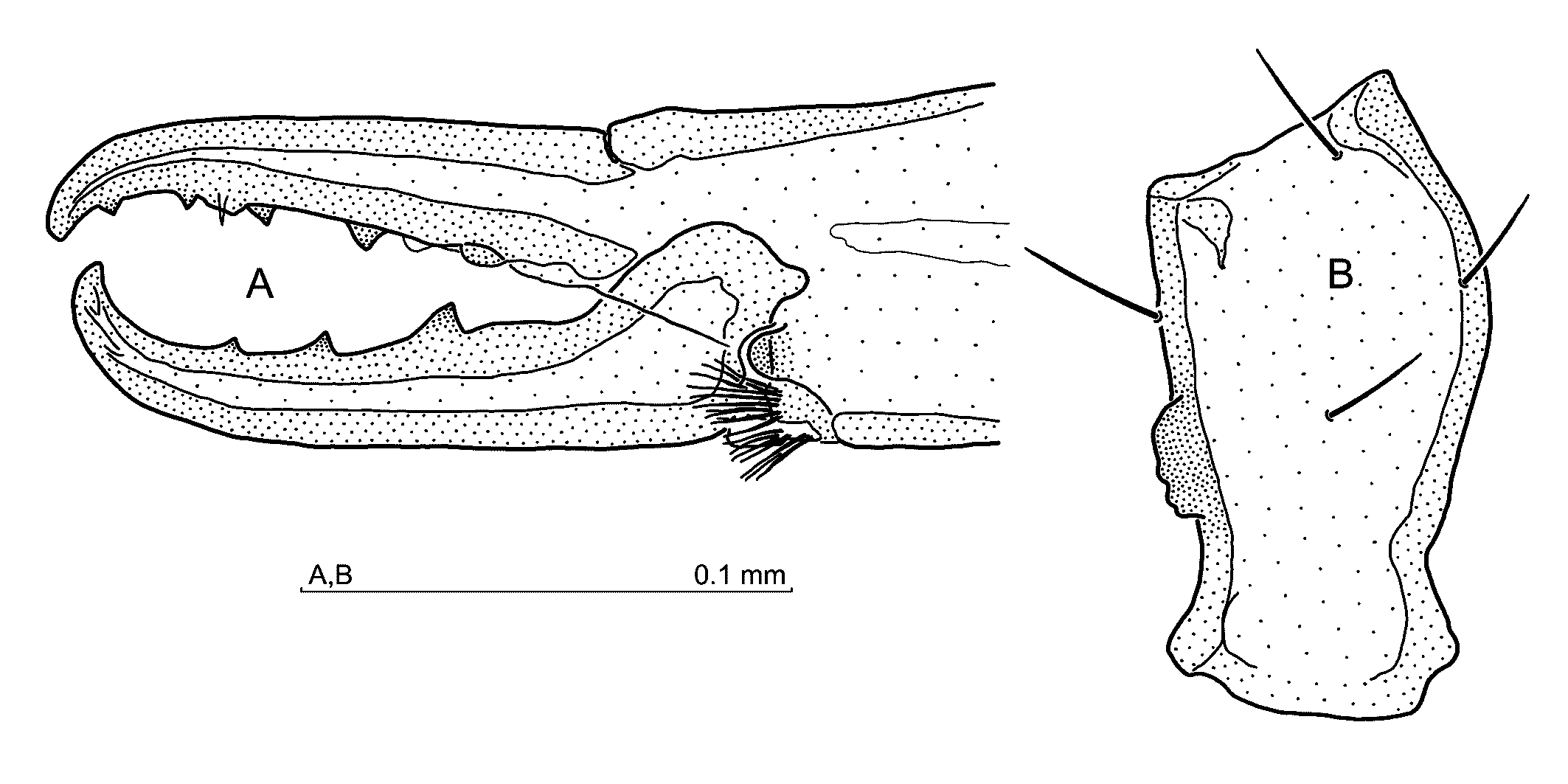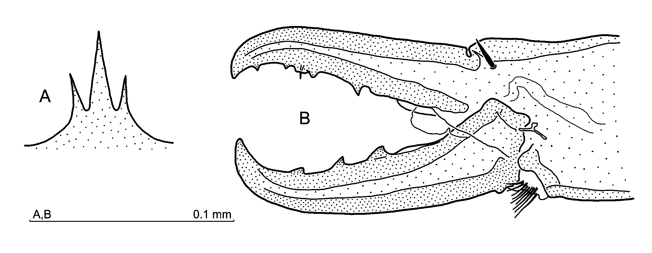 Gnathosoma — Gnathotectum (Fig. 8A) with all prongs similarly narrow and acute, the central one more than twice as long as the lateral prongs. Corniculi conical, hypostome with 10 rows of denticles, hypostomatic and palpcoxal setae simple, similar in length. Palptrochanter v1 seta simple, v2 barbed in distal half. Chelicera (Fig. 8B) – movable digit with three teeth, fixed digit with one blunt tooth by the side of pilus dentilis, two distant teeth ahead of the pilus dentilis, and two behind it.