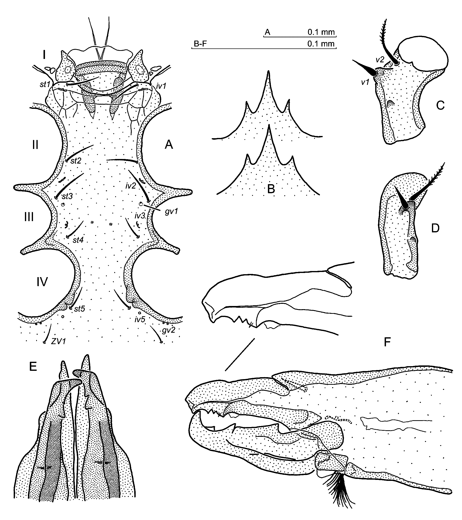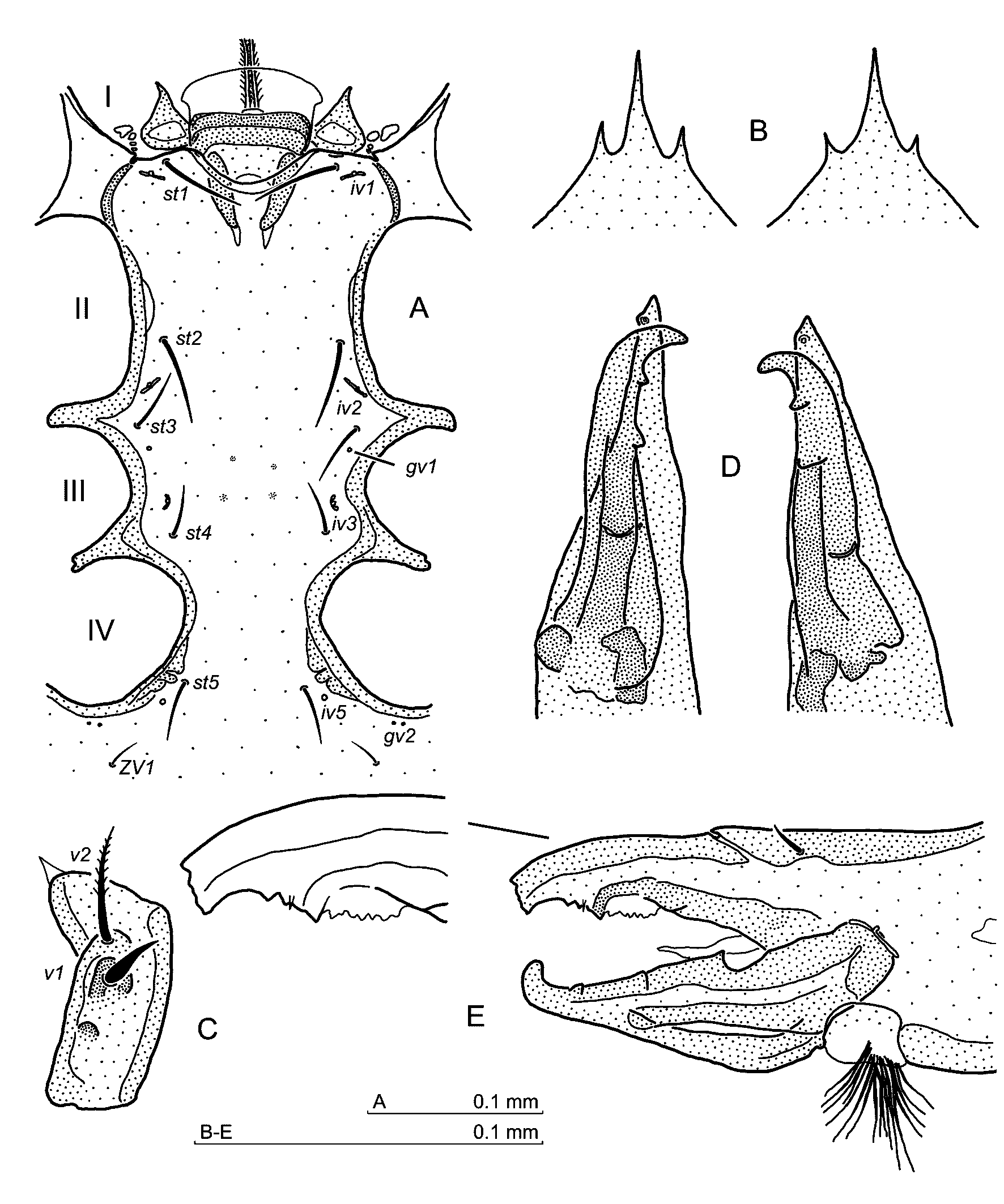 Ventral idiosoma — Setae length: 40–43 (st1), 33–36 (st2), 34–38 (st3), 25–27 (st4), 30–33 (st5), opisthogastral setae 34–39 (JV1–JV3), 47–51 (JV4), 16–22 (ZV1), 25–28 (ZV2), 37–39 (ZV3, ZV4), 40–46 (ZV5), 31–34 (SV3). Ventral setae simple. Sternal region (Fig. 4A) – anterior margin of the genital lamina convex, its corners rounded and extended laterally. Presternal plates drop-shaped. Sternum with gland pores gv1 located laterally, behind setae st3. Two pairs of slight thickenings of the sternal cuticle are present at the level of pores gv1 and iv3. Gland pore gv2 with two openings, pores iv5 at 1/4 behind st5 seta towards seta ZV1. Pores ivo2, ivo3, and gv3 clearly visible.