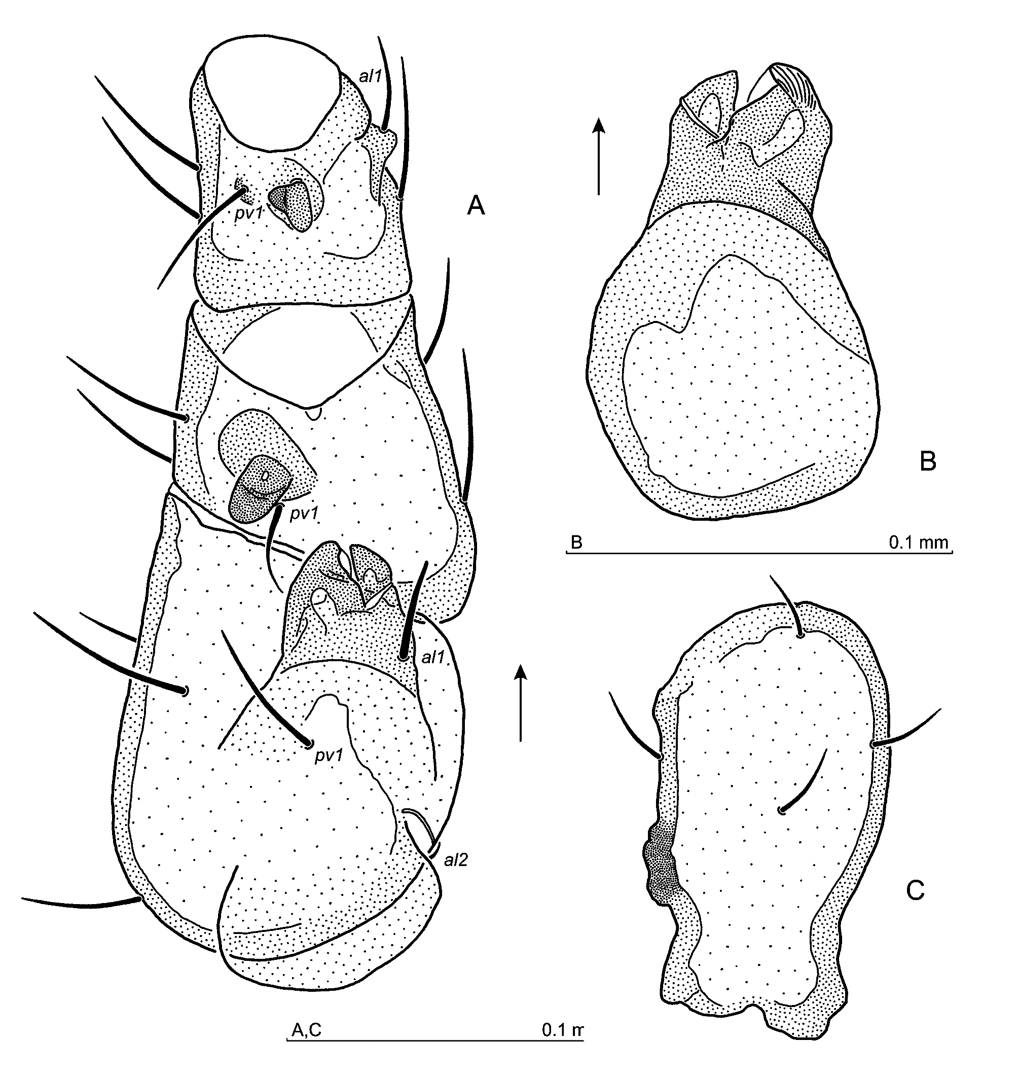 Legs — Leg II spurred as follows: when viewed from the ventral side (Fig. 10A), the main femoral spur is short and bifurcate, the axillary process elongated, ending at the level of the article's distal margin. The genual spur arcuate, located on the elevation and oriented obliquely towards article's axis, the tibial spur conical, with a rounded apex (Fig. 10B). From the lateral perspective (Fig. 11), Tr II distal margin forms a large protrusion, the main femoral spur short and triangular, the axillary process also triangular, but narrower and ending at the article's distal margin. Main spur oriented towards the axillary process at a right angle. Genual spur quadrilateral, located on the protrusion at the distal article's margin, tibial spur triangular. Dorsal surface of the basitarsus is gibbous. Setae on leg II simple, femoral seta al1 somewhat thickened, al2 short and thickened, ad2 short, whereas ad3 short and needle-like. Seta al1 on Ti II located on the tubercle. Leg IV: Tr IV posterolateral margin of the trochanter with an elongated, low tubercle (Fig. 10C). Posteroventral setae on the genu and tibia, as well as av2, av3 and pv2 on the tarsus slightly thickened, tarsal av1 thicker than pv1. Tactile dorsal seta on Ta IV as in the female. Ta IV 220–230 long. Other aspects of legs I–IV unremarkable.