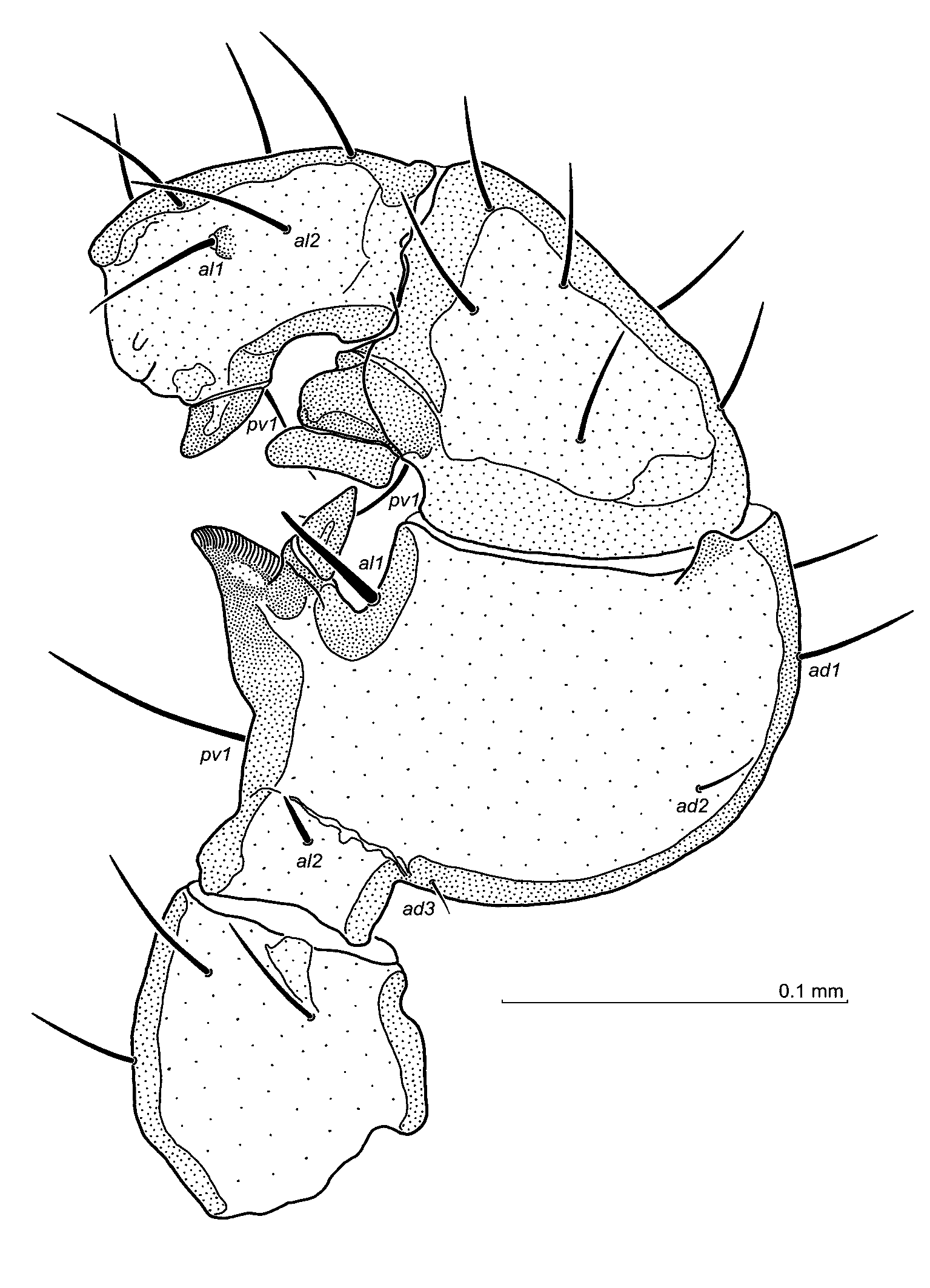Legs — Seta al on Tr I somewhat short, seta al1 and al2 on Fe I short. Leg II: setae al1, al2 on Fe II shortened. Leg IV: posteroventral seta on the genu and both ventral setae on the tibia thickened. On Ta IV seta av1 thickened, av2 thin, av2 and av3, as well as pv2 thickened. Tarsal tactile seta pd1 thin and long. Trochanter without a tubercle. Ta IV 215–230 long. Other aspects of legs I–IV unremarkable.
