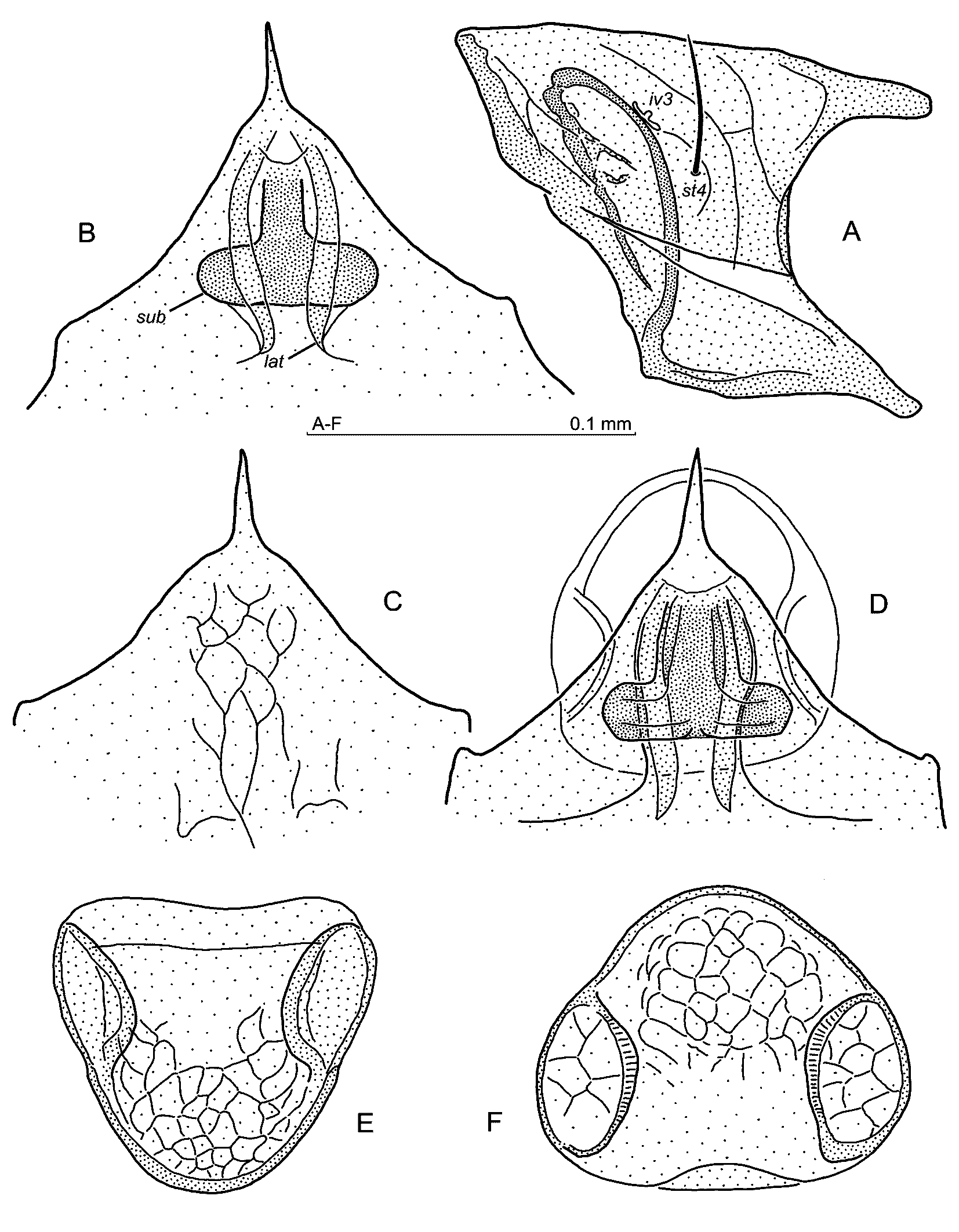 Ventral idiosoma — Setae length: 42–47 (st1), 39–44 (st2), 42–50 (st3), 33–37 (st4), 30–33 (st5), opisthogastral setae 35–44 (JV1–JV3), 52–55 (JV4), 22–25 (ZV1), 30–34 (ZV2), 38–41 (ZV3), 43–46 (ZV4–ZV5), 34–37 (SV3). Ventral setae simple, reticulation of the opisthogaster scale-like. The presternal plates subtriangular with a line parallel to the posterior edge, the area between the presternal plates and the sternum margin with 2–3 lines. Pores gv1 located behind setae st3, close to the posterior sternal margin. Paragynial shields (Fig. 7A) with narrow, arcuate metagynial sclerites. Epigynial shield with the central prong long and the anterior margins wavy (Fig. 7B–D). The lateral subapical thickenings arcuate, running backward somewhat convergently, central subapical, inverted T-shaped thickening with the rounded arm ends and the posterior edge usually straight or somewhat convex (Fig. 7B,D). Epigynium with scale-like reticulation also on the anterior prong (Fig. 7C). Endogynium (Fig. 7E,F) cup-shaped with two spherules located laterally and projecting inward. The endogynial sack is frequently directed anteriorly, so the posterior wall is directed dorsally, showing more or less distinct reticulation. The diameter of the endogynium exceeds nearly double the width of T-shaped subapical epigynial thickening (Fig. 7B,F). Gland pores gv2 with two openings, iv5, ivo2, ivo3 pores and gv3 gland pores clearly visible.