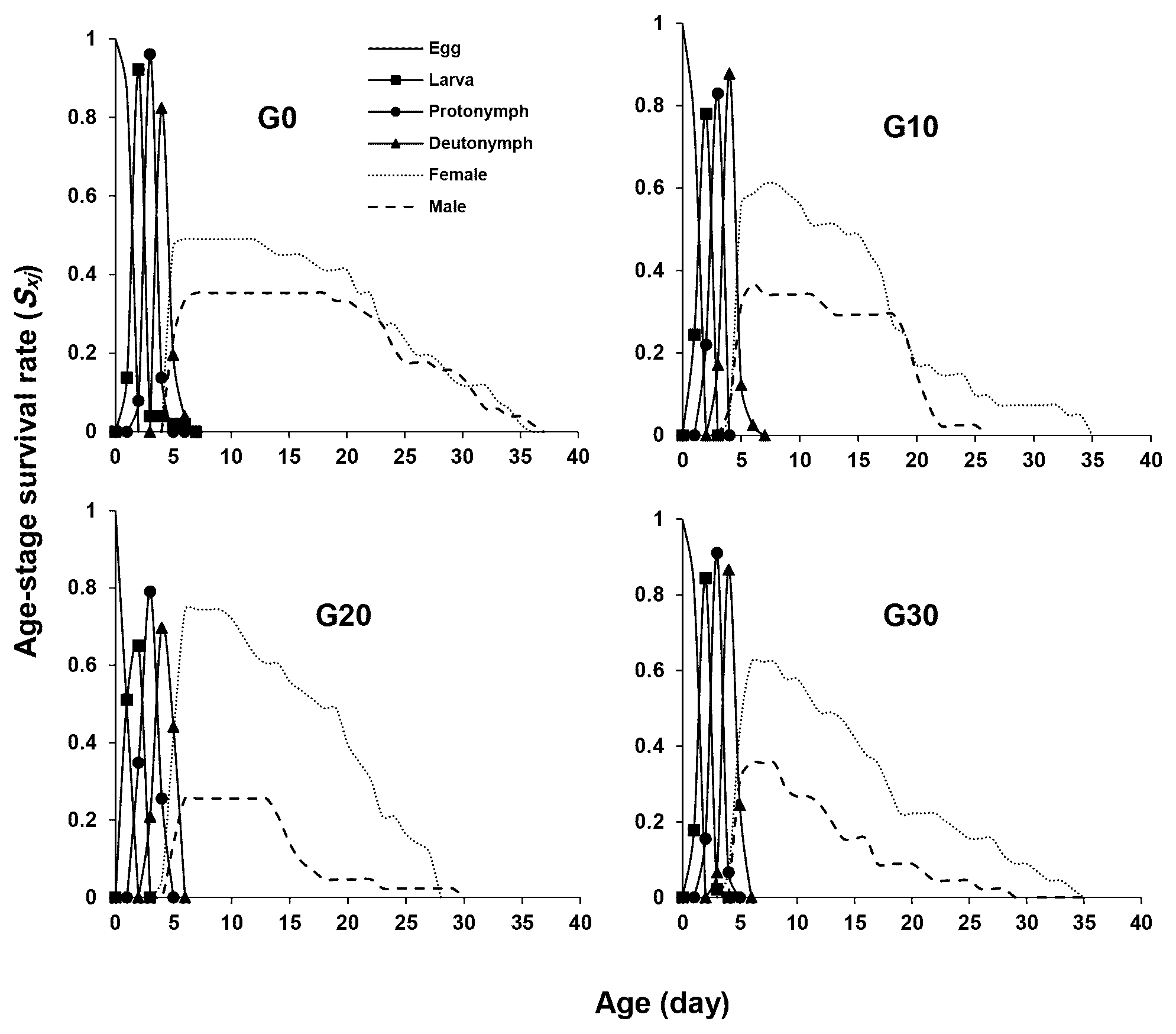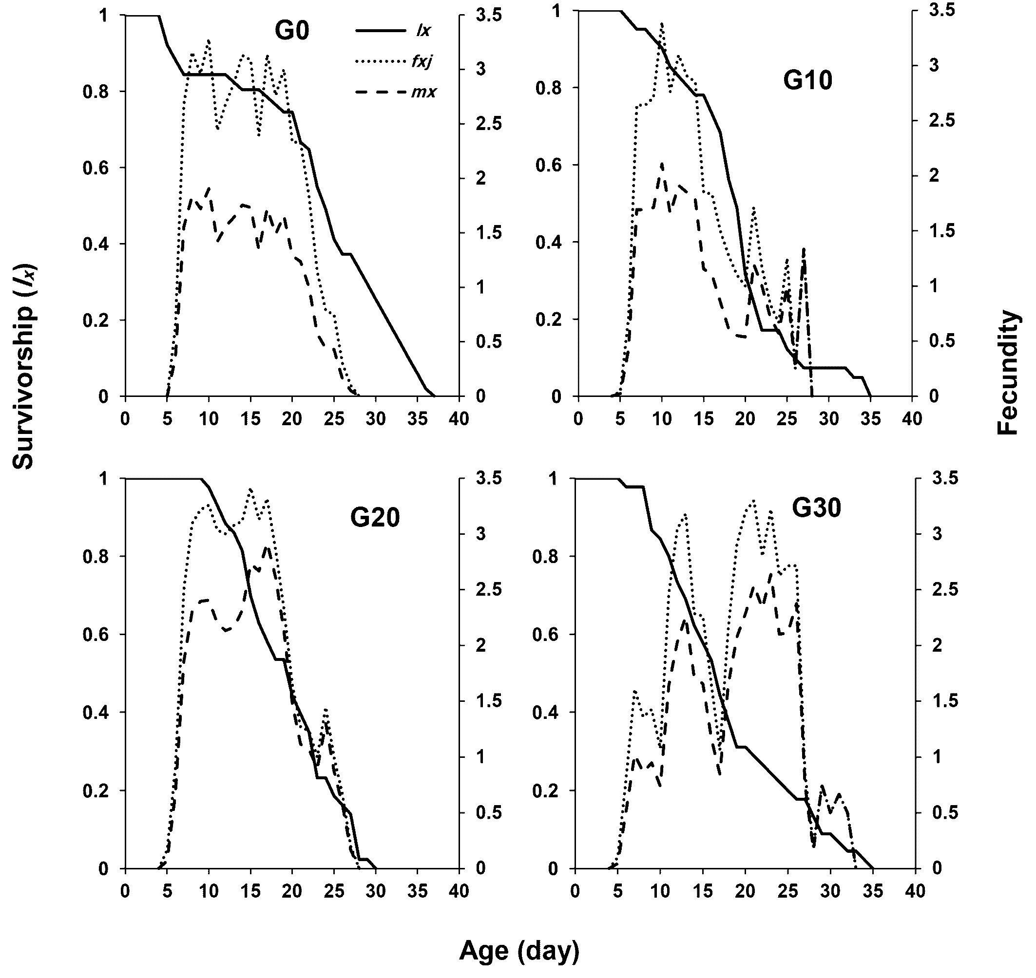 Figure 1 illustrates the age-stage survival rate (sxj ) of E. scutalis before and after different periods of rearing on cattail pollen with obvious overlap between stages as a consequence of differences in development rates among various individuals. Eggs and nymphs experienced generation-based variations in survival rates; rates were higher in G30 and lower in G20. Furthermore, the survival rates of adults in G20 and G30 were higher than G0 and G10 (Figure 1). The female age-specific fecundity (fx ) first raised quickly, peaked, and then decreased. The peak fx of E. scutalis was 3.41 eggs/female in G20, which was higher than that in G10 (3.39 eggs/female), G30 (3.30 eggs/female), and G0 (3.28 eggs/female) (Figure 2). The age-specific survivorship (lx ) for immature stages was 1 in all generations tested except for G0 (0.92). The age specific fecundity (mx ) was highest in the mentioned treatments at the age of 11 (1.91 eggs), 10 (2.11 eggs), 17 (2.92 eggs), and 23 (2.64 eggs) days, respectively (Figure 2).