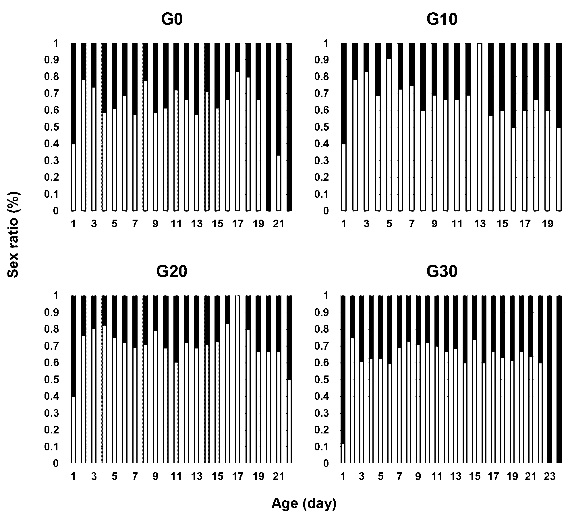 Figure 3 shows how the female predatory mite, E. scutalis, changes the sex ratio of its progeny in response to the female age. The results demonstrate that the predator's age influences the sex ratio in their offspring. In all treatments tested, lifetime sex ratios were consistently female biased. On the first day of oviposition, the sex ratio was male biased in all generations tested, then the percentage of females increased when the age of the predator increased. The three and two last days of oviposition period were male biased in G0 and G30, respectively, while the percentage of males increased in the last day of oviposition in G10 and G20. In other words, during the early and late ages of the oviposition period, the proportion of males produced in this predator increased. Generation does not affect this pattern.