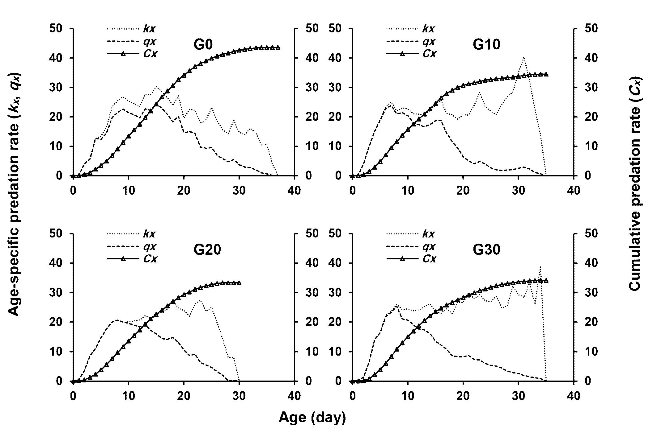 The age-specific consumption rates (kx ), age-specific net consumption rates (qx ), and the cumulative consumption rate (Cx ) of E. scutalis are shown in Figure 4. The value of kx and qx remained the same until the first death occurred, as indicated by Figure 4. The first peaks of these parameters of E. scutalis fed on T. turkestani occurred at the age of 9, 7, 8, and 8 days in G0, G10, G20, and G30, respectively.
