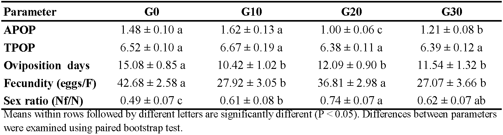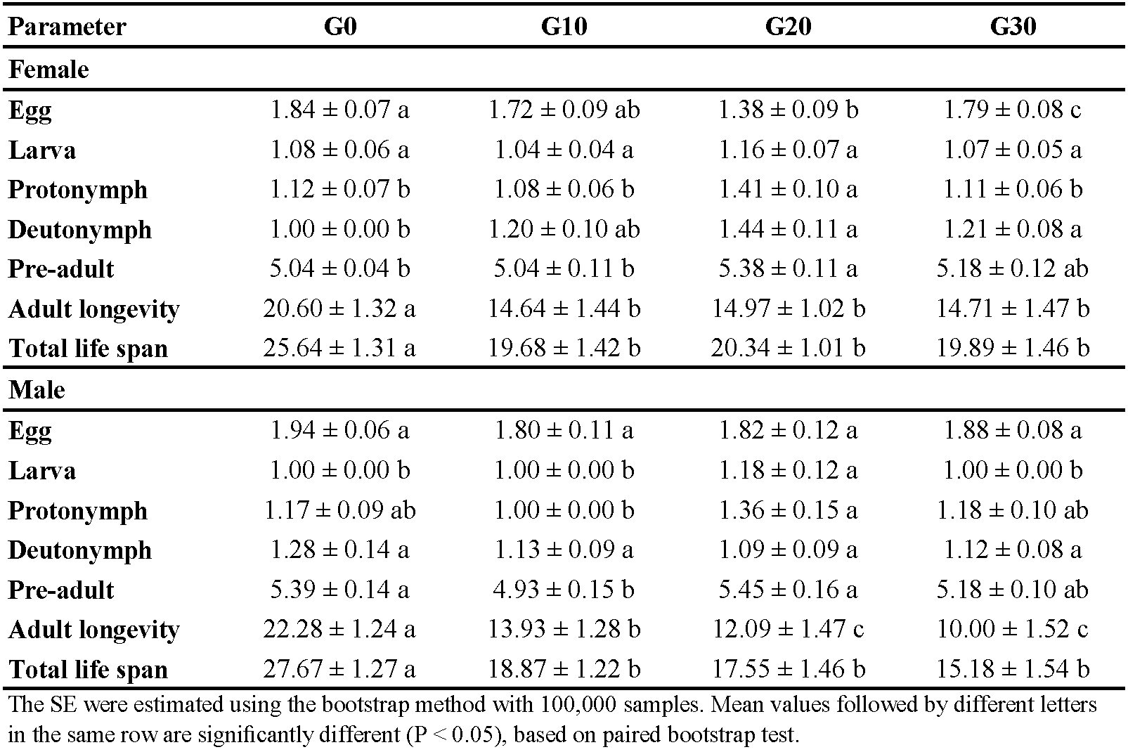 Using TWOSEX-MSChart, the age-stage, two-sex life table method was applied to analyze the life history data of E. scutalis (Chi & Liu 1985; Chi 1988; Chi 2023a). The TWOSEX-MS Chart program was used to estimate age-stage-specific survival rate (sxj ), age-stage-specific fecundity (fxj ), age-specific fecundity (mx ), age-specific survival rate (lx ), and age-specific fecundity (mx ), as well as population growth parameters for each treatment (Chi 2023a). By using this program, the bootstrap method with 100000 re-sampling was used to estimate the means and standard errors of different stage durations, total pre-oviposition period (TPOP), adult pre-oviposition period (APOP), fecundity, oviposition days, and adult longevity, and the life table parameters [intrinsic rate of increase (r), finite rate of increase (λ), gross reproductive rate (GRR), net reproductive rate (R0), and mean generation time (T)] (Chi 2023a). The mean of all parameters was compared between different treatments using the paired bootstrap test.
