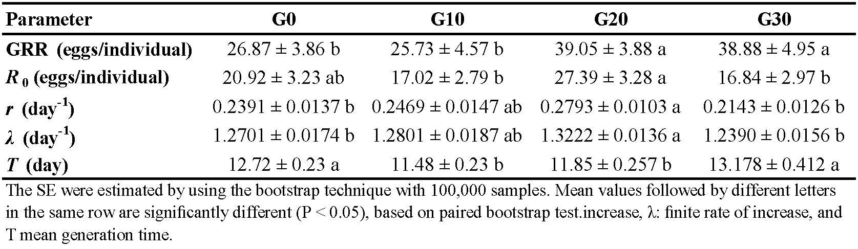 As shown in Table 3, the population growth parameters of E. scutalis were affected by the time of rearing on cattail pollen when switched to T. turkestani (Table 3). The gross reproductive rate (GRR) in the older generations was significantly higher than that in younger generations. The net reproductive rate (R0) of E. scutalis in G20 was not significantly different from that in G0, but the R0 values in both generations were significantly higher than in G10 and G30 (Table 3). The intrinsic rate of increase (r) and finite rate of increase (λ) of E. scutalis were highest in G20 (r= 0.2793 day -1, λ= 1.3222 day -1) but did not differ significantly from those of in G10 (r= 0.2469 day -1, λ= 1.2801 day -1) (Table 3). The generation time (T) in G30 (13.178 days) was longer than those in G10 (11.48 days) and G20 (11.85 days), while there was no significant difference between G30 and G0 (Table 3).