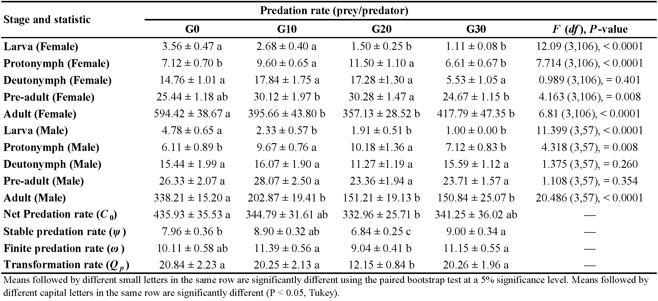 The computer program CONSUME-MS Chart (Chi 2023b) was used to analyze the daily consumption of all individuals. To compute the age-stage predation rate (cxj ), the daily consumption of each individual was taken into account. The mean number of T. turkestani preyed by an individual E. scutalis during its life span (C0), the number of T. turkestani required for the production of an offspring from a E. scutalis (Qp), the entire consumption capacity of a stable population whose maximum value is one (ψ), and the predation potential of E. scutalis population by combining its growth rate (λ), age-stage predation rate (cxj ), and stable age-stage structure (axj ) (ω) were computed based on Chi and Yang (2003). The bootstrap resampling method was used to estimate the variations and standard errors of predation parameters. Different stages' predation rates were compared using the Tukey test (P >0.05) (SPSS 21.0). Using the TWOSEX-MS Chart program, the comparison of C0, Qp, ψ, and ω was made based on the paired bootstrap test (with 100,000 resampling) (Chi 2023a).