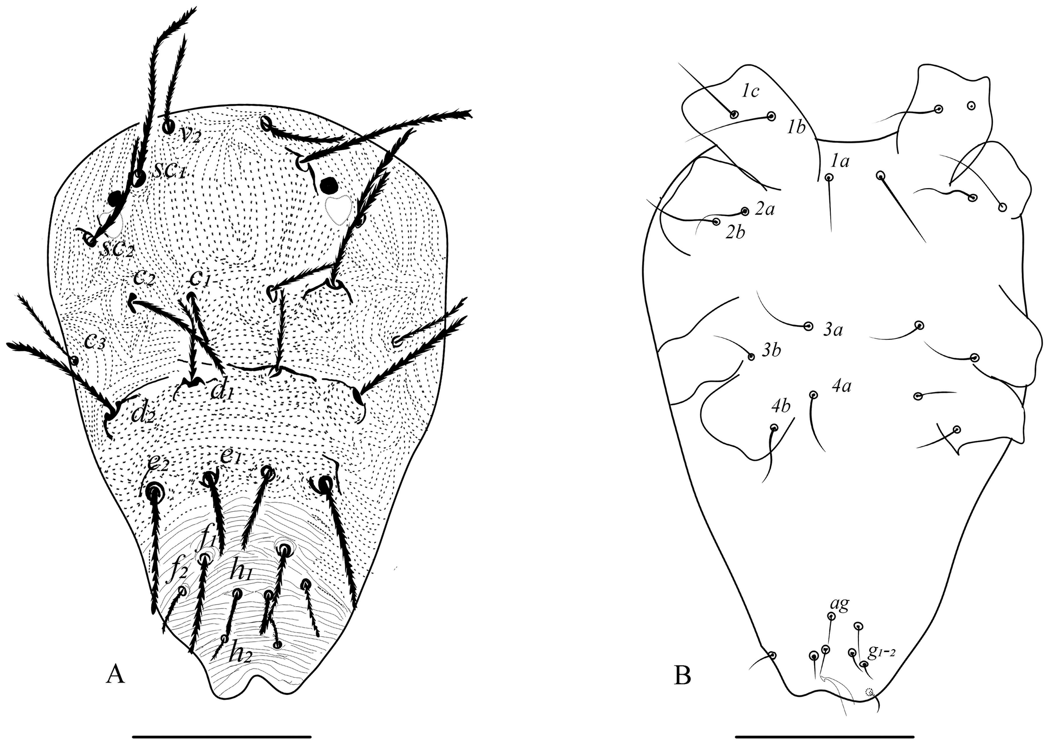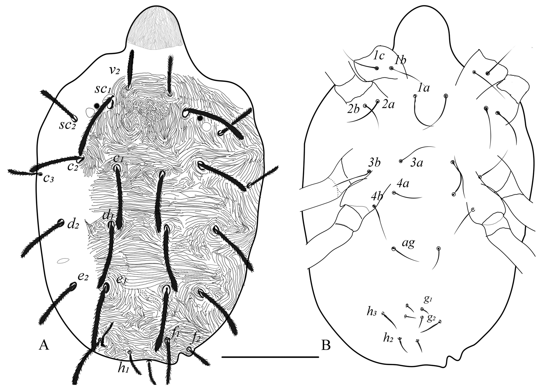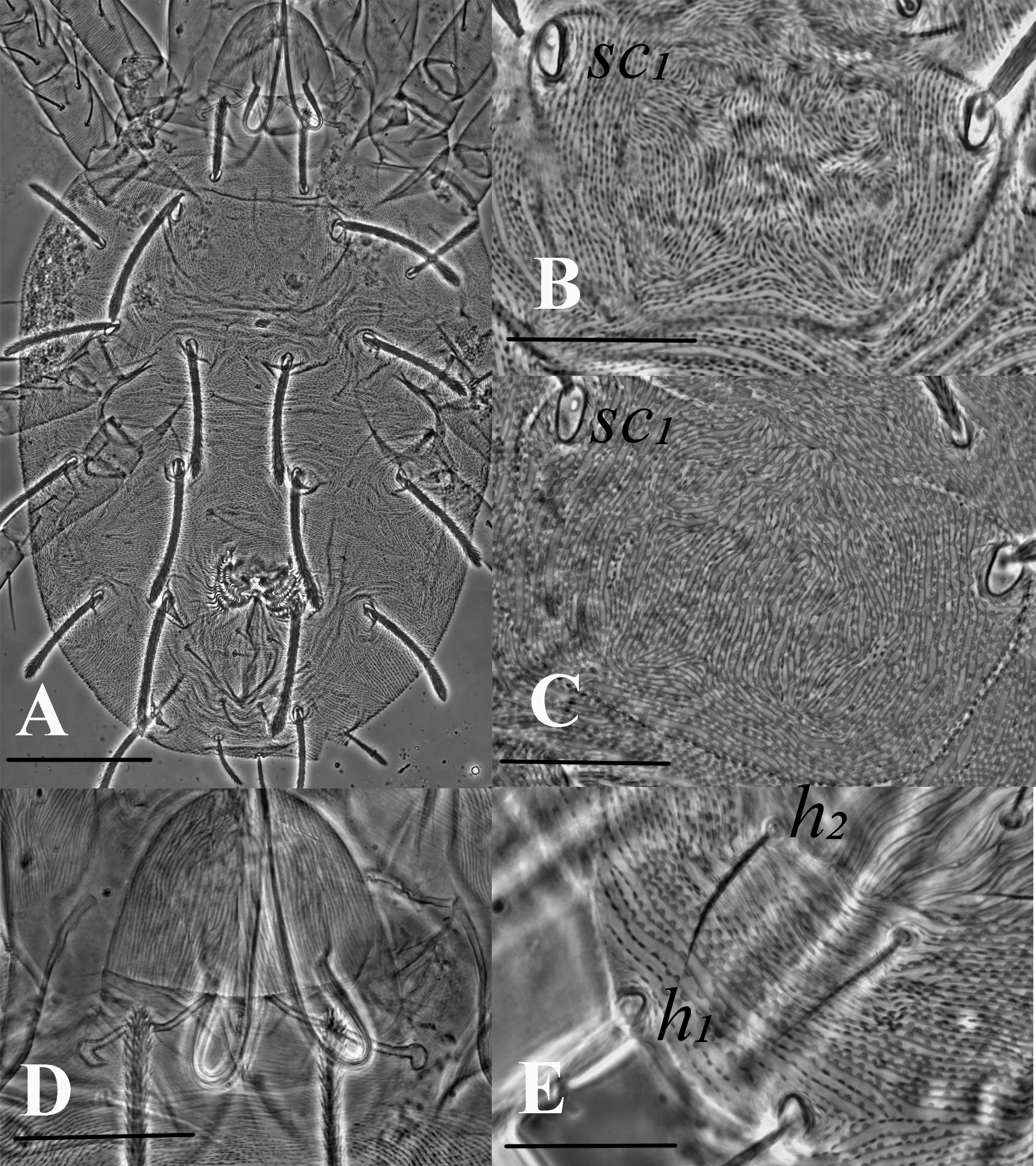Dorsum (Figs. 4, 5) — Length of idiosoma 230 (220–235) (excluding gnathosoma), width 147 (138–154) at c3 setae. Prodorsum with 3 pairs (v2, sc1, sc2) of setae. Striae between sc1–c1 forming a U-shaped pattern (figs. 4A, 5A). All dorsal setae serrate, tapering, sc1, c2, d2 and e2 the longest. Setal lengths: v2 35 (30-40) sc1 65 (63–69), sc2 41 (38–45), c1 29 (25–37), c2 52 (45–65), c3 35 (30-40), d1 30 (25–33), d2 57 (46–66), e1 29 (27–35), e2 54 (43–65), f1 33 (30-37), f2 19 (19), h1 16 (14–18). Distances between setal bases: v2–v2 34 (32–36), sc1–sc1 50 (35–60), sc2–sc2 98 (95–100), c1–c1 26 (25–28), c2–c2 75 (67–80), c3–c3 125 (115–130), d1–d1 31 (27–35), d2–d2 92 (86–95), e1–e1 19 (18–20), e2–e2 64 (60–66), f1–f1 29 (27–31), f2–f2 43 (42–45), h1–h1 10 (9–10), h2–h2 17, h3–h3 42 (40–45). Setae h1–h3 on dorsal side.