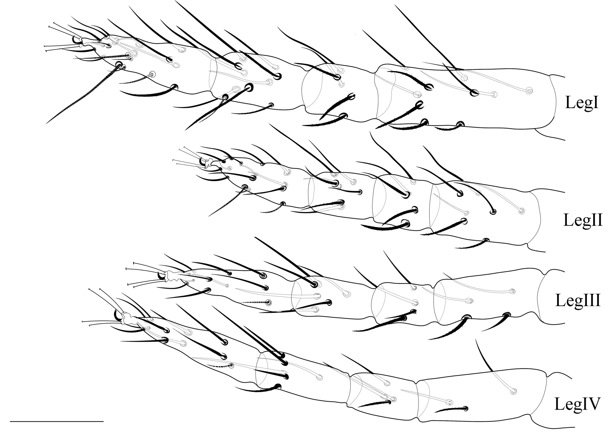 Legs (Figs. 3, 7E) — Length of legs I−IV (femur to the bent portion of empodium): 244 (230-260), 174 (160-181), 190 (175–212), 210 (201–223), respectively; Leg I with four tactile setae and one solenidion proximal to proximal duplex setae. Tibia with 9 tactile setae and one solenidion. Empodium of leg I–IV split near the middle into three proximal hairs (fig. 7E). Leg setal count as follows: coxae 2–2–1–1; trochanters 1–1–1–1; femurs 10–7–4–3; genua 5–5–4–4; tibiae 9(1sol)–7–6–6; tarsi 11(1sol+2eup+2dup)–10(1sol+2eup+1dup)–8(1sol+2eup)–8(1sol+2eup).