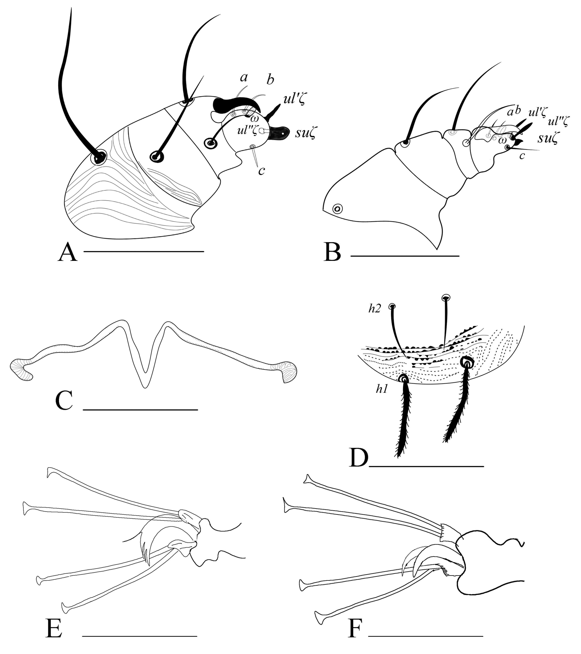 Gnathosoma (Fig. 7B) — All tactile setae on palp slender. Subcapitular setae m smooth, setaceous. Palptarsus with three tactile setae (a, b, c), with a small spinneret, suζ 1 (0.6–1), width 1, two eupathidia ul′ζ 5 (4–6), ul″ζ 4 (4–5) and one solenidion (ω) 3 (3–5); solenidion slightly thinner and longer than spinneret.