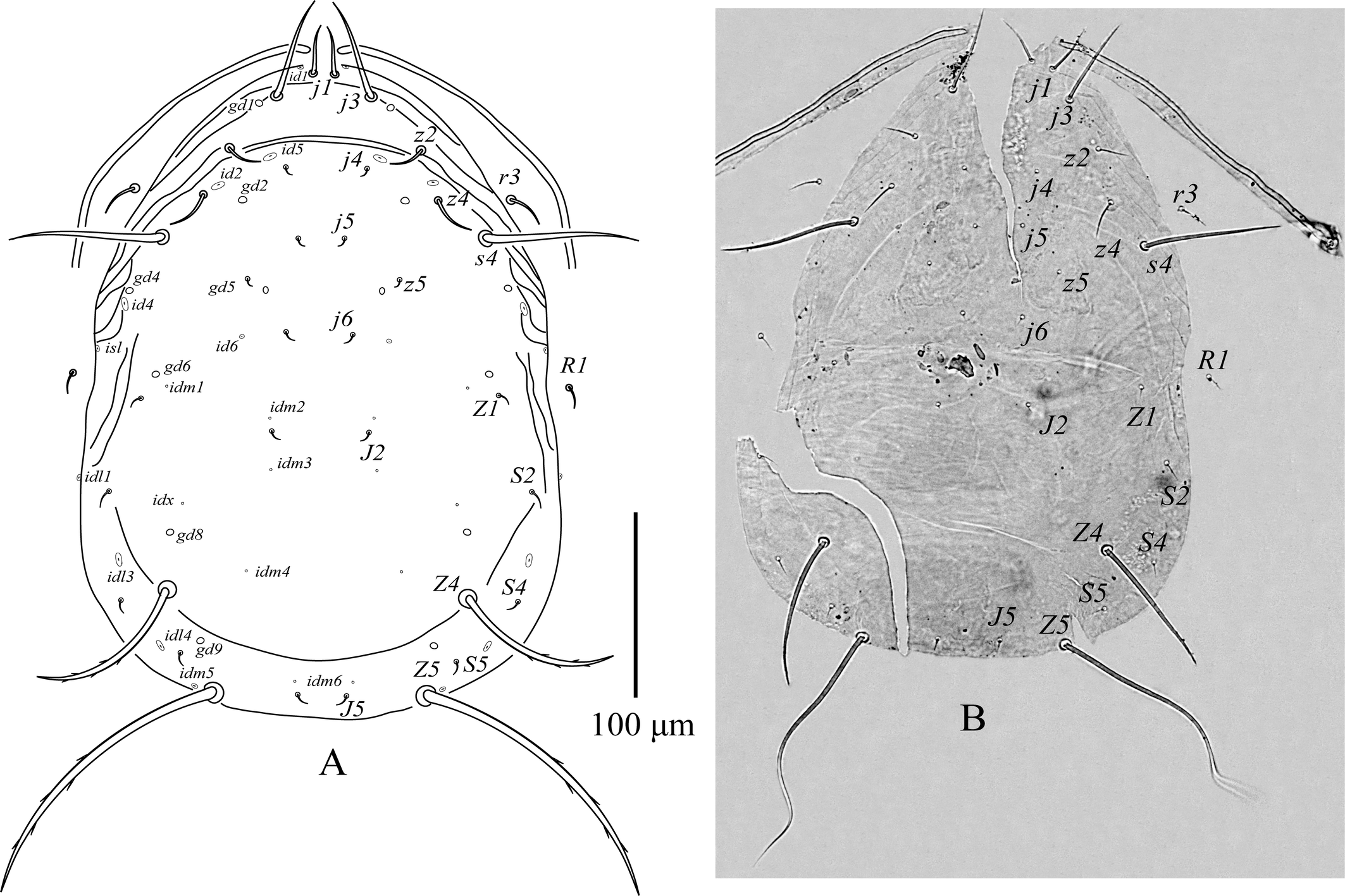 Dorsum –(Figure 1A, B). Dorsal shield mostly smooth with few striations anterolaterally from setae j3 to R1, 330–349 long and 215–231 wide at the level of s4; with seven pairs of solenostomes (gd1, gd2, gd4, gd5, gd6, gd8, gd9) and 16 pairs of poroids (id1, id2, id4, id5, id6, idm1, idm2, idm3, idm4, idm5, idm6, isl, idl1, idl3, idl4, idx). Setae length: j1 25–28, j3 45–56, j4 5–7, j5 6–7, j6 7–8, J2 7–8, J5 7–8, z2 19–22, z4 21–26, z5 4–5, Z1 8–9, Z4 82–90, Z5 155–175, s4 75–84, S2 12–13, S4 8–9, S5 8 7–8, r3 21–23, R1 11–13. All setae smooth, except for Z4 and Z5, finely serrate near tips. Peritreme extending to the level of j1.